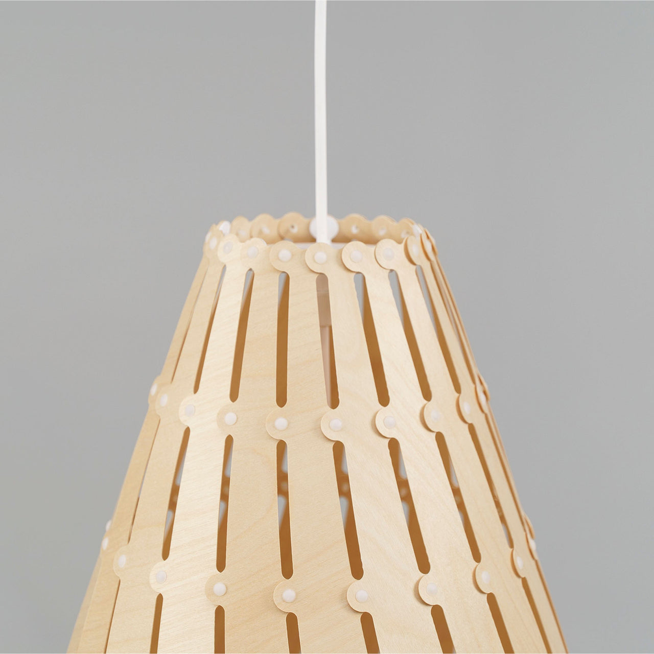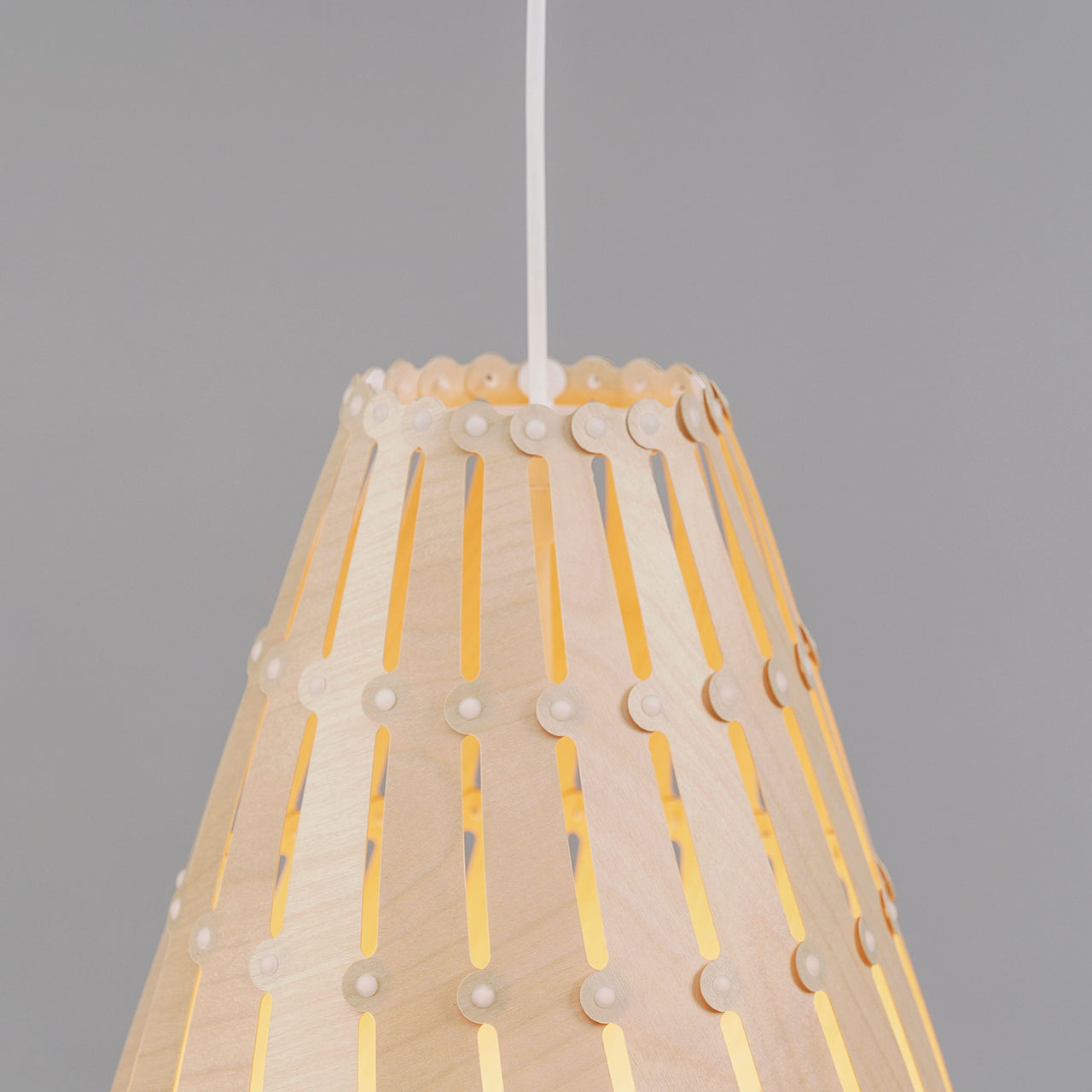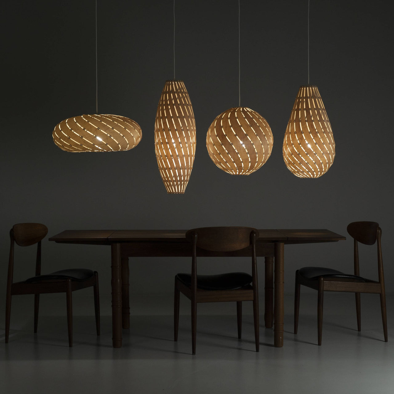 Longtime environmentalist designer David Trubridge adds a teardrop shade to his Ebb pendant series, with the characteristic swirl pattern inspired by ocean ripples. Now reworked in more sustainable ultra-thin Finnish birch plywood and held together with nylon clips, Drop has a lantern-like glow that also complements the natural woodgrain. It's even shipped in eco-friendly packaging as an easily assembled "kitset," complete with a cord-bulb holder and a ceiling canopy.