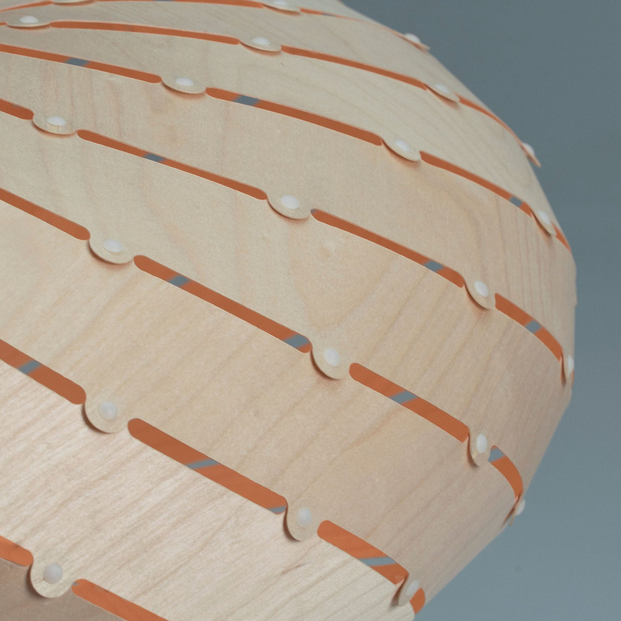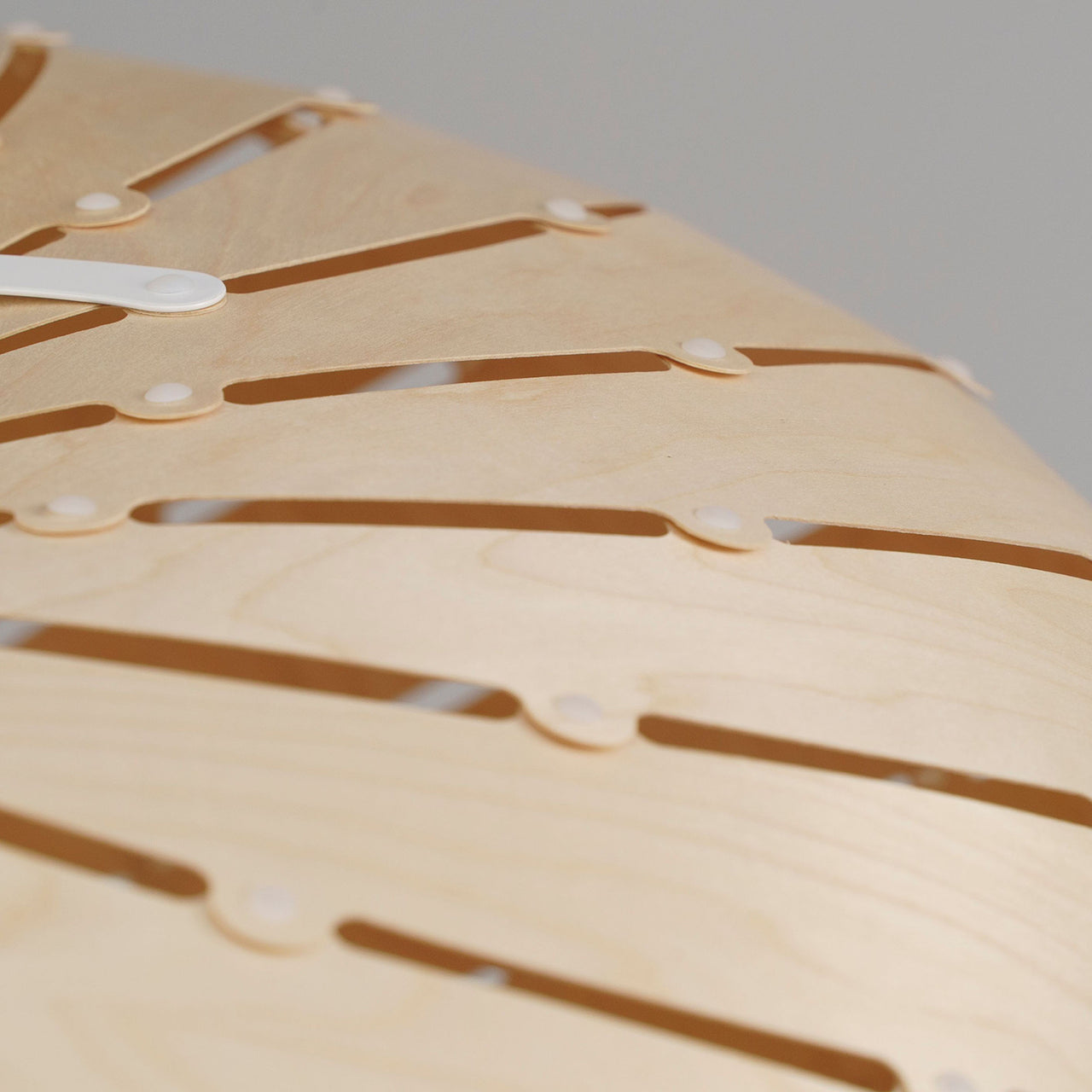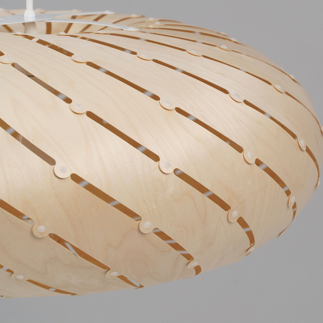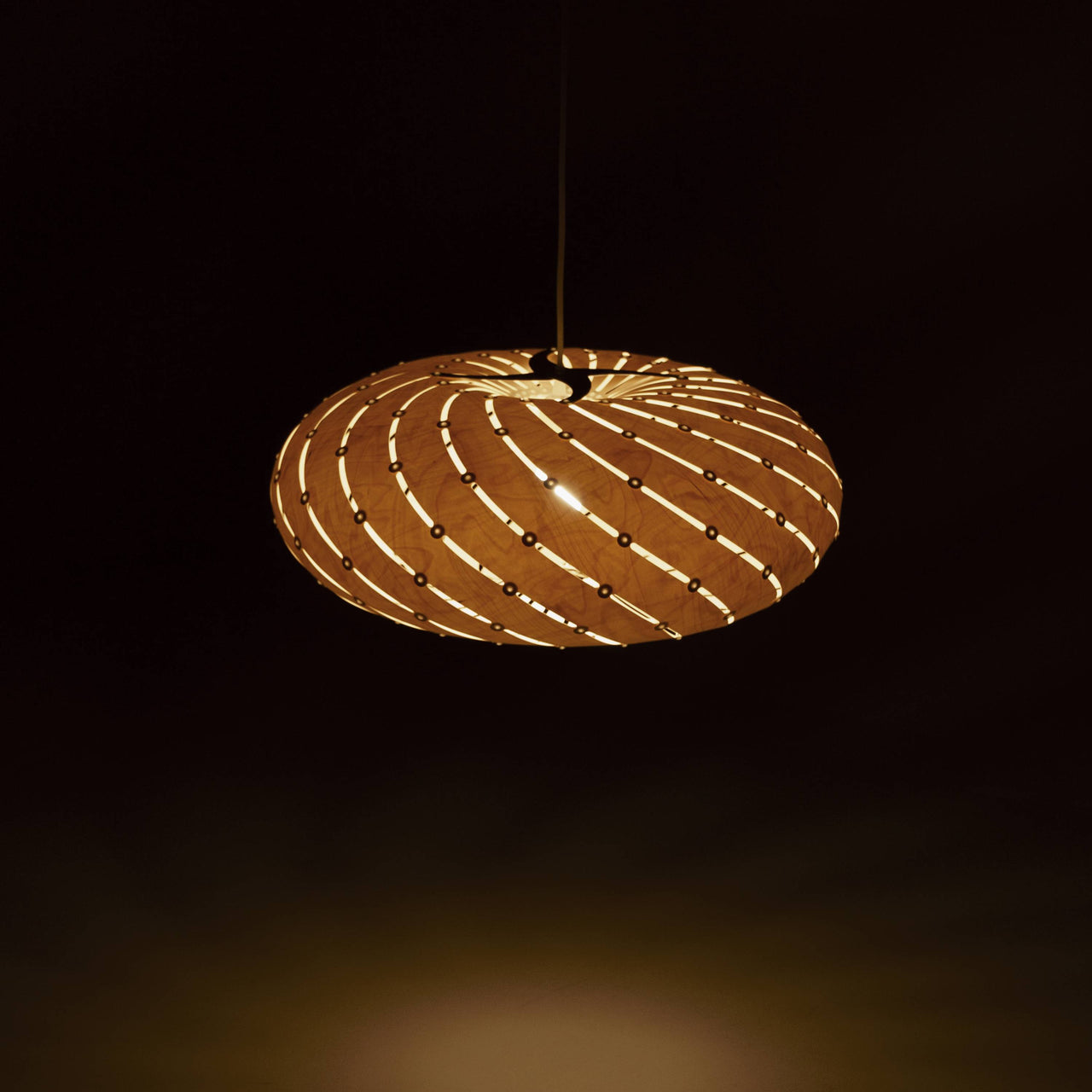 Swell adds a rounded disc shape to David Trubridge's pendant series Ebb, with its wavy swirl suggested by ripples in the water. Newly redesigned in more sustainable ultra-thin Finnish birch plywood and held together with nylon clips, it emits a glowing lantern effect which also highlights the natural woodgrain. Shipped as an unassembled flat "kitset" in environmentally friendly packaging, the shade comes complete with a cord-bulb holder and a ceiling canopy.