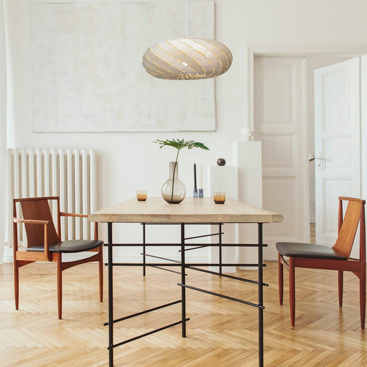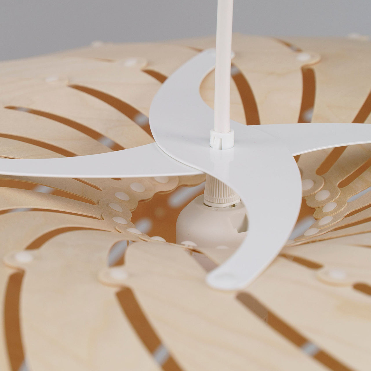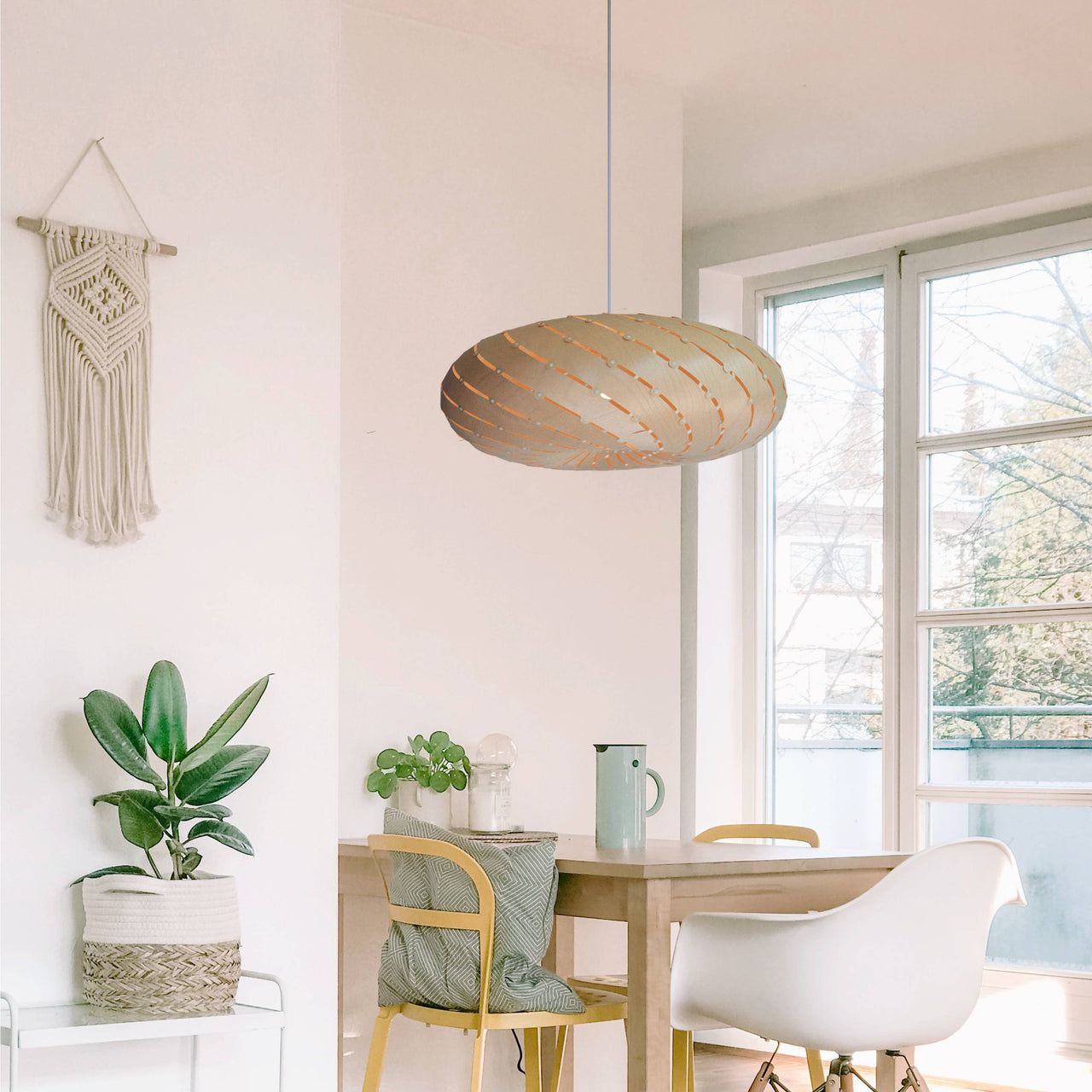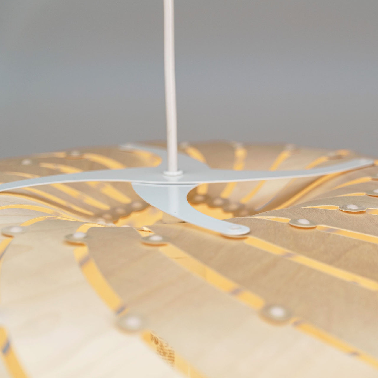 Swell adds a rounded disc shape to David Trubridge's pendant series Ebb, with its wavy swirl suggested by ripples in the water. Newly redesigned in more sustainable ultra-thin Finnish birch plywood and held together with nylon clips, it emits a glowing lantern effect which also highlights the natural woodgrain. Shipped as an unassembled flat "kitset" in environmentally friendly packaging, the shade comes complete with a cord-bulb holder and a ceiling canopy.