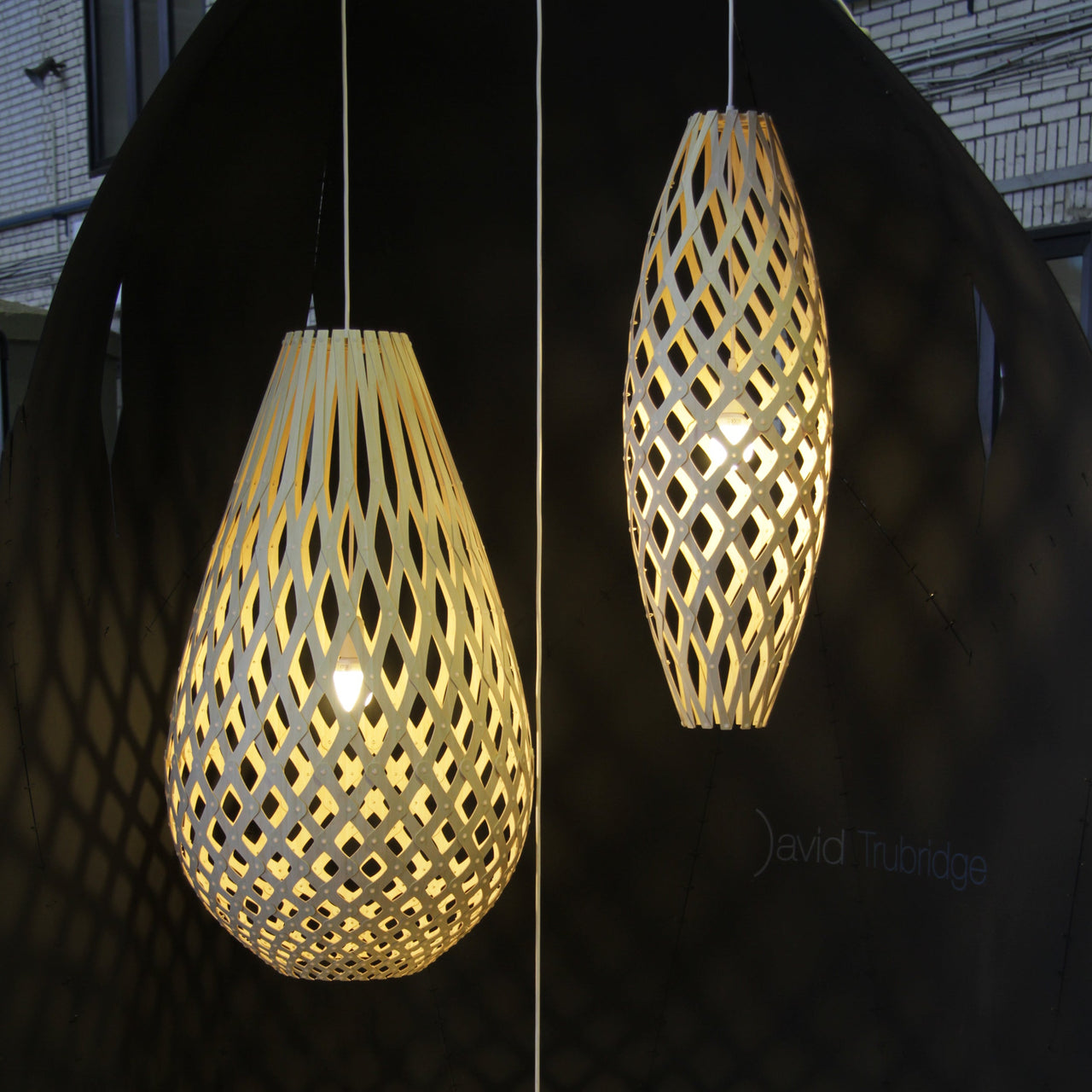 The first lamp New Zealand designer David Trubridge ever made in 1995 was shaped like a hinaki, the eel traps the Maori make from woven vines. The elongated form of the Hinaki Pendant Light equally captures attention in a foyer or room. A passion for the environment and earth drives the construction of all David's work, primarily made of renewable bamboo and flat-packed to reduce freighting and packaging resources and the identical pieces make home assembly a snap, literally. Endlessly adaptable, the light is available in 2 sizes and 9 stock colors (custom colors upon request) in natural or painted bamboo with nylon clip fasteners. The celebrated designing craftsman ended up in his adopted home of New Zealand after he, his wife and their two sons sold everything and set off on a yacht for a world adventure. It culminated in 1985 when they decided to remain there. While an artist-in-residence, he built a house and suddenly found himself with further commissions. Before realizing homes, lamps and furniture, David left Newcastle University in 1972 with a degree in Naval architecture. His work has appeared in countless museums, including the Victoria & Albert and the Pompidou Centre. That barely scratches the surface of his fascinating story and work ethos.
