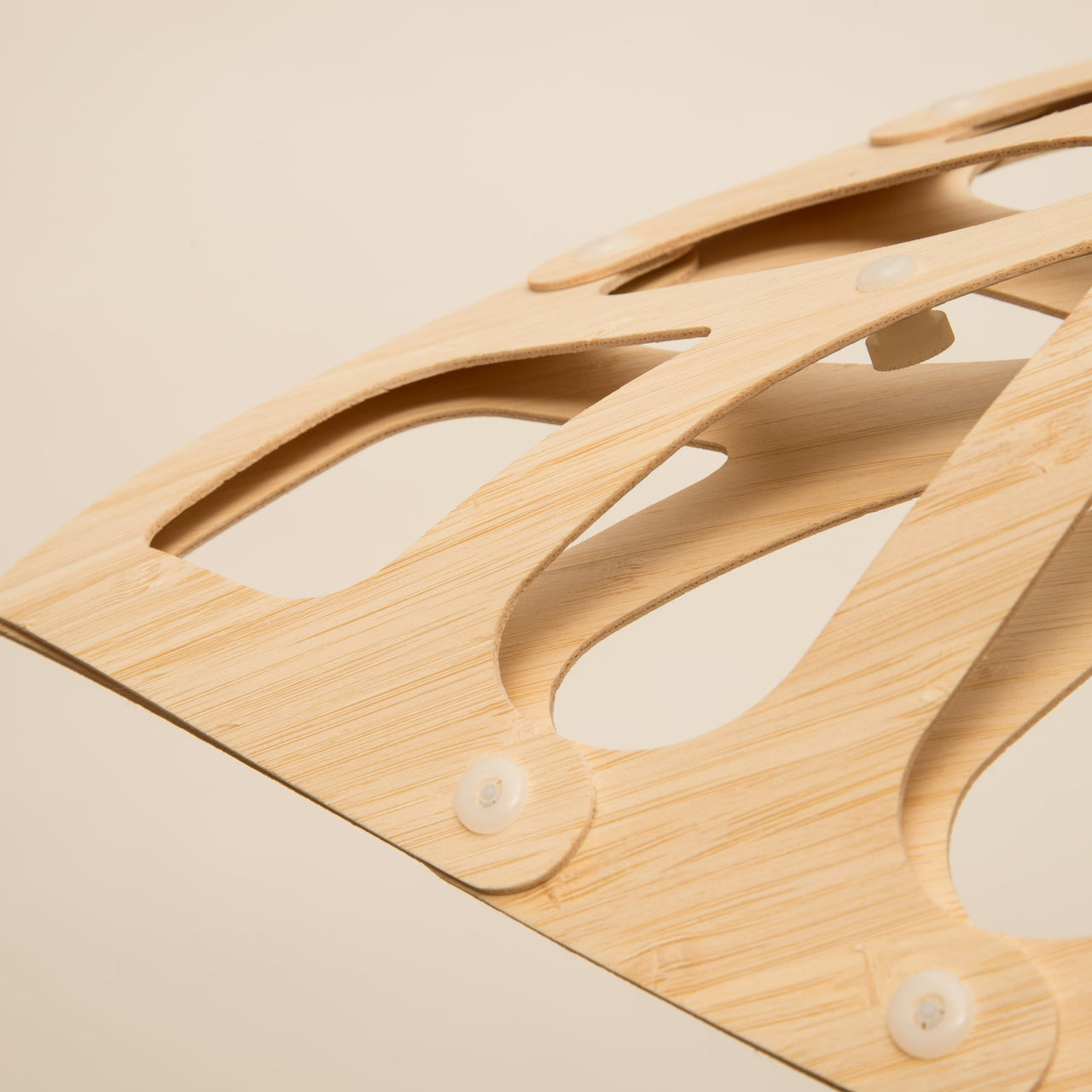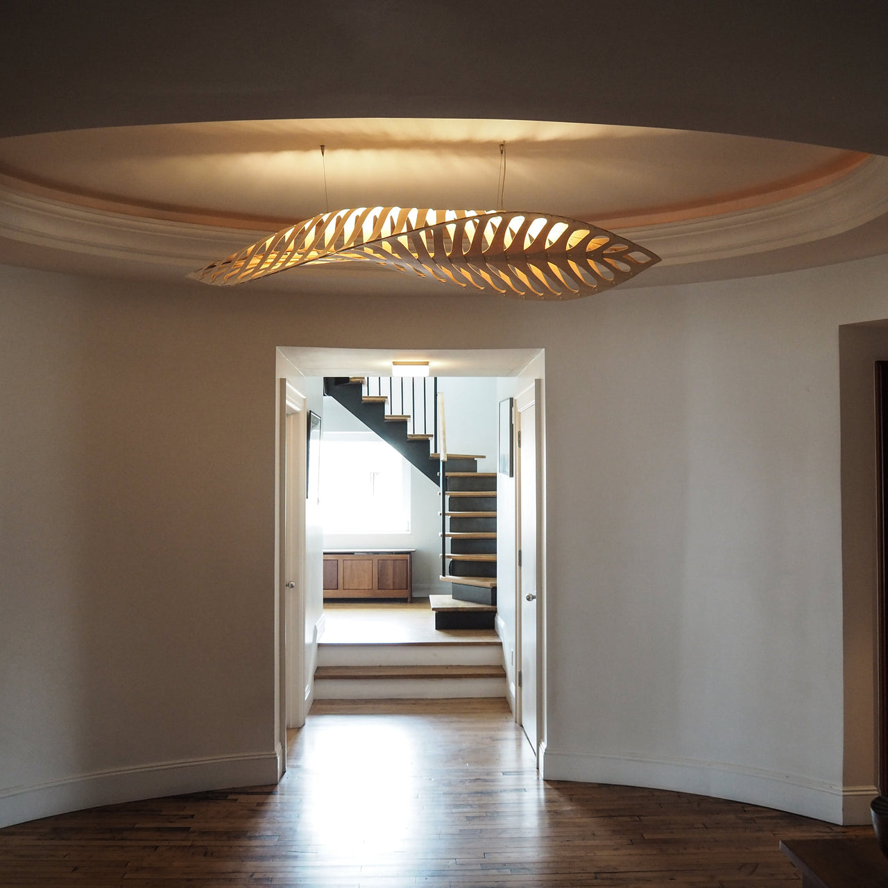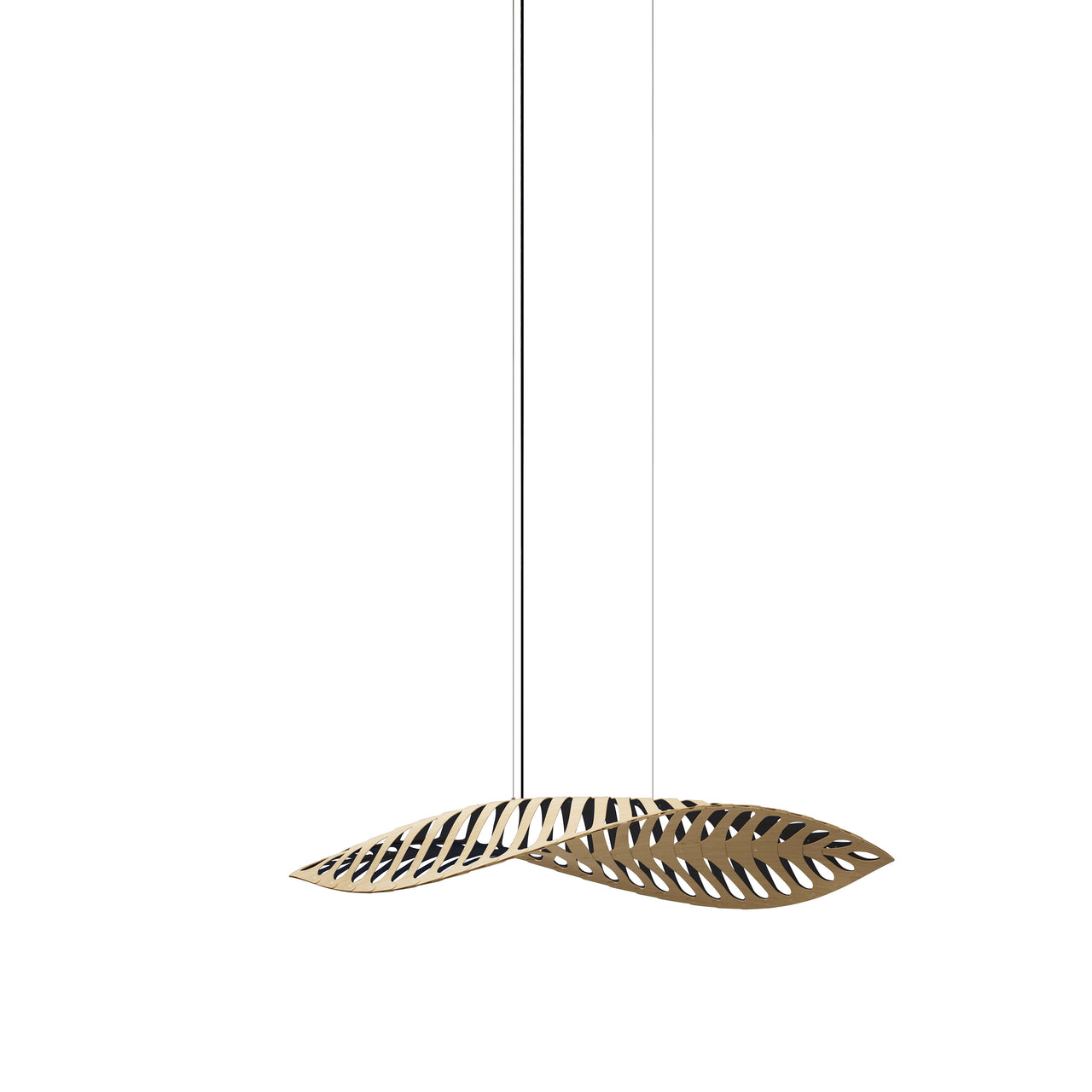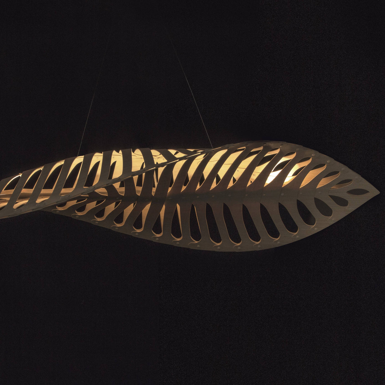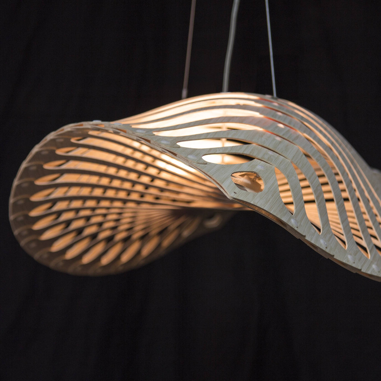 For his magnificent feature light Navicula, designer and New Zealand-based outdoorsman David Trubridge went rolling in the deep, at least metaphorically. The layered shape was Inspired by microscopic diatoms, a strain of algae, that float around in the oceans. Thin pieces of bamboo plywood curve and flow, a marvel of computer-assisted woodcutting. Lit from within by a row of LED pinpoint lights, Navicula casts magical patterns in its wake. Flat-packed for eco-friendly shipping and a snap to assemble with furnished nylon clips.