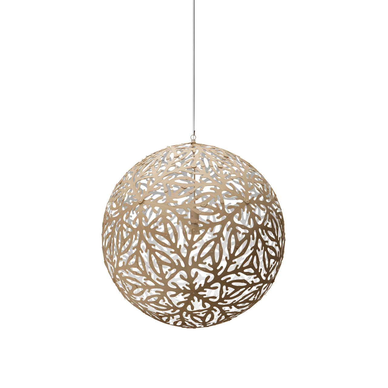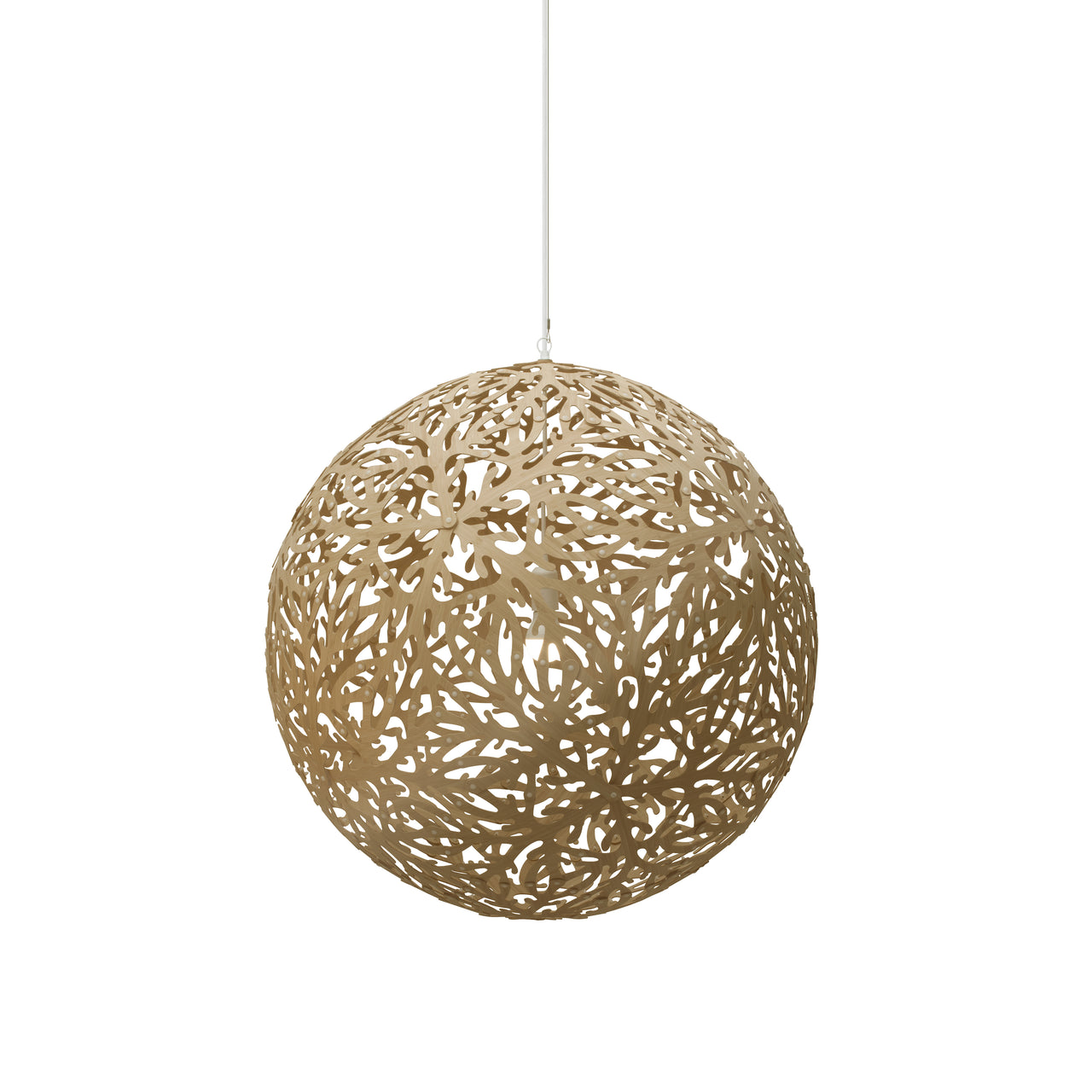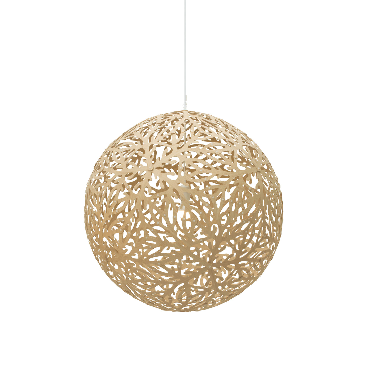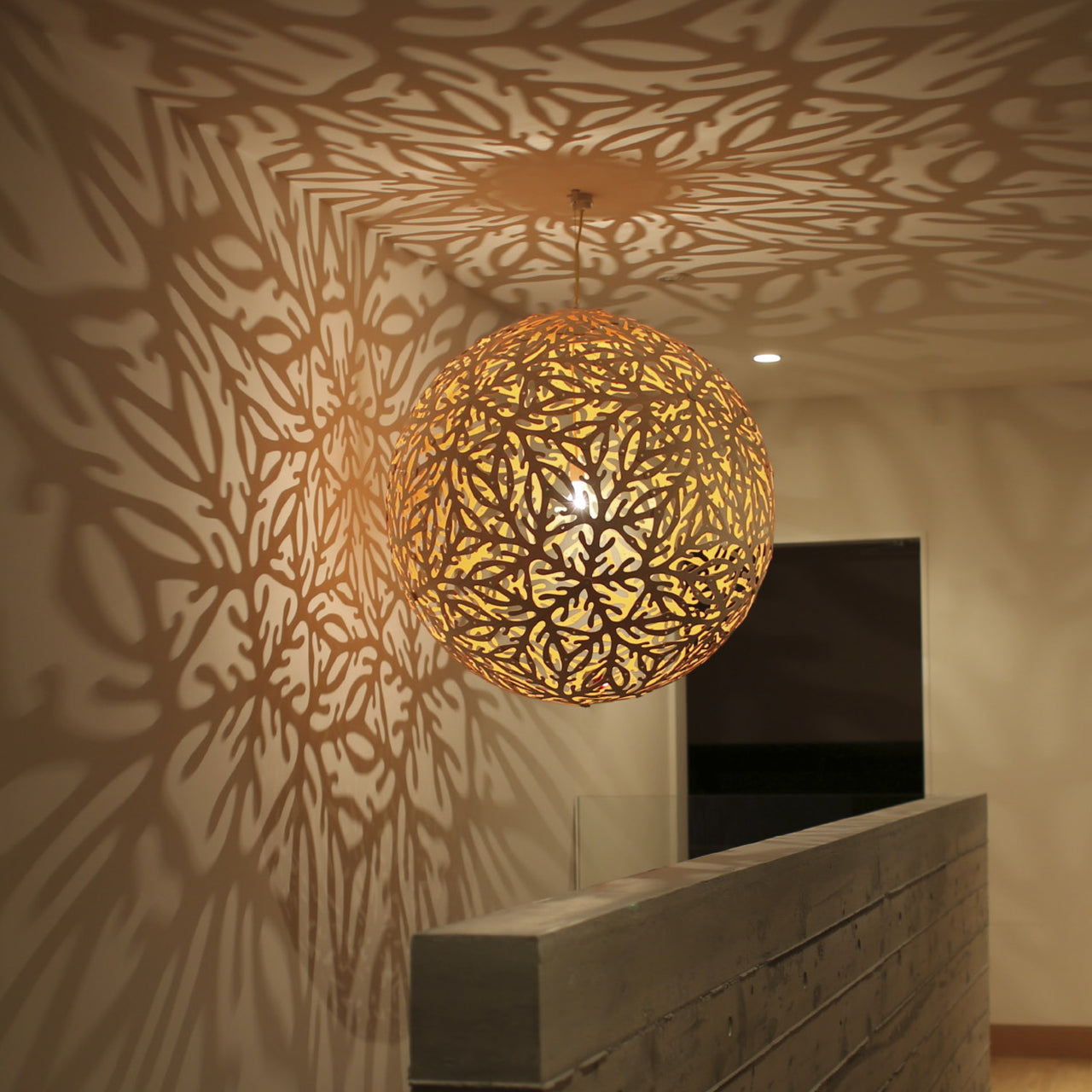 With the Sola Pendant Light, designer David Trubridge ruminates on Icarus, the Greek myth about the boy who flew too close to the sun. Echoing the heat that melted the lad's wings, the shade's intricate pattern looks much like flares that form and curl on the solar surface. In sustainably sourced bamboo plywood in a natural finish or natural with an orange interior to heighten the fiery effect. First acclaimed at a Milan design fair installation, along with David's sculptural Wing light (also at A+R), and subsequently acquired by the Pompidou Centre in Paris for its permanent collection.
