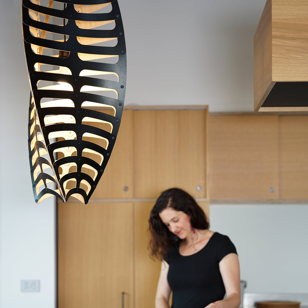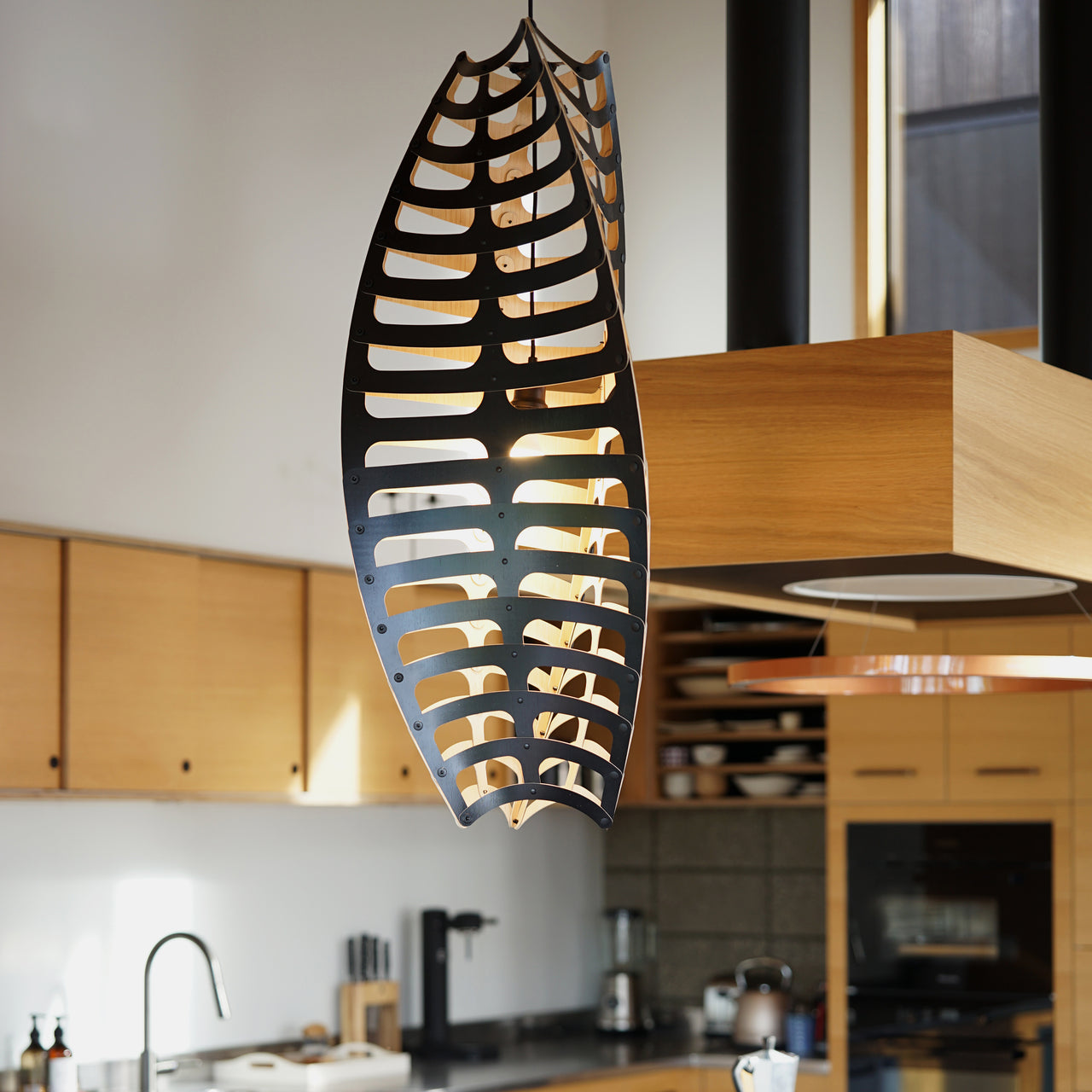 Toru’s vertical model makes for an especially stunning view of the mesmerizing twist of its unique triple-sided shape, appropriately named after the Te Reo Māori word for "3." Inspired by the natural beauty of microscopic diatoms, David Trubridge’s pendant adds a sculptural note in a range of colored bamboo choices while emitting beautiful shadow patterns.