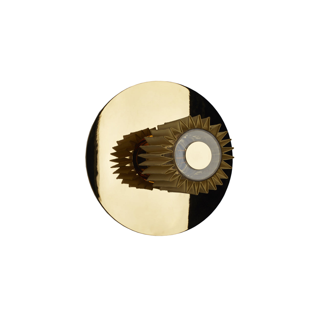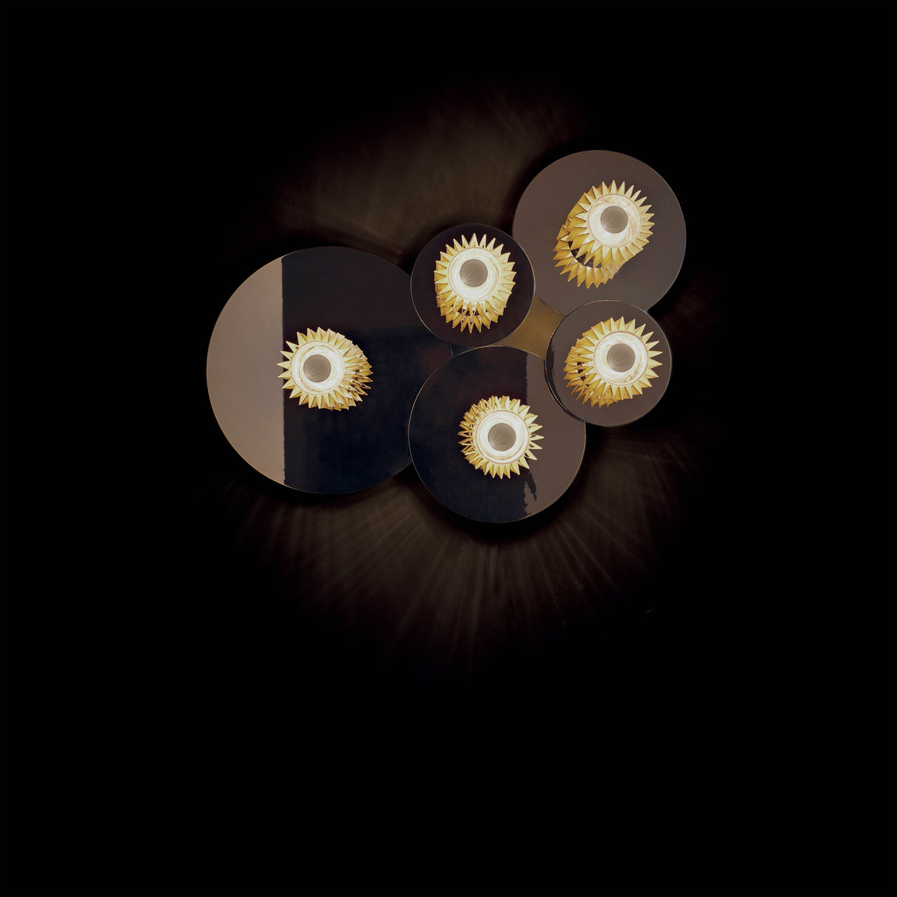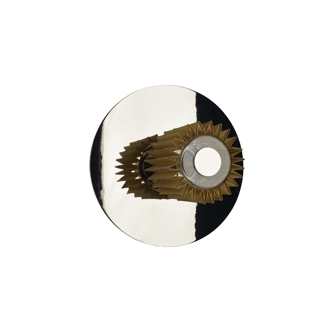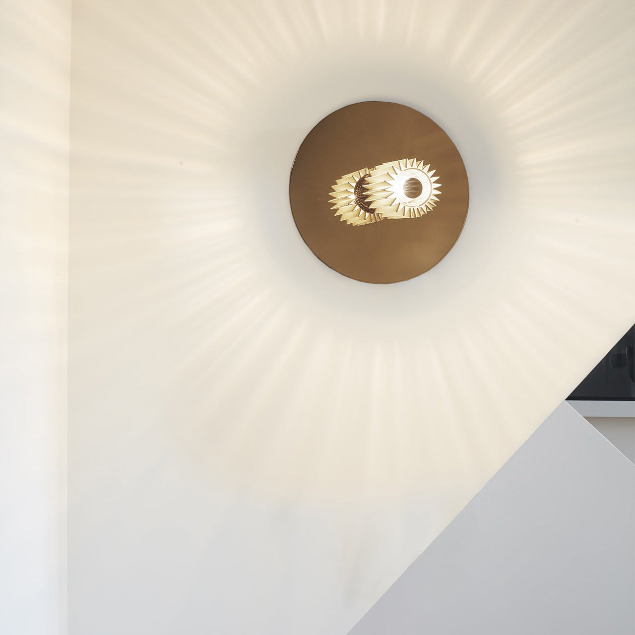 To mount on the wall or ceiling, In The Sun gleams with royal hues of silver and gold in an homage to France's Louis XIV, the 17th century Sun King. Architect-designers Dominique Perrault and Gaëlle Lauriot-Prévost configure a metal-disc backplate to reflect the warm glow from the starburst metal mesh diffuser for mood-setting atmosphere. With 3 available diameters, the light is striking on its own or perfect for displaying in assorted combinations of sizes and the varied metallic finishes.