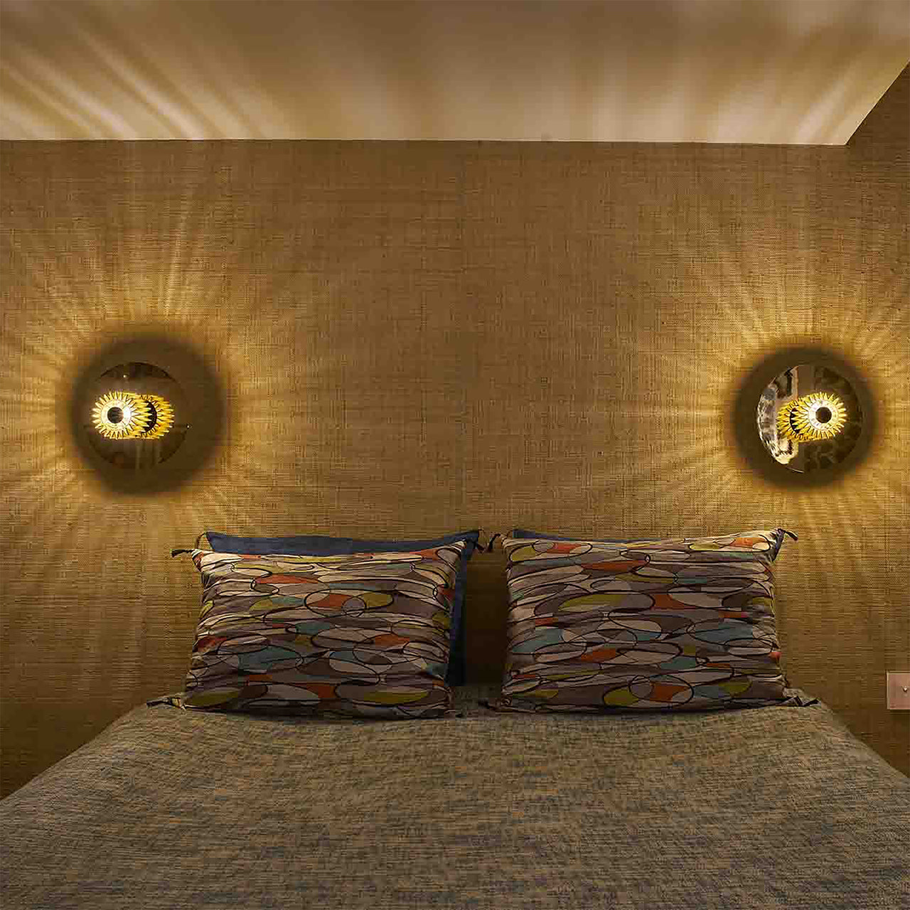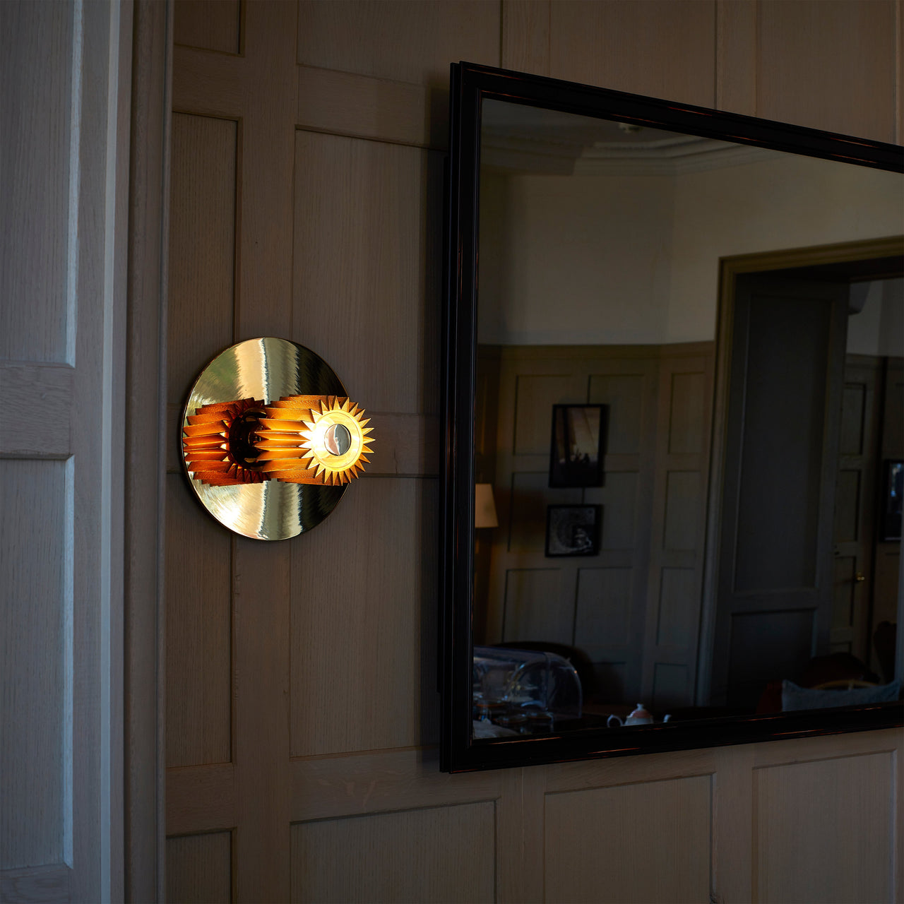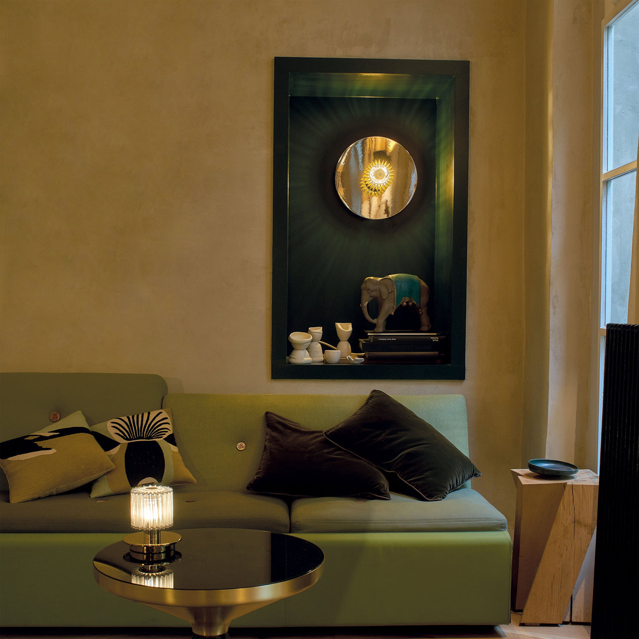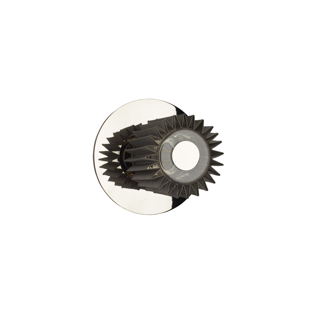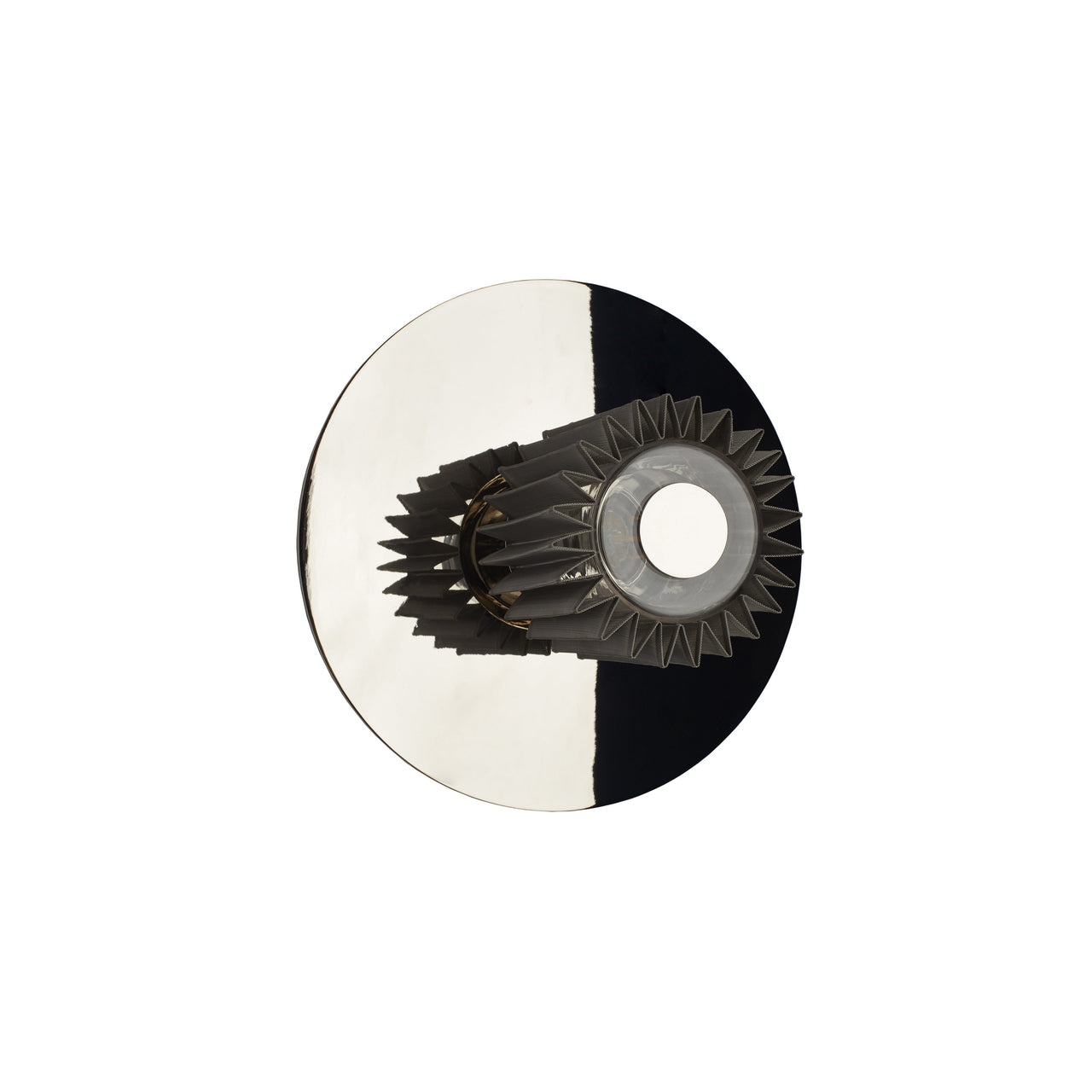 To mount on the wall or ceiling, In The Sun gleams with royal hues of silver and gold in an homage to France's Louis XIV, the 17th century Sun King. Architect-designers Dominique Perrault and Gaëlle Lauriot-Prévost configure a metal-disc backplate to reflect the warm glow from the starburst metal mesh diffuser for mood-setting atmosphere. With 3 available diameters, the light is striking on its own or perfect for displaying in assorted combinations of sizes and the varied metallic finishes.