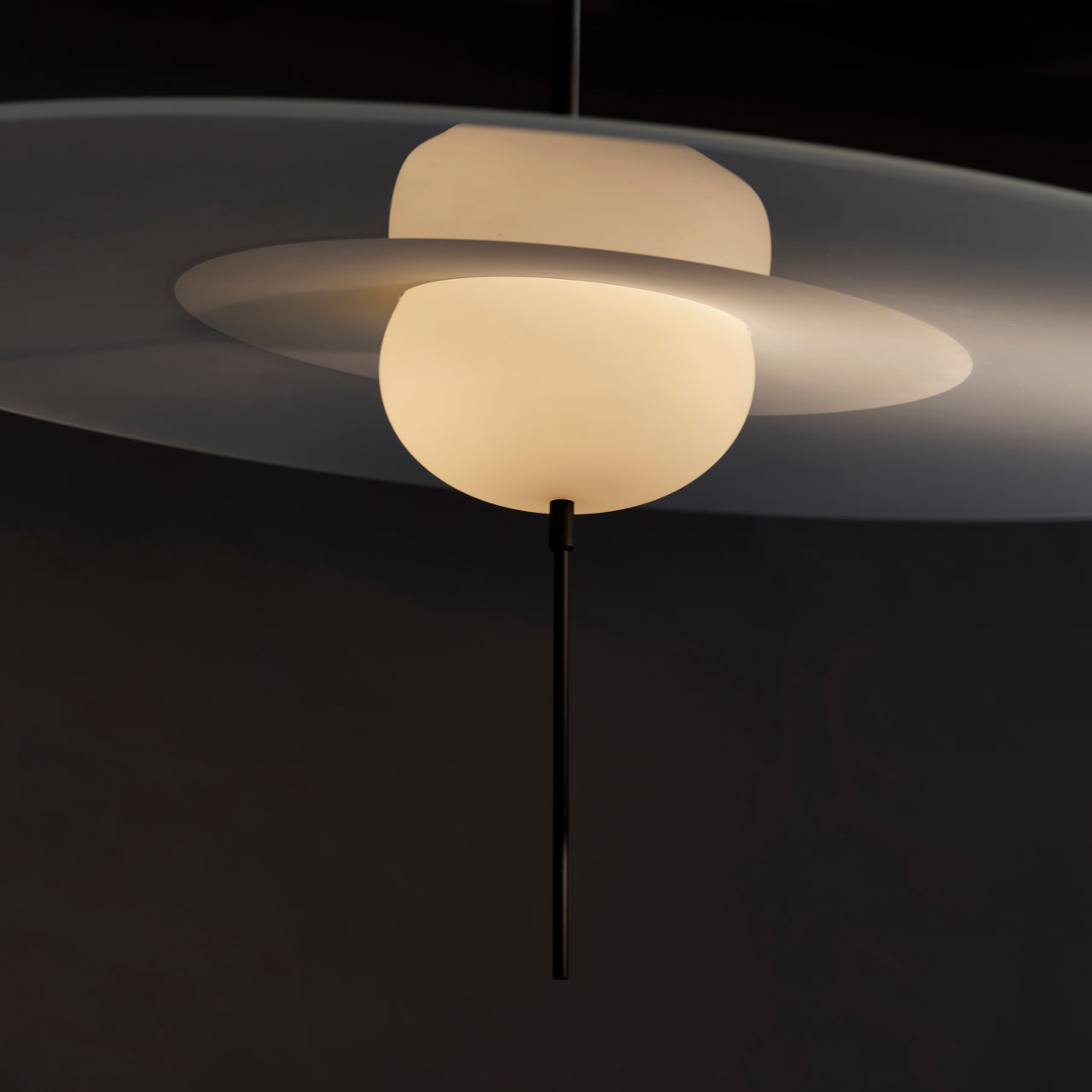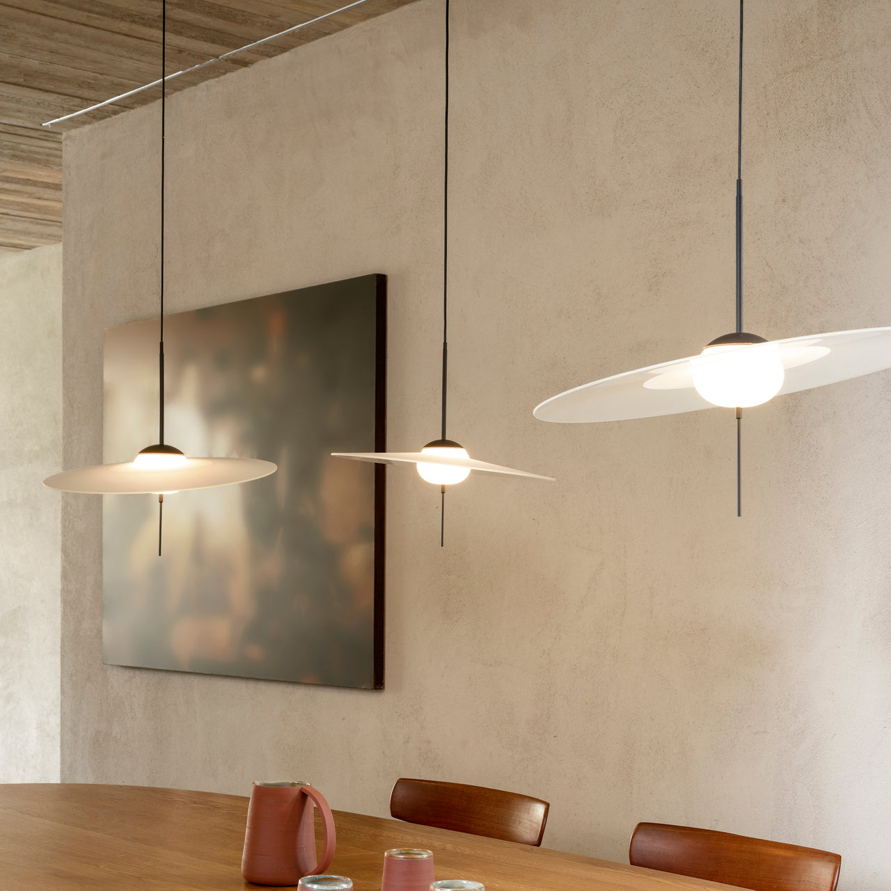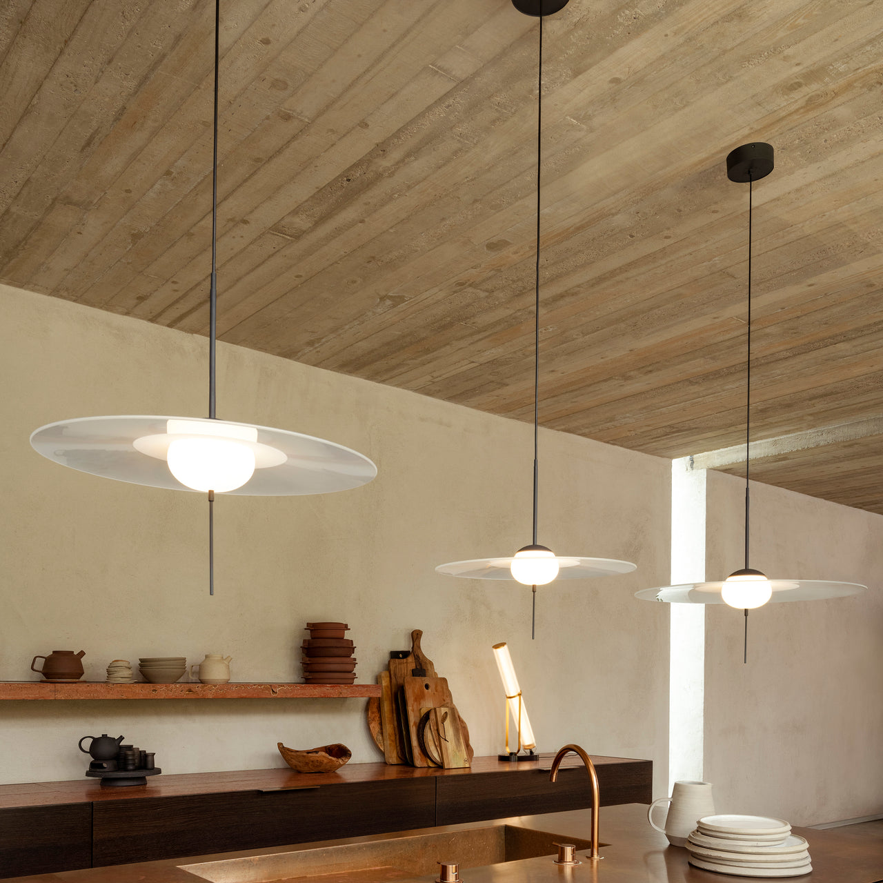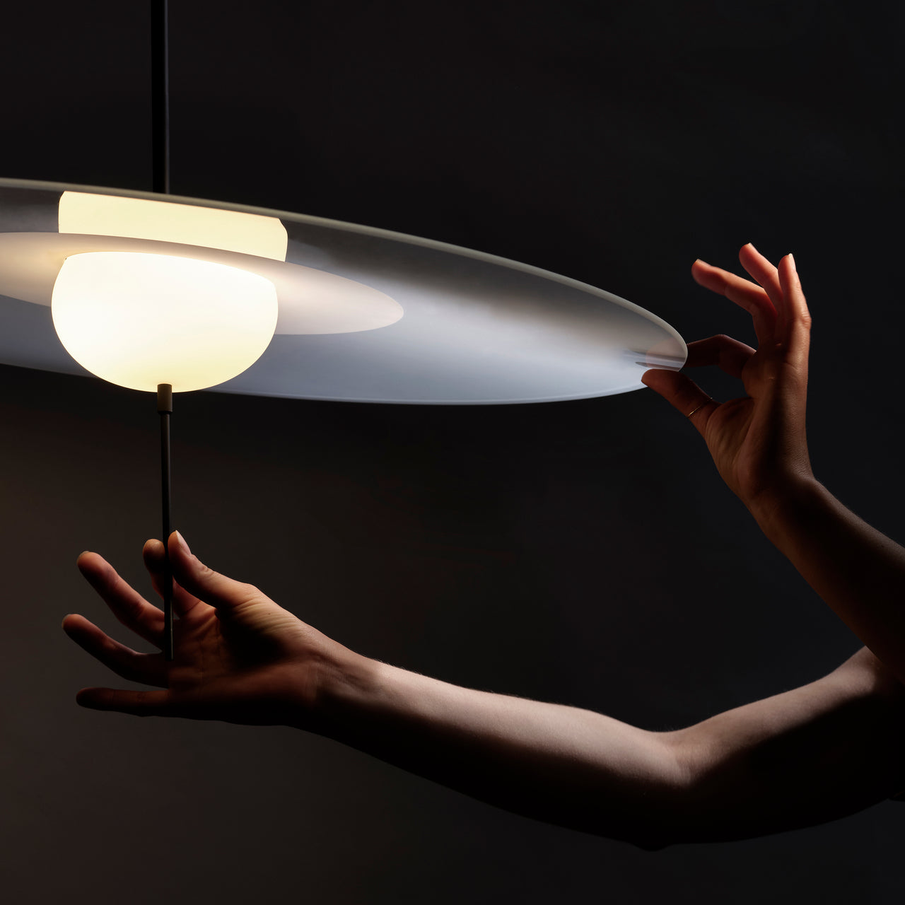 Round and nurturing like a warming sun, Mono lies within the self-effacing Scandinavian design tradition while adding an inviting interactive element. The pendant alights via a fine wire that lends it a floating quality while an extending rod at the base allows for the intuitive touch control of the illumination. Designers Studio Vantot call this the "magic stick" — and the light from an integrated LED filters through the globe and disc shape evenly and glare-free.