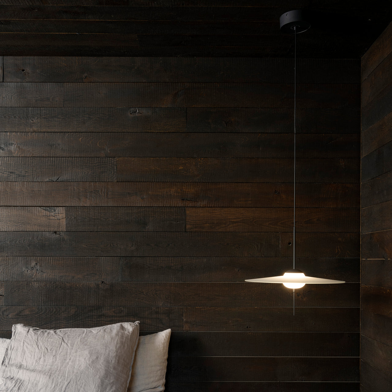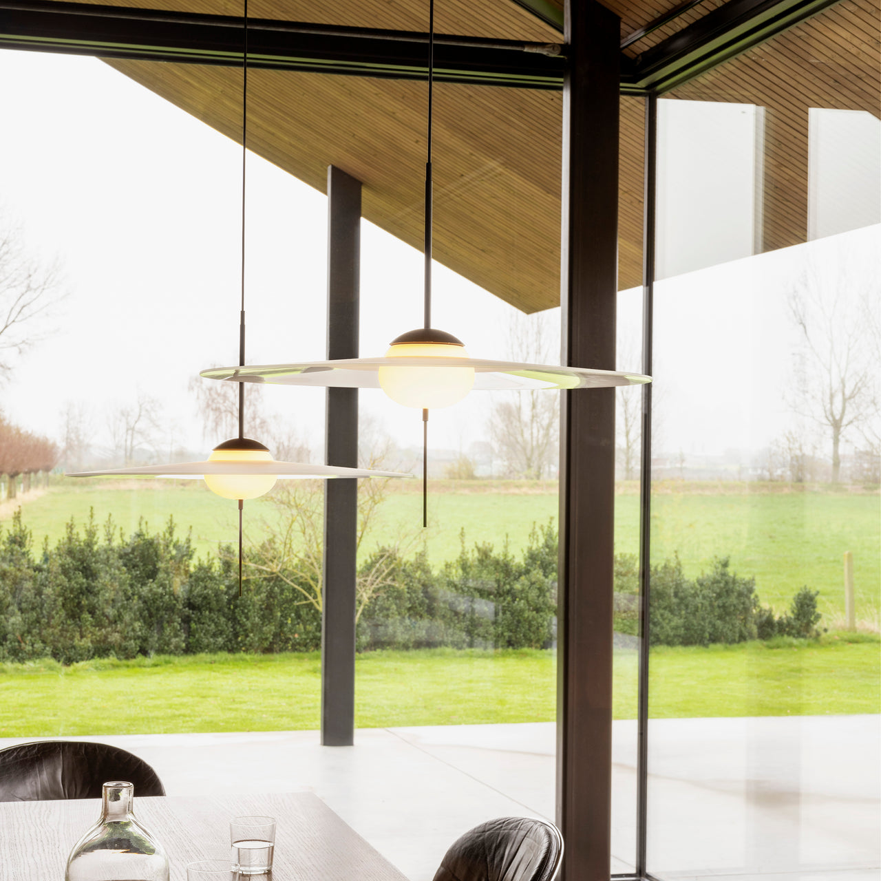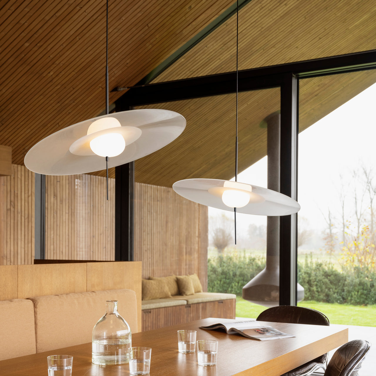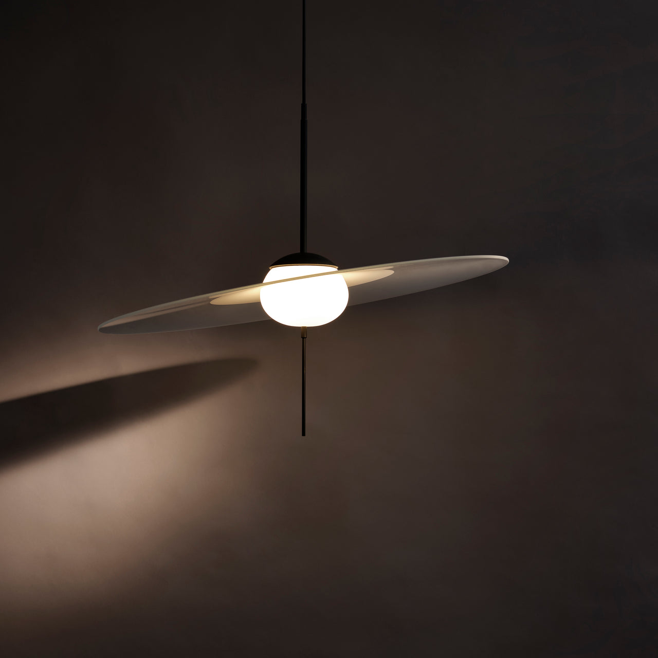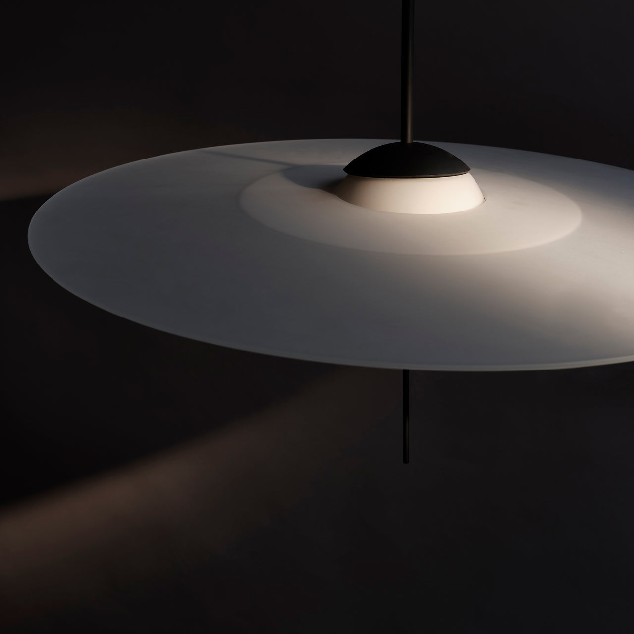 Round and nurturing like a warming sun, Mono lies within the self-effacing Scandinavian design tradition while adding an inviting interactive element. The pendant alights via a fine wire that lends it a floating quality while an extending rod at the base allows for the intuitive touch control of the illumination. Designers Studio Vantot call this the "magic stick" — and the light from an integrated LED filters through the globe and disc shape evenly and glare-free.