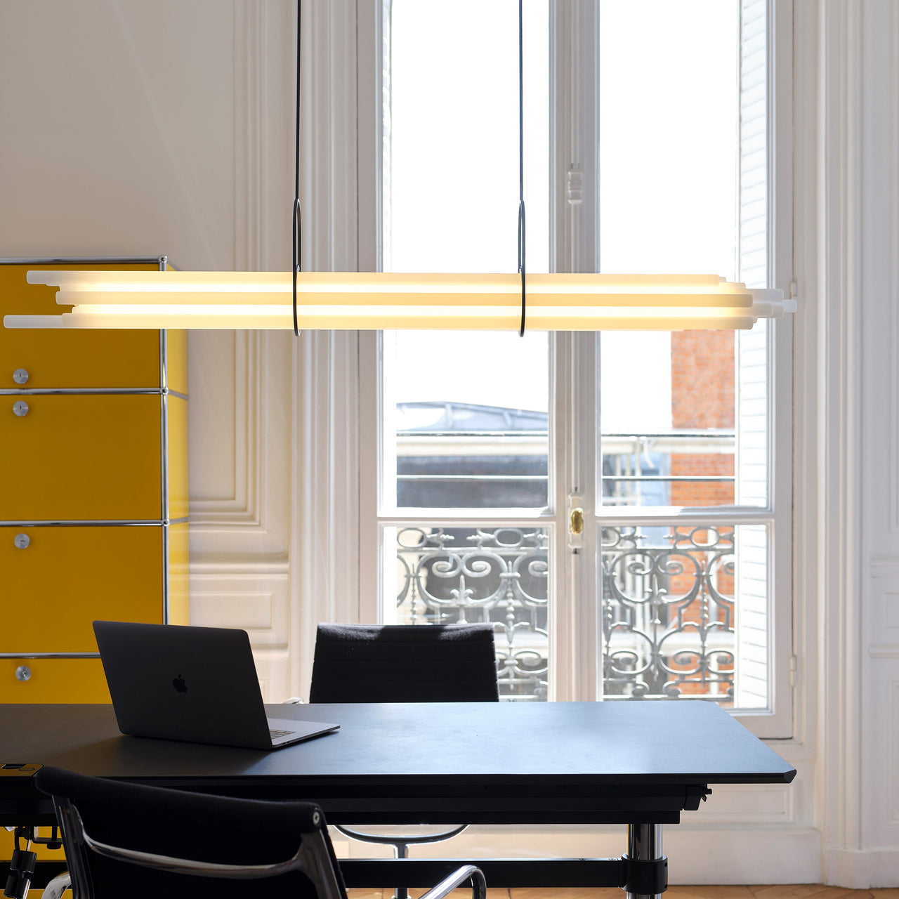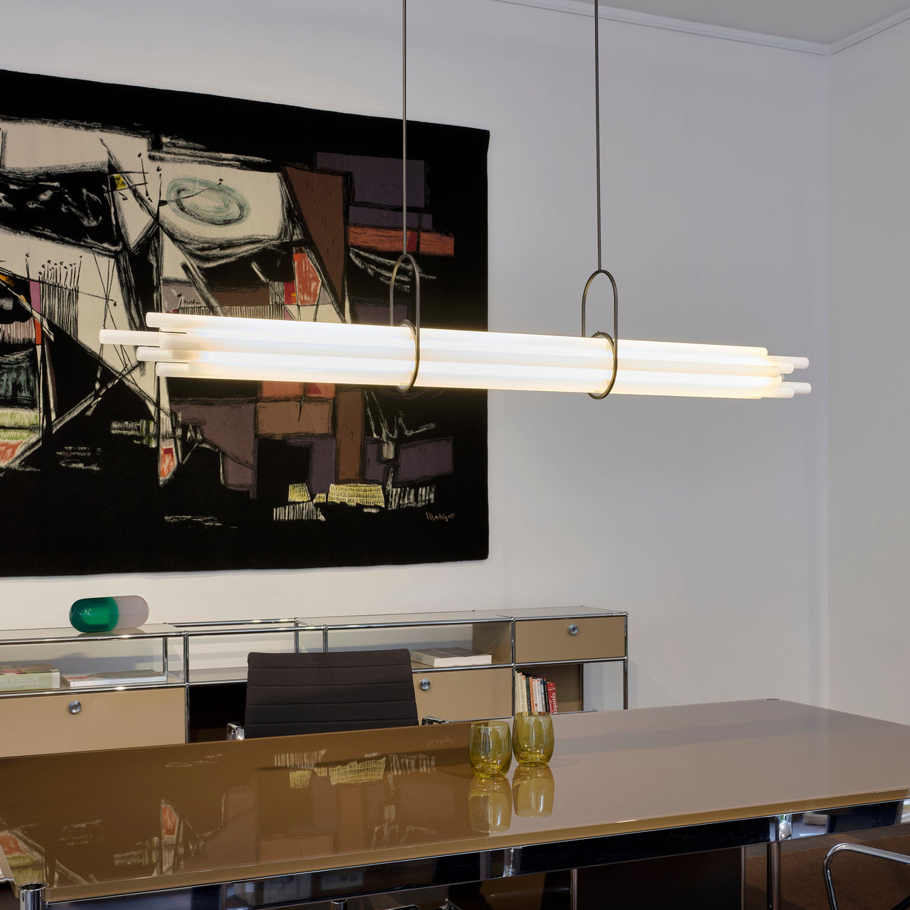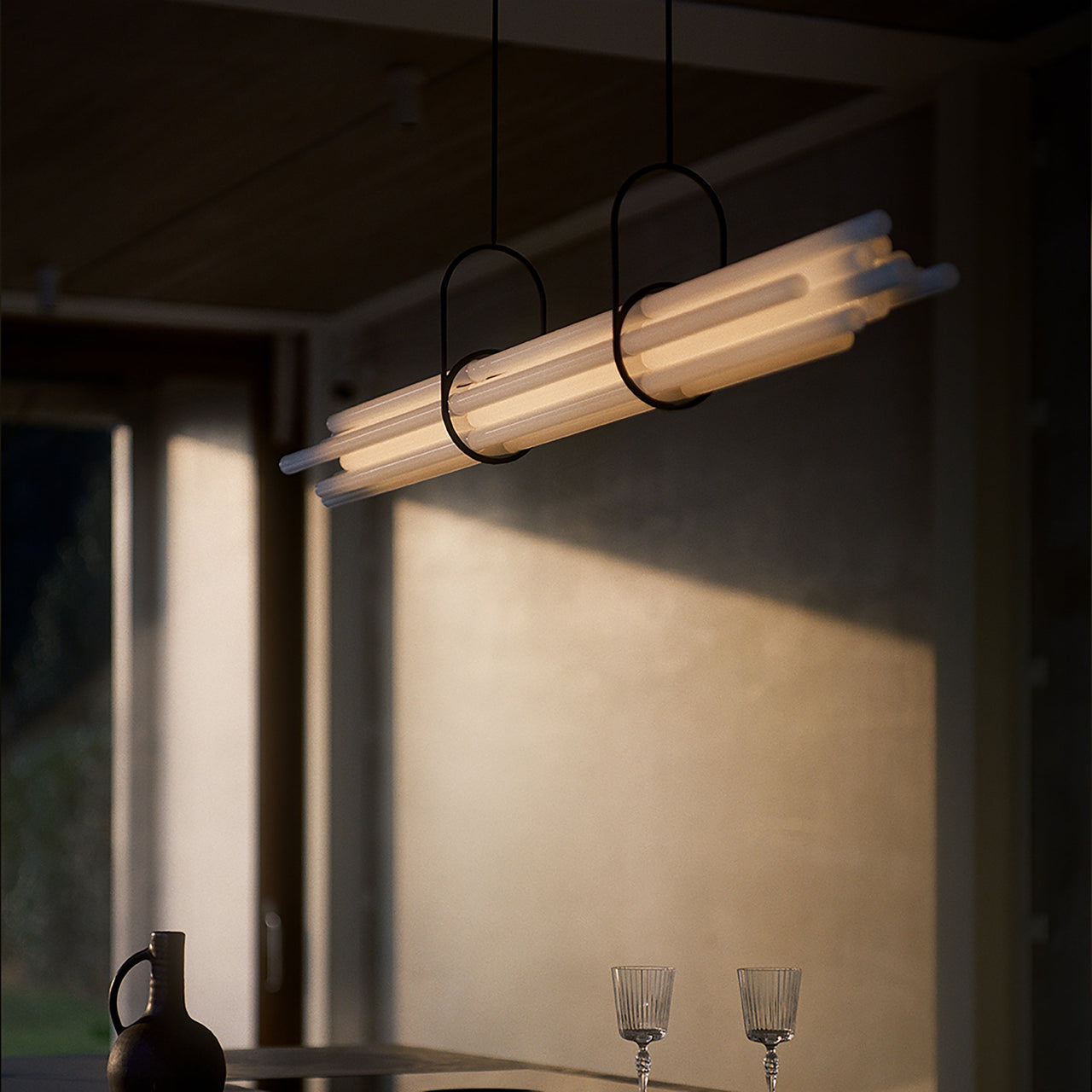 Designed to illuminate a large dining room table, Berlin designer Sebastian Summa’s tour-de-force pendant cleverly toys with visual perception. Composed of 12 borosilicate glass tubes, only the one at the center functions as NL12’s light source while the other tubes act as diffusers via refraction and prism. Without any visible wire or discernable LEDs, the sole structure seems to come from the pair of brackets resembling gymnastics clamps that balance the bundle of tubes perfectly.