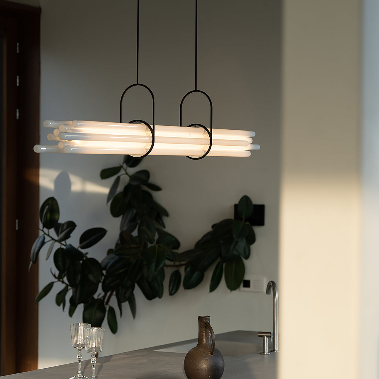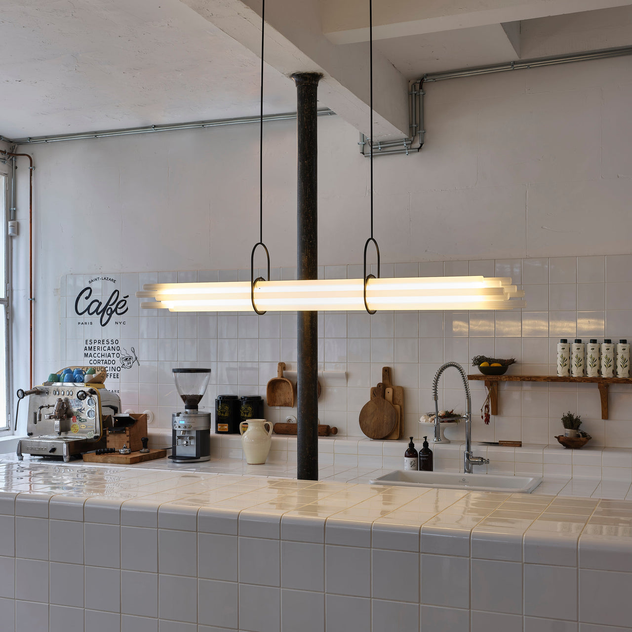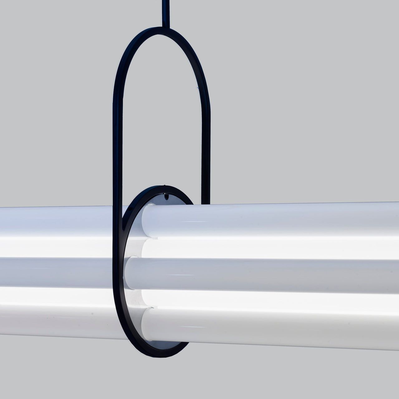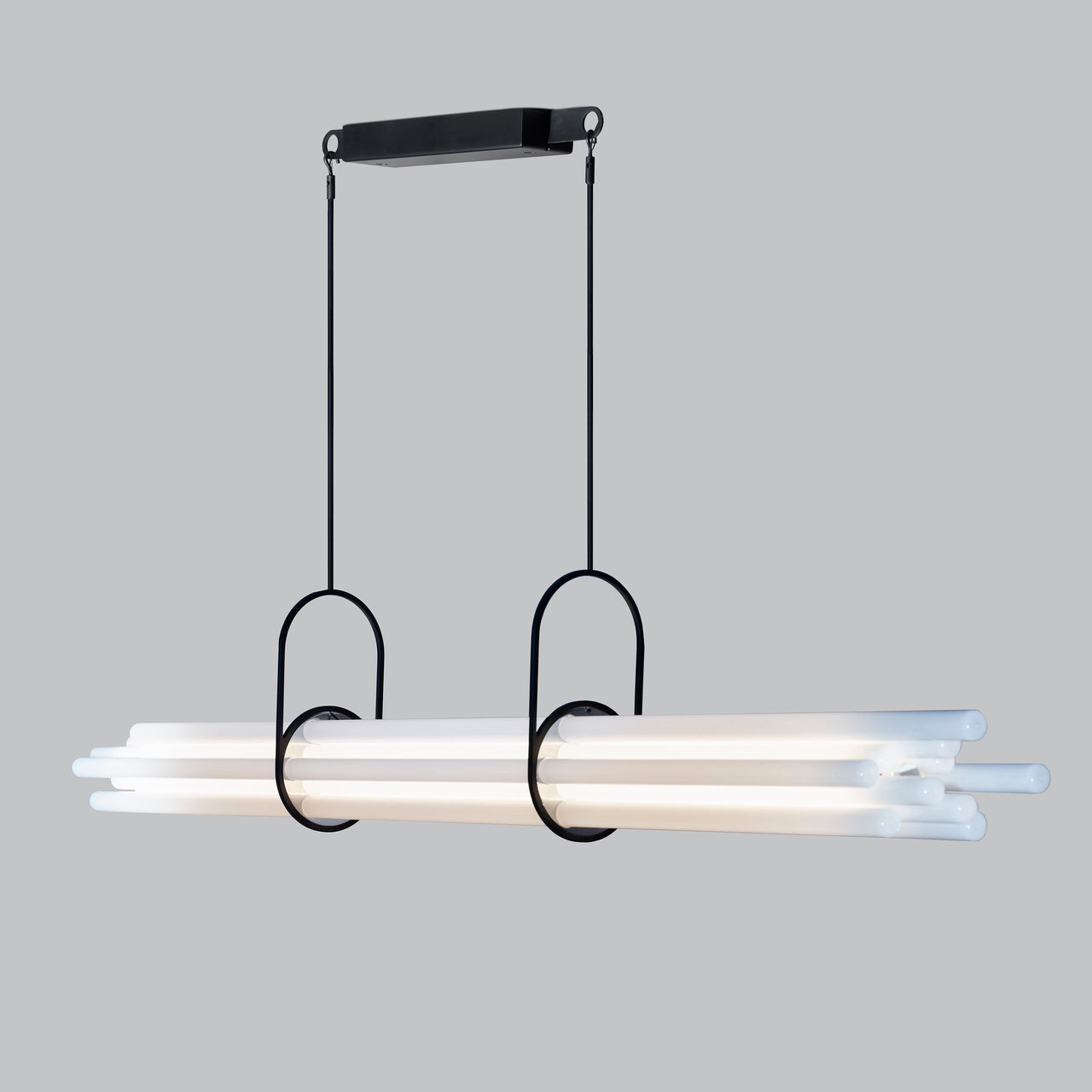 Designed to illuminate a large dining room table, Berlin designer Sebastian Summa’s tour-de-force pendant cleverly toys with visual perception. Composed of 12 borosilicate glass tubes, only the one at the center functions as NL12’s light source while the other tubes act as diffusers via refraction and prism. Without any visible wire or discernable LEDs, the sole structure seems to come from the pair of brackets resembling gymnastics clamps that balance the bundle of tubes perfectly.