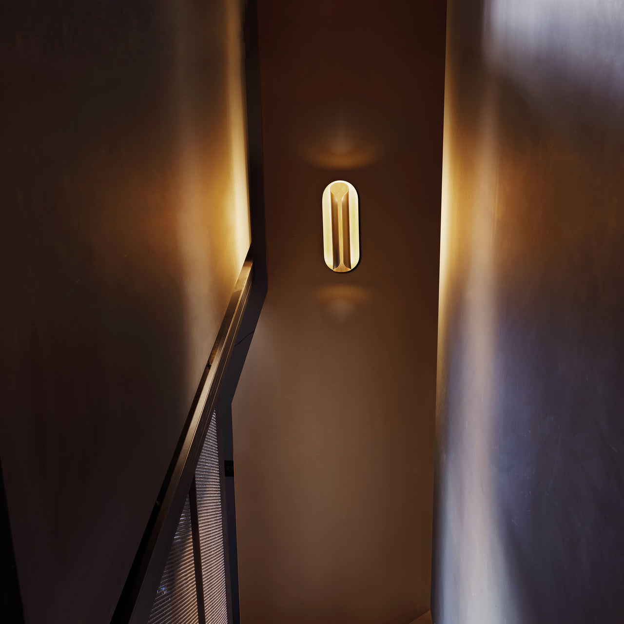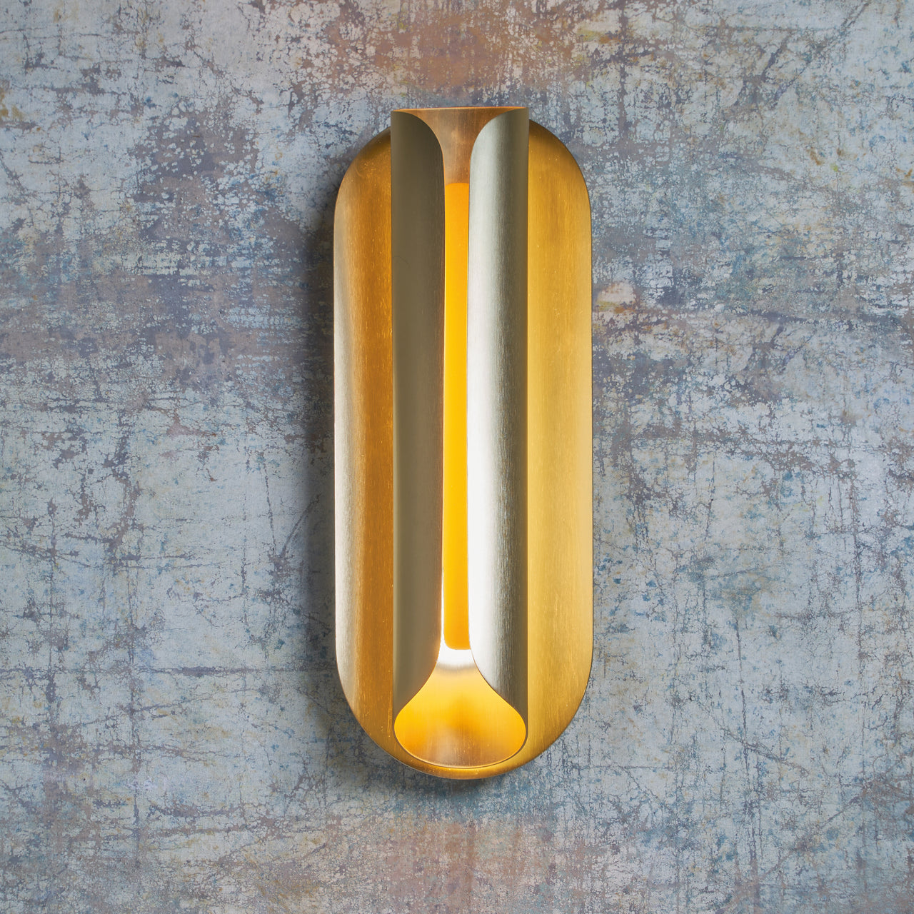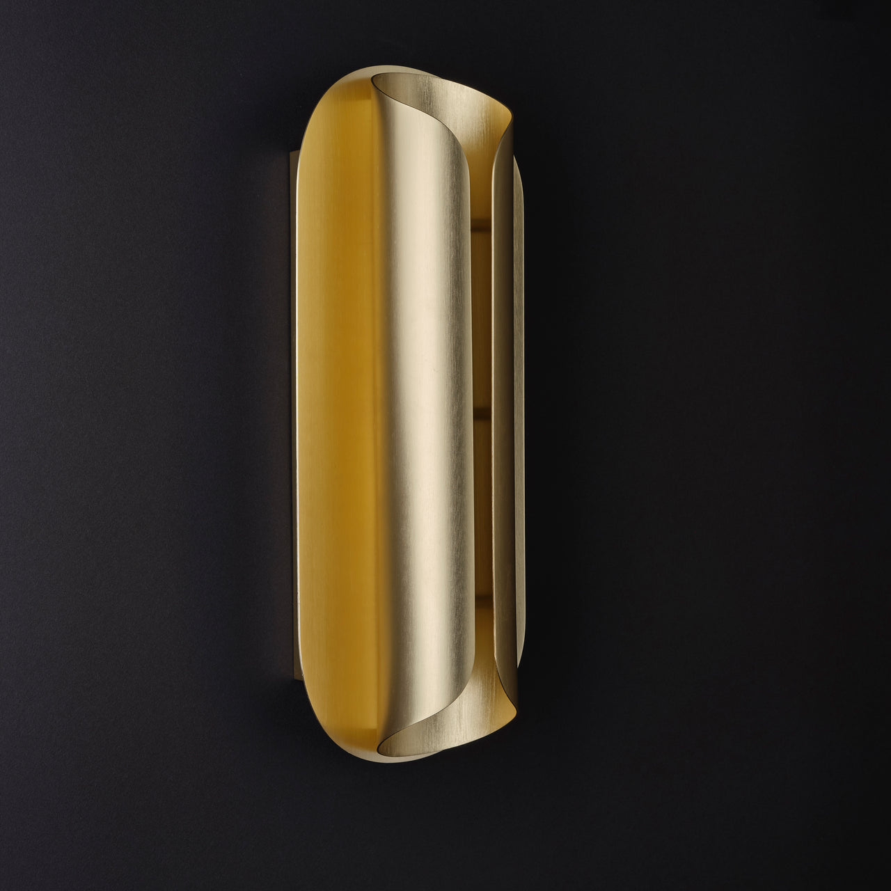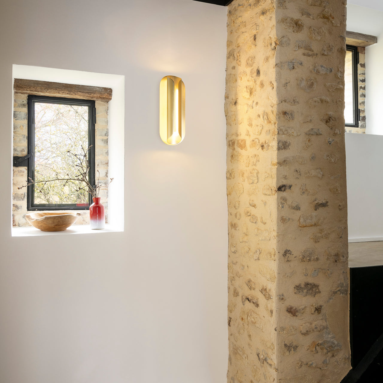 From Paris-based DCW Éditions, Rosalie hails from the studio’s Atmospherics collection, meant to moodily bridge the hours between light and darkness. Created by the architect and designer Julie Fuillet and the lighting wiz Emeric Thiénot, the wall lamp pairs 2 thin aluminum plates with a gilt finish. One is rolled up to diffuse the light from its integrated LED inside, relaying a warm and reassuring golden glow.