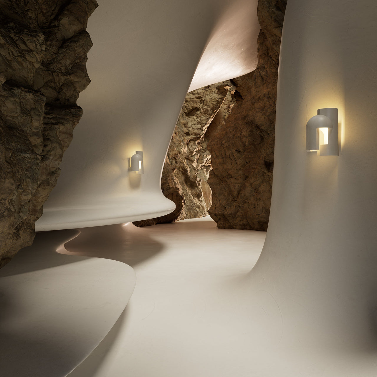 Soul Story 1, like its sister wall lights, was born of a chance meeting between French-Lebanese designer Charles Kalpakian and DCW Èditions’ Frédéric Winkler at a design fair. In white plaster, with or without gold leaf decoration, the designer plays on the image of a dusky night suddenly being pierced with a surreal ray of light in the varied constructions lit by an integrated LED. Kalpakian even includes a doppelgänger of himself in the small metal figure standing watch, inviting further contemplation of the configuration while also acting as a type of signature.