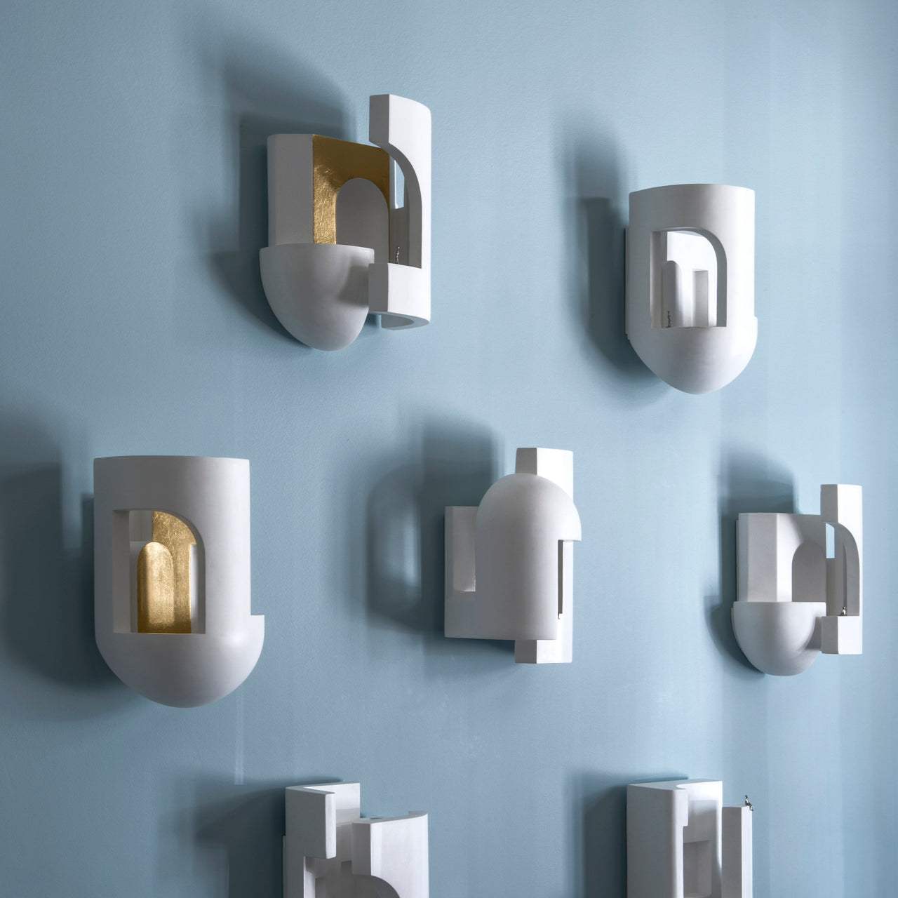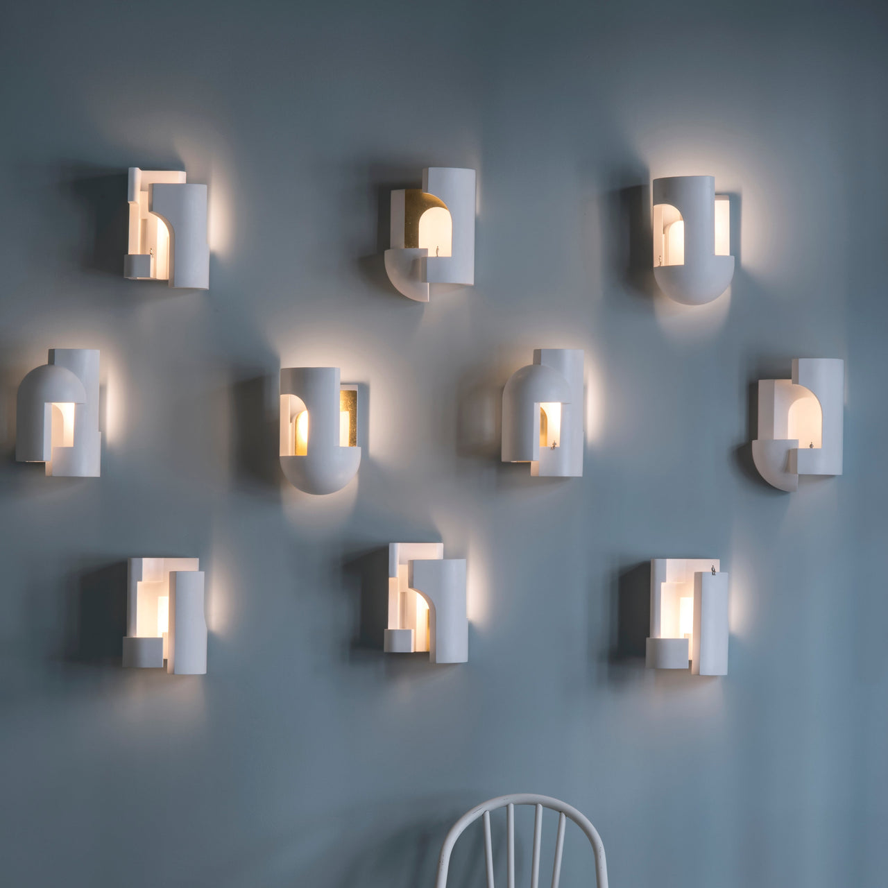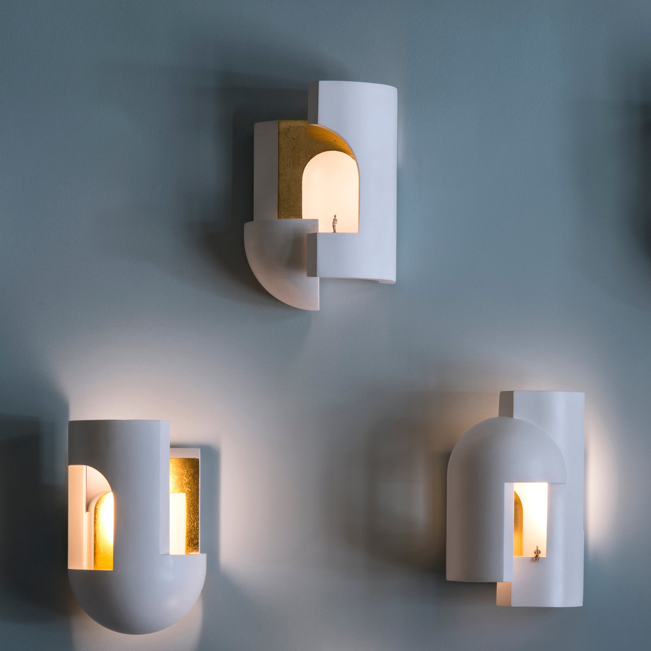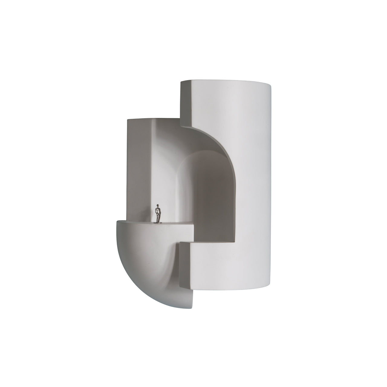 Soul Story 2, like its sister wall lights, was born of a chance meeting between French-Lebanese designer Charles Kalpakian and DCW Èditions’ Frédéric Winkler at a design fair. In white plaster, with or without gold leaf decoration, the designer plays on the image of a dusky night suddenly being pierced with a surreal ray of light in the varied constructions lit by an integrated LED. Kalpakian even includes a doppelgänger of himself in the small metal figure standing watch, inviting further contemplation of the configuration while also acting as a type of signature.