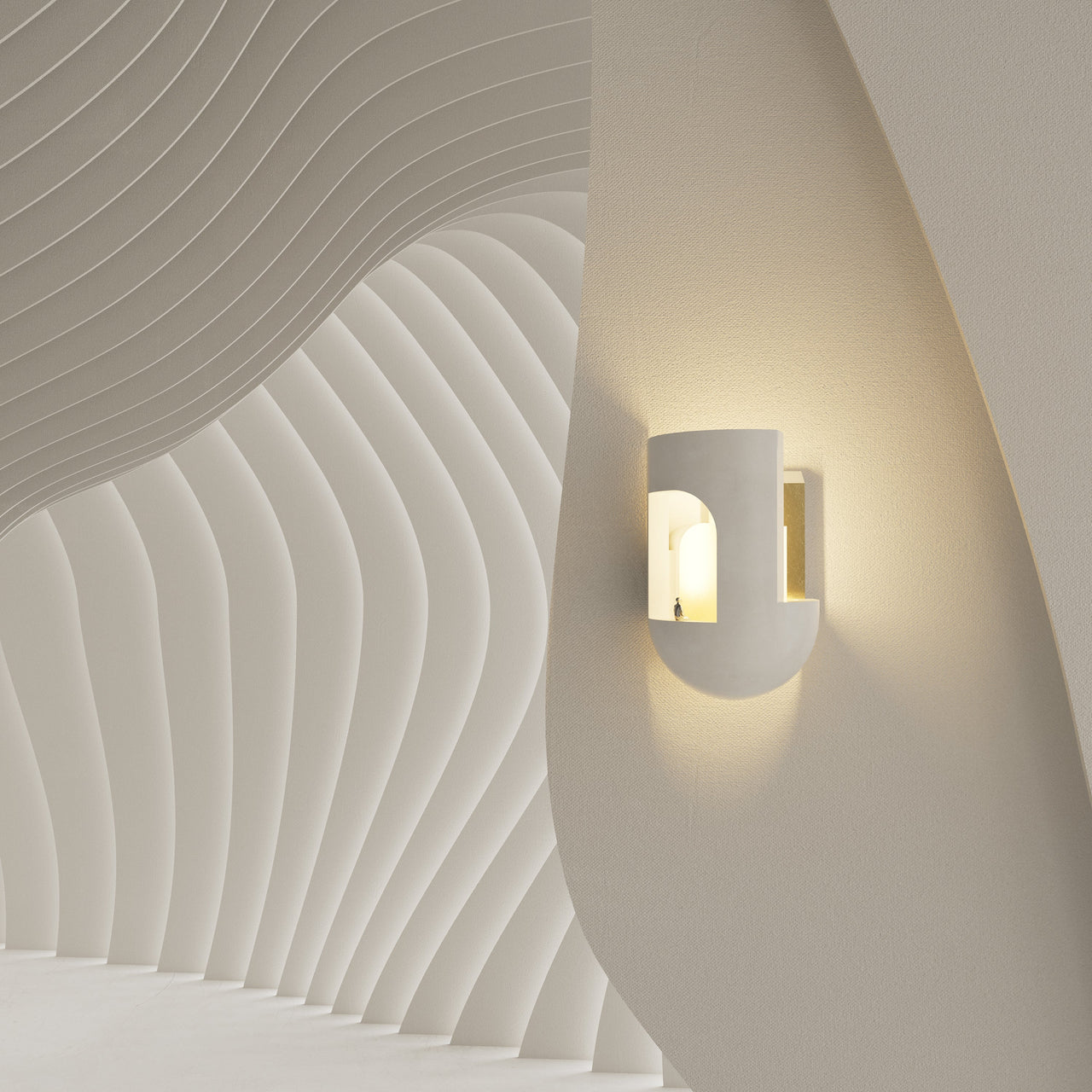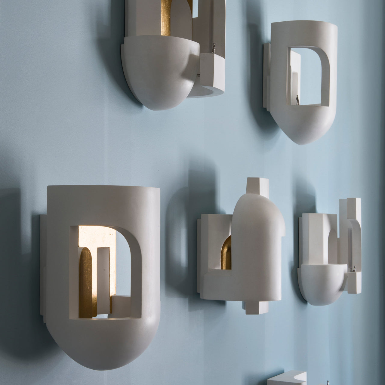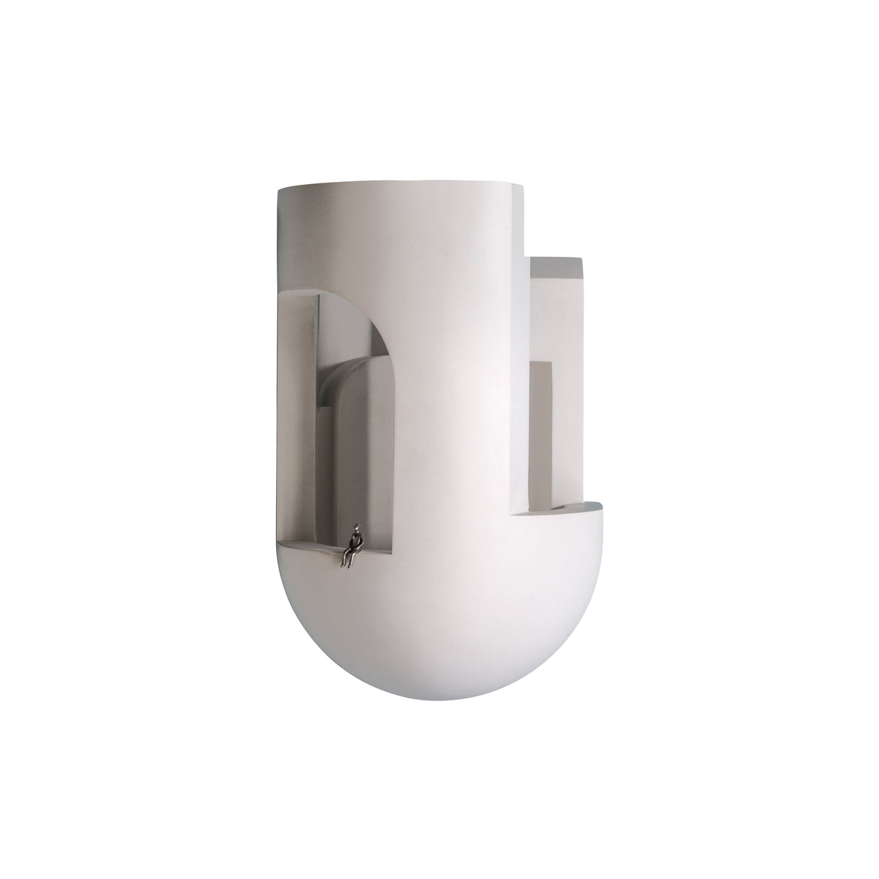 Soul Story 3, like its sister wall lights, was born of a chance meeting between French-Lebanese designer Charles Kalpakian and DCW Èditions’ Frédéric Winkler at a design fair. In white plaster, with or without gold leaf decoration, the designer plays on the image of a dusky night suddenly being pierced with a surreal ray of light in the varied constructions lit by an integrated LED. Kalpakian even includes a doppelgänger of himself in the small metal figure standing watch, inviting further contemplation of the configuration while also acting as a type of signature.