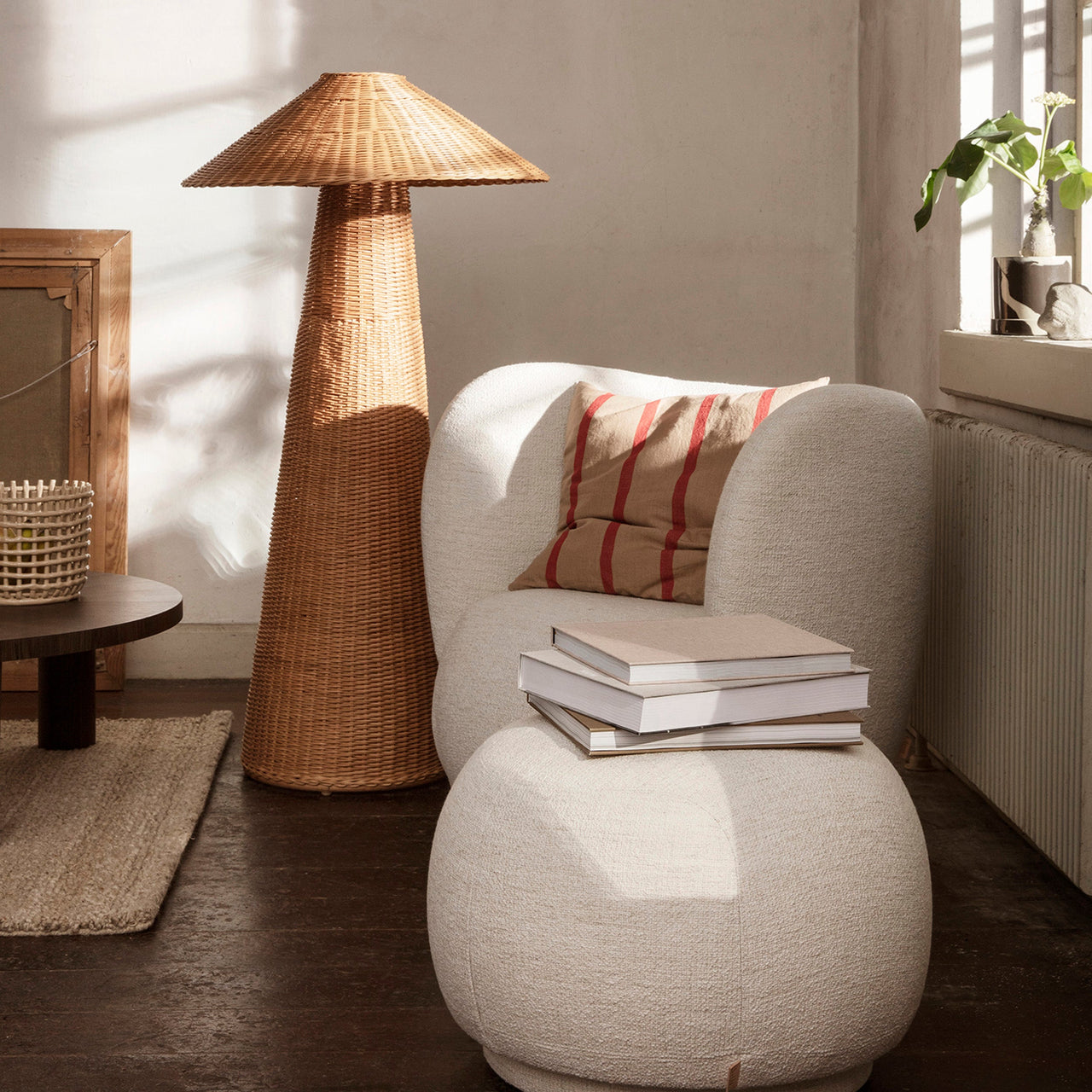 The Dou Floor Lamp crafted with hand-braided rattan, stands tall and features a textile cord with a footswitch for easy operation. Its oversized dimensions provide a soft, comfortable light, with the shade allowing subtle glimpses of illumination through the braided material, adding texture and tactility to your living space. Each piece is unique due to its handcrafted nature, making it a distinctive addition to any interior.