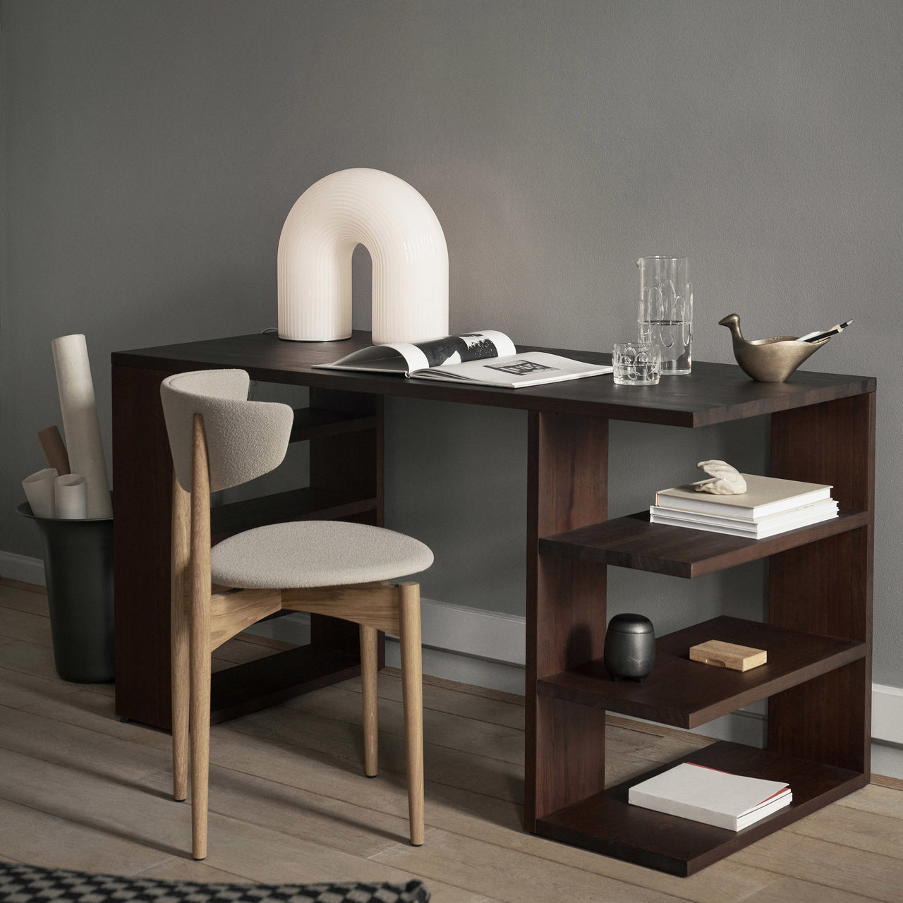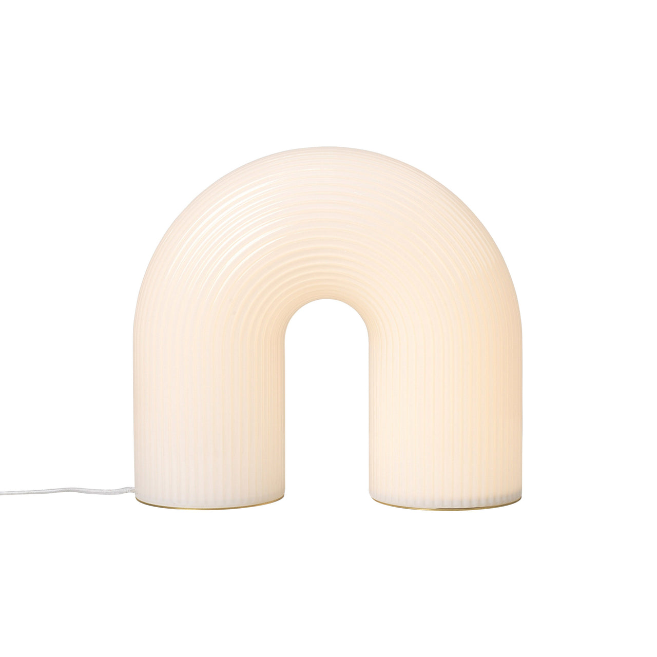 In rippled opal glass with a glossy finish, Vuelta’s bold arc nods to ancient columns but has a modern sense of scale. Ferm Living’s statement floor lamp serves as both a sculpture and a source of softly diffused LED illumination, the glowing form sitting on matte brass feet and featuring an in-cord dimmer switch for fine-tuning the ambiance.