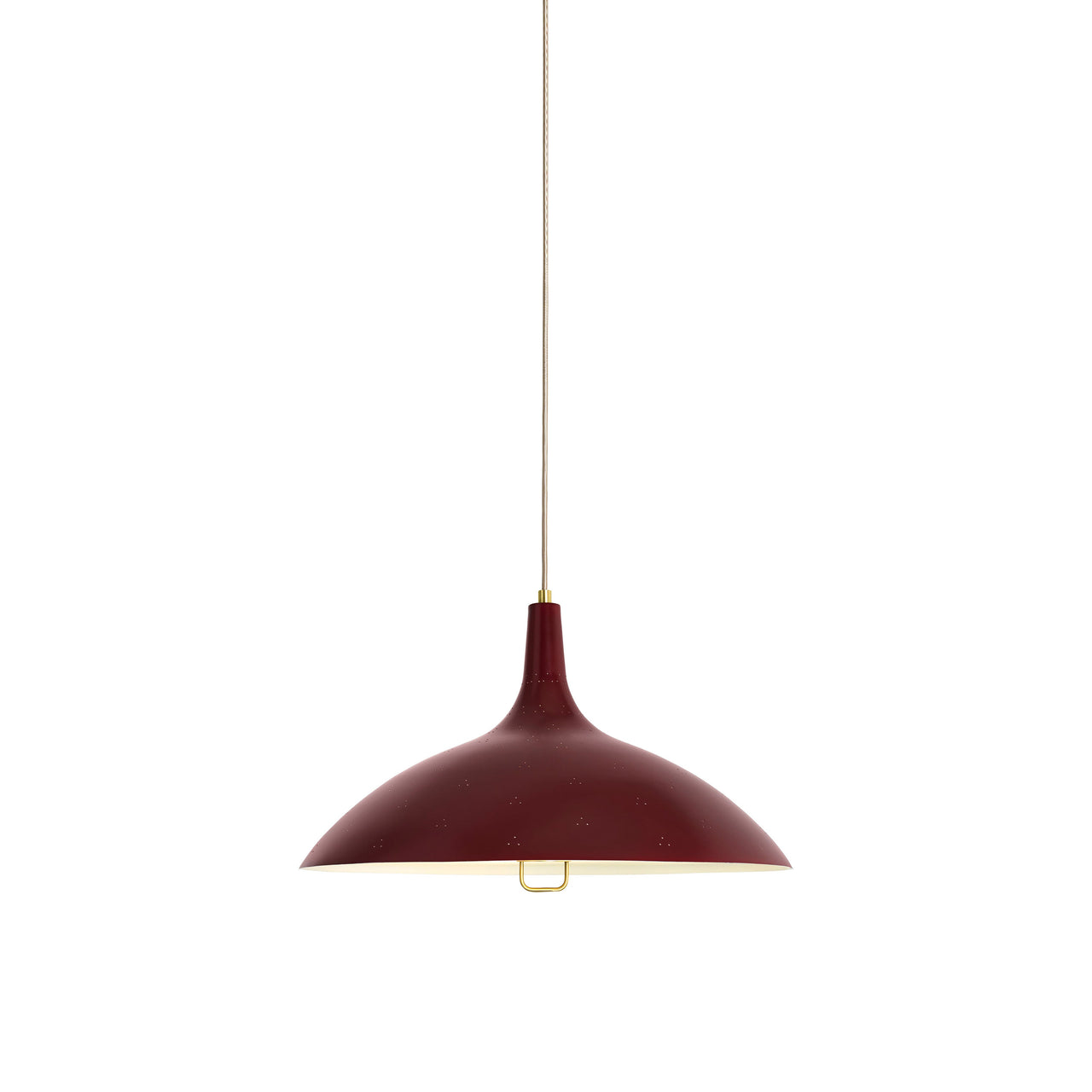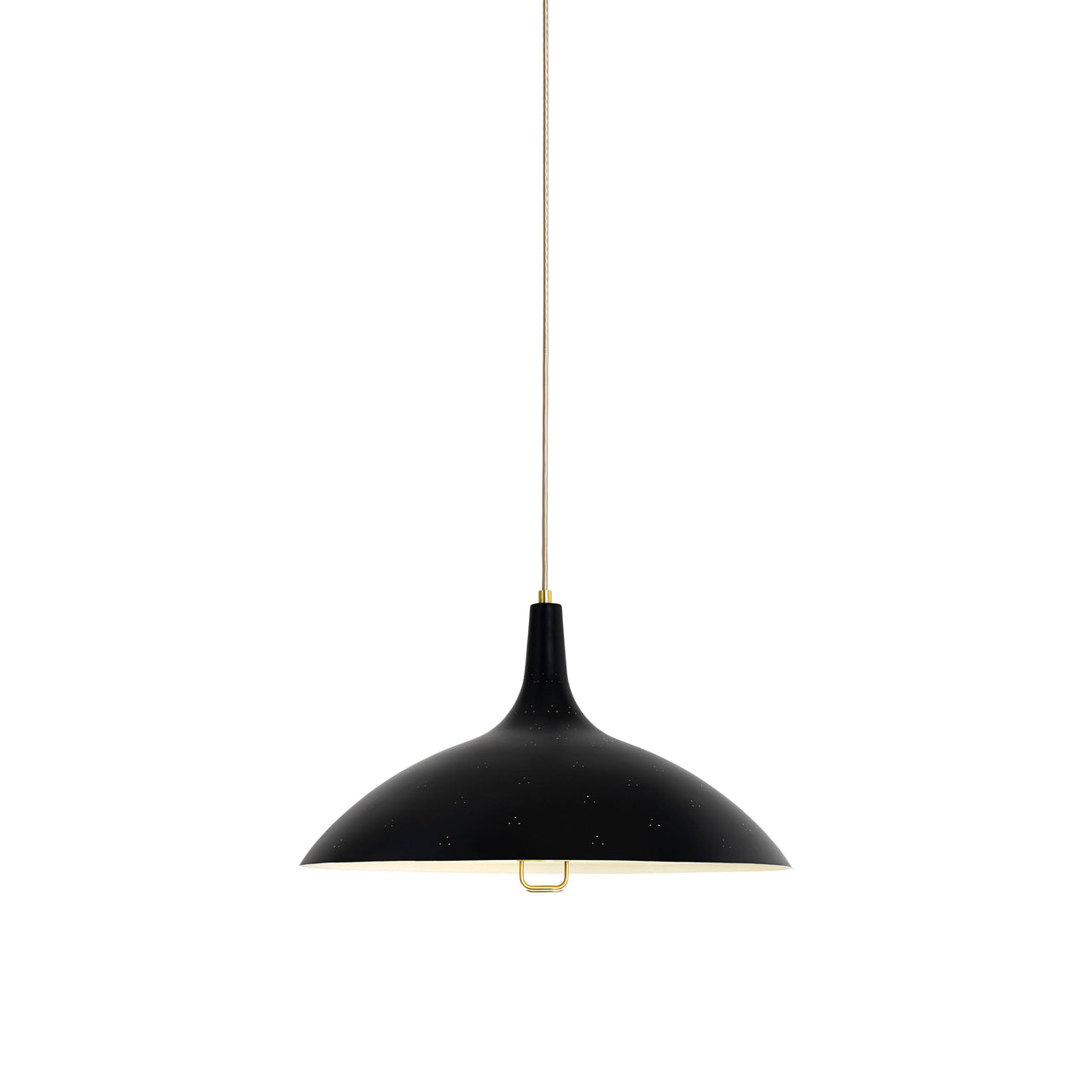 Paavo Tynell’s sleek pendant was designed for the 1947 exhibit Finland House in New York, a pathbreaking view into Finnish design. Known for his distinctive metal treatments, 1965 exemplifies Tynell’s graceful way with brass, especially in the signature triangular perforated pattern. The fixture’s frosted-glass diffuser softens the light, spreading a warm and glare-free illumination.
