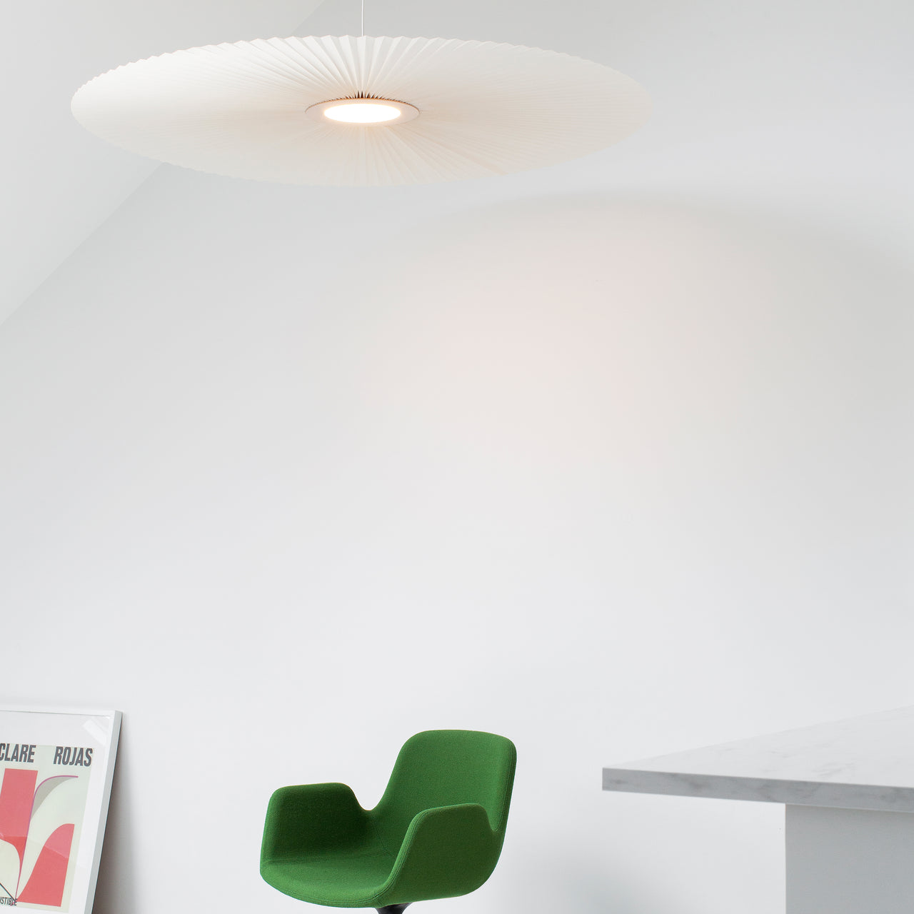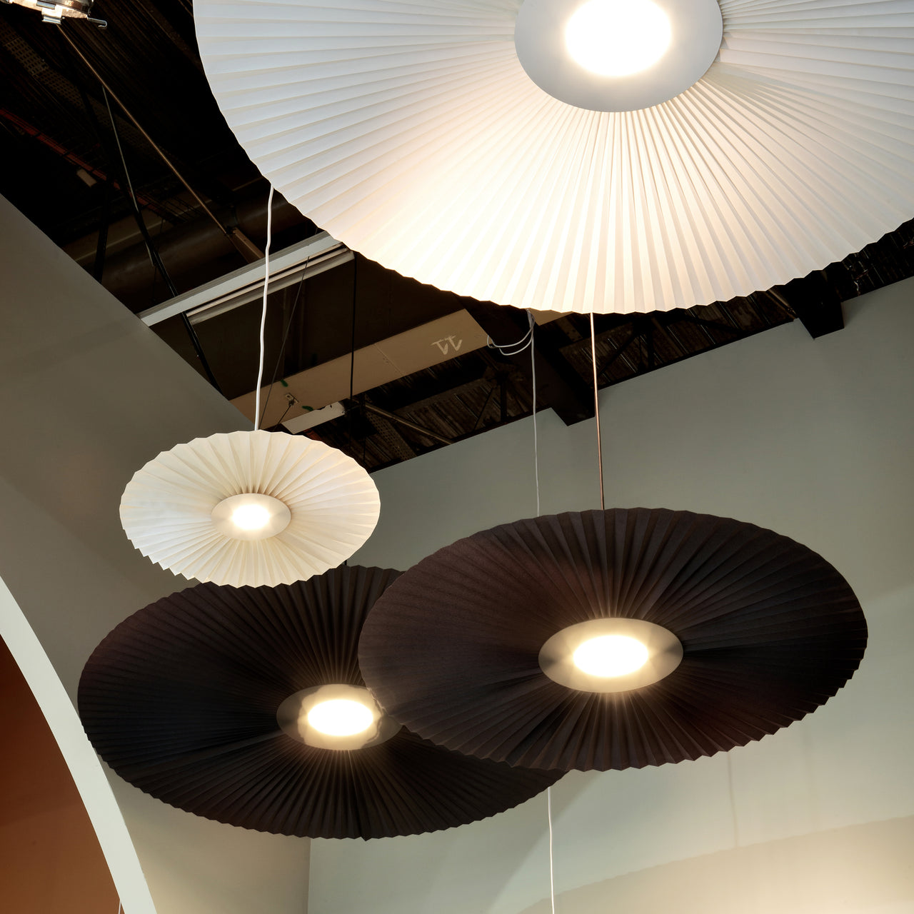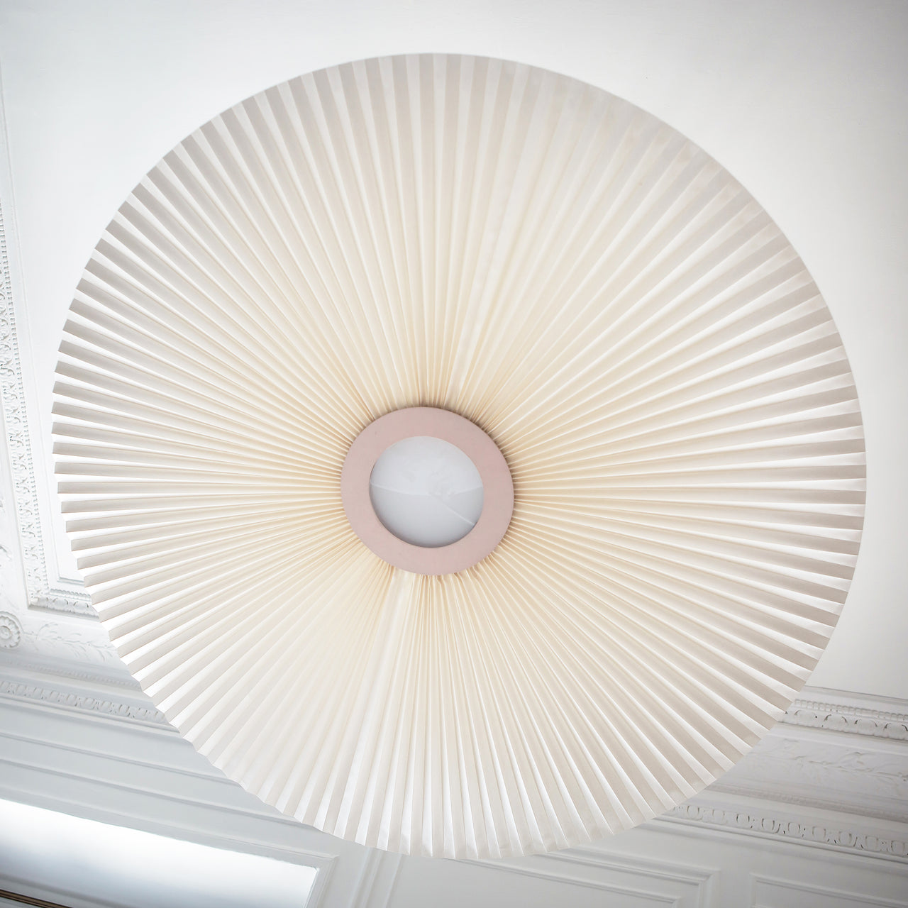 Carmen’s wall-mounted version restages the original’s bewitching pleated “tutu” to brighten a bedroom, living room or hallway with its warm LED glow. Made in France and designed by the PaulinePlusLuis duo for Hartô, the lamp’s laminated, pleated shade fans out from a matching matte-lacquered metal disc and comes in a balletic nude pink, white or slate grey.