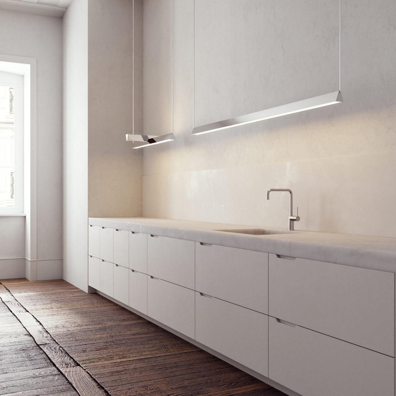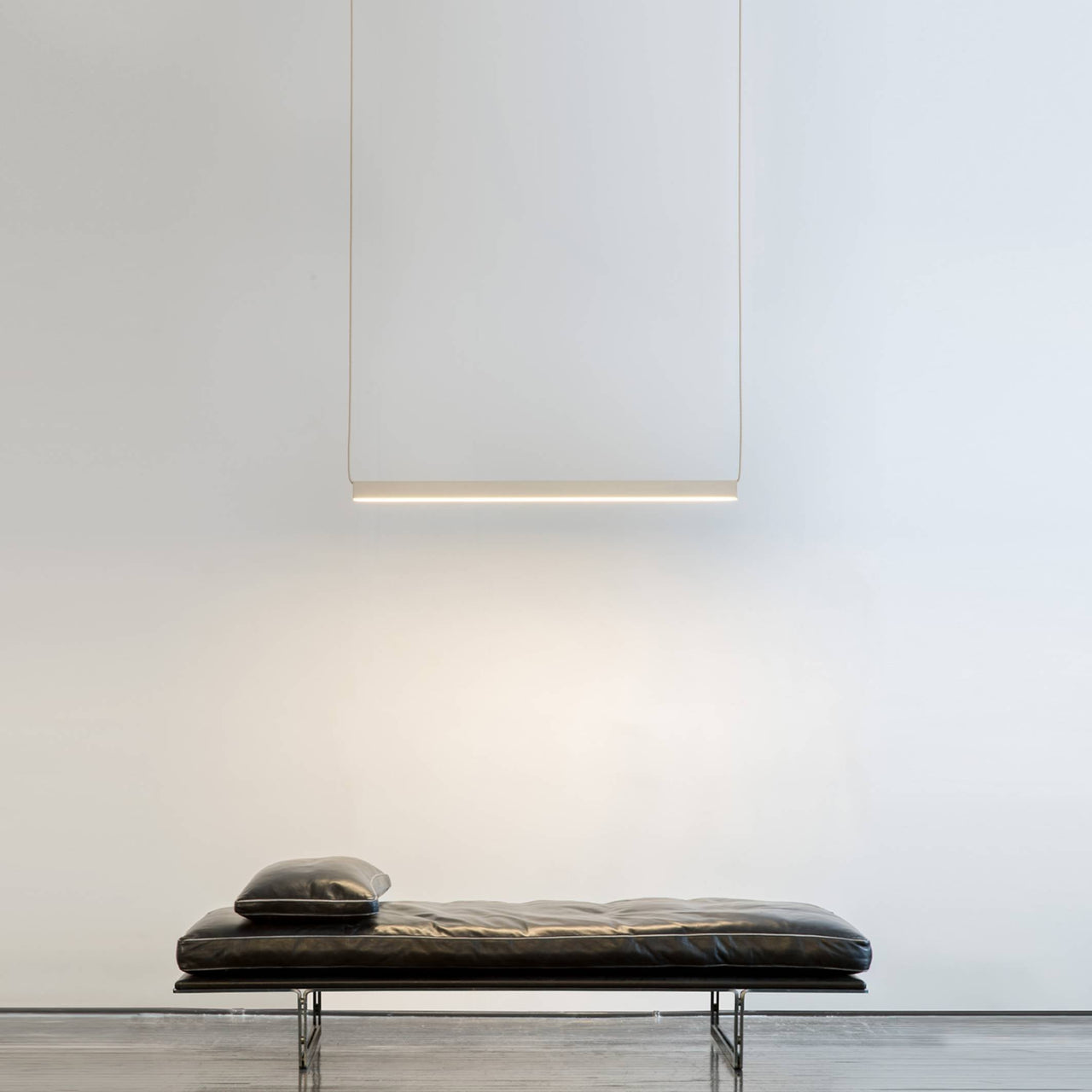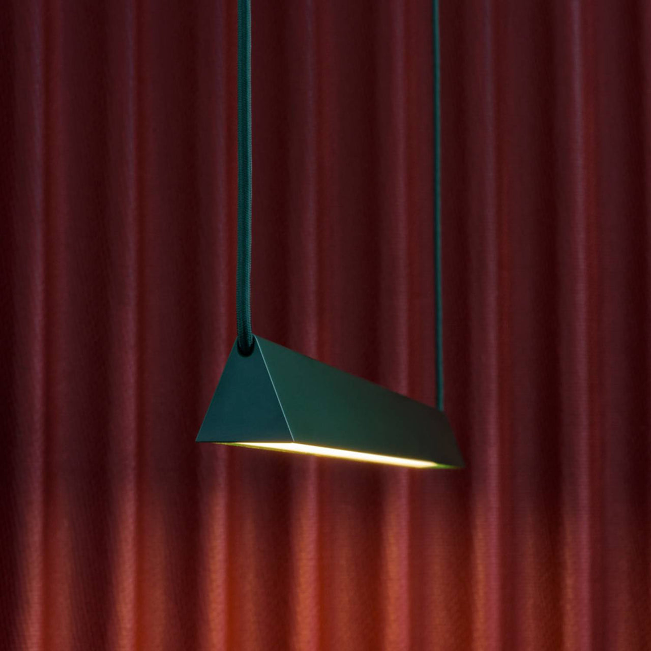 A single extended length, Mile 04,departs from the 90-degree pivot that characterizes the rest of the suspension lamp series and emits useful downward-directed lighting. Starting with a computer grid model, Canadian designer Guillaume Sasseville transformed the series' geometric origins in a sleek powder-coated or polished aluminum body. With a weightless air suspended on its thin wires and powered by linear LED technology, the light is completely handmade at Lambert & Fils Montreal atelier.