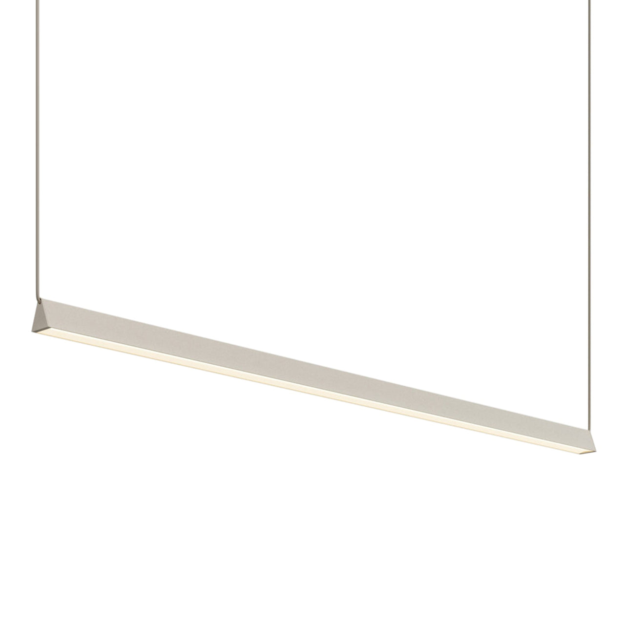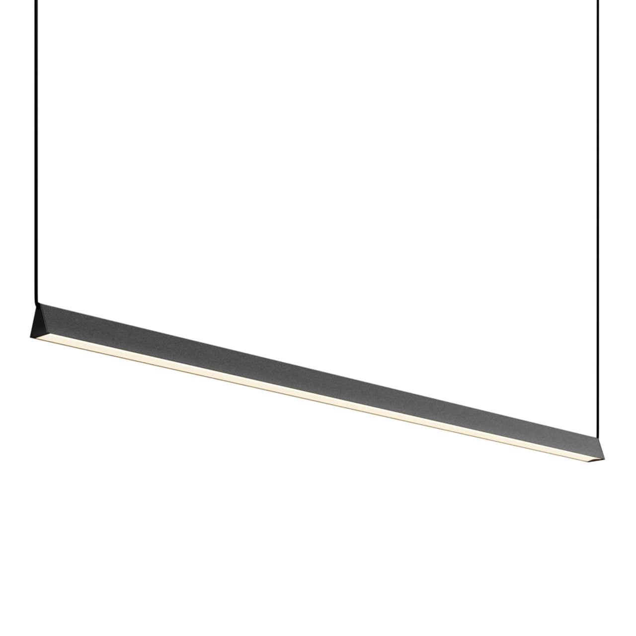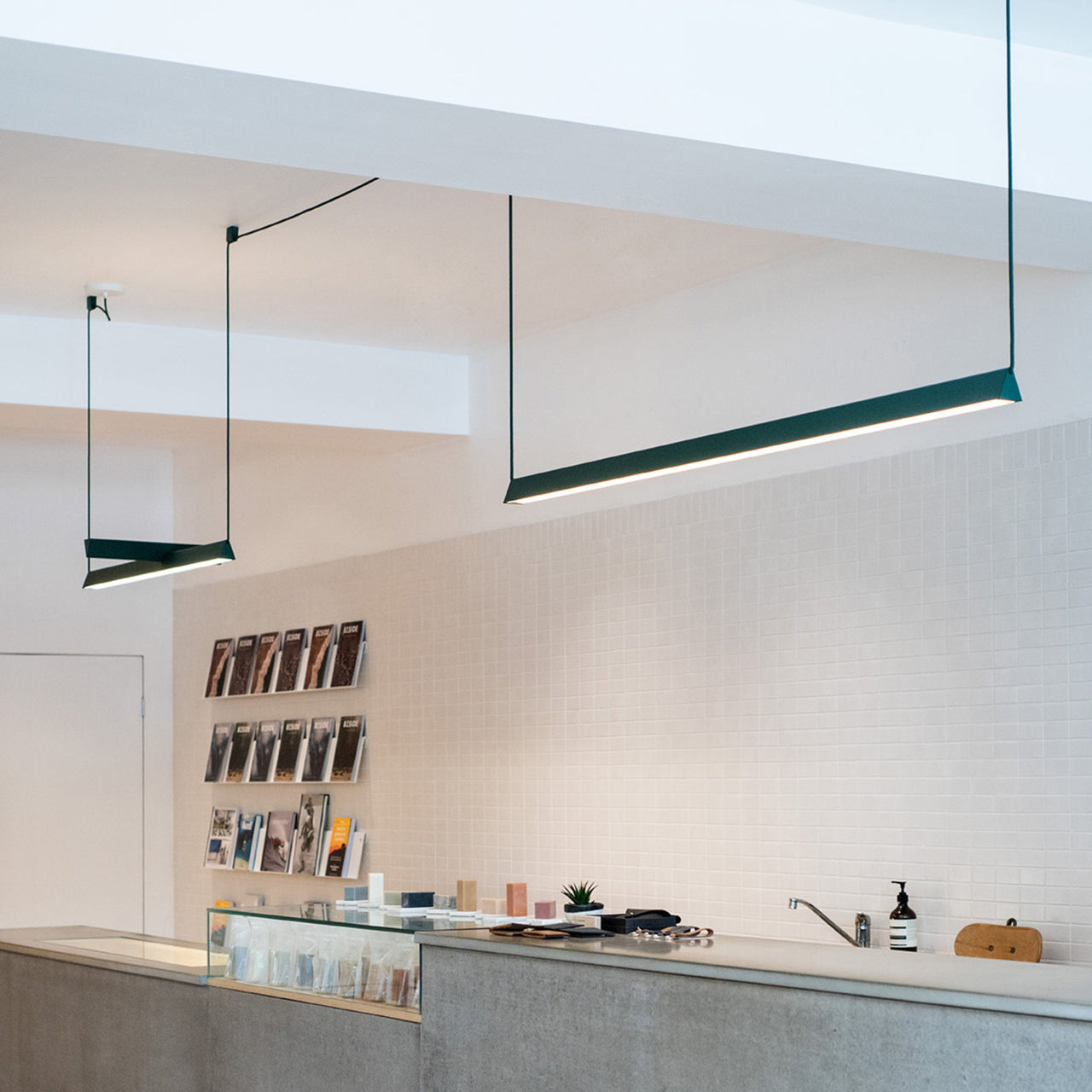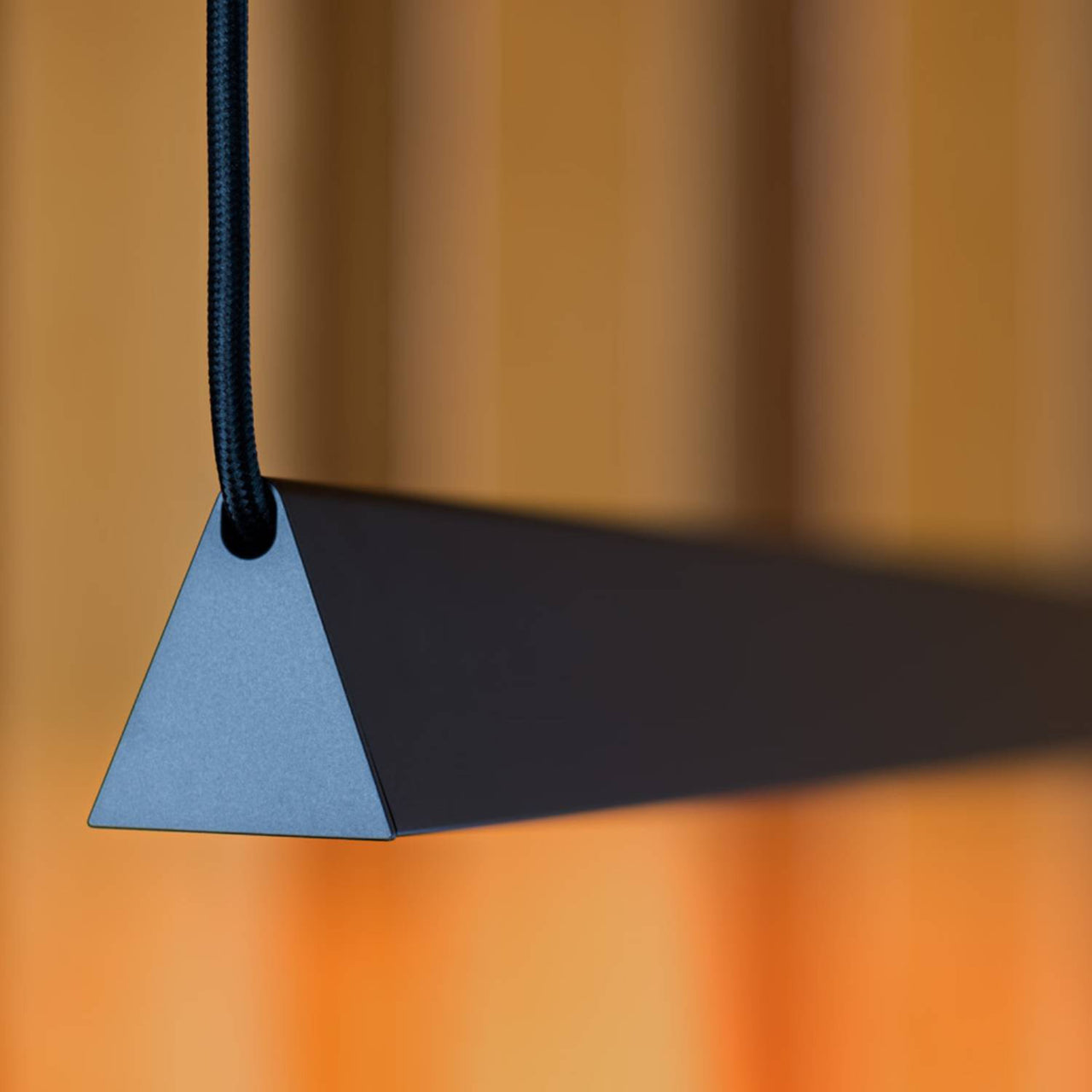 A single extended length, Mile 04,departs from the 90-degree pivot that characterizes the rest of the suspension lamp series and emits useful downward-directed lighting. Starting with a computer grid model, Canadian designer Guillaume Sasseville transformed the series' geometric origins in a sleek powder-coated or polished aluminum body. With a weightless air suspended on its thin wires and powered by linear LED technology, the light is completely handmade at Lambert & Fils Montreal atelier.