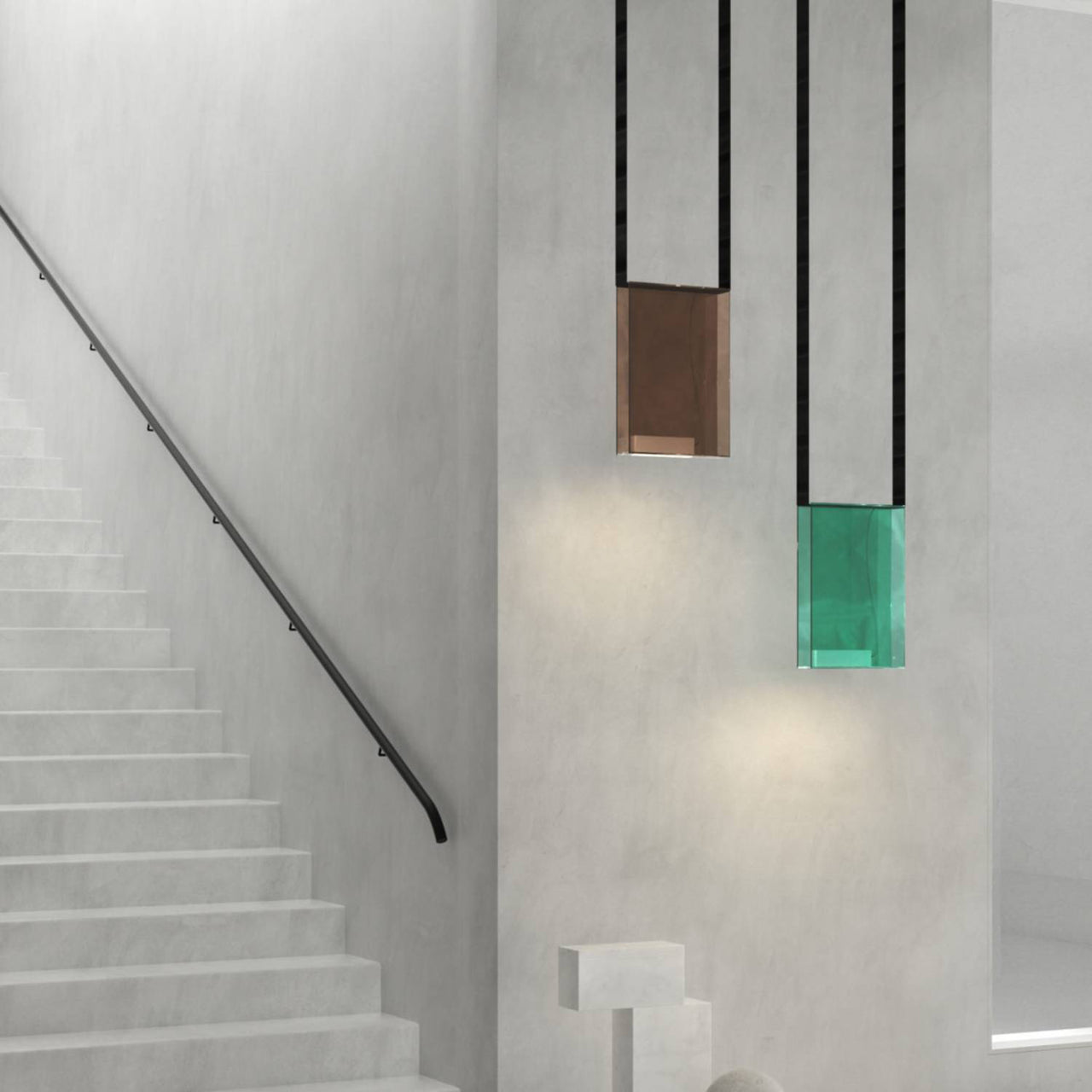 Vertically aligned, the rectangular 03—like its majestic siblings in the Sainte Atelier range—is scaled for large spaces and high ceilings. Conceived in collaboration with Canadian designer Rachel Bussin, the boldly hued, laminated glass structure has a radiant glow and a substantial presence, suspended by bold lengths of nylon ribbon. Powered by an integrated LED array in a choice of color temperatures, the removable aluminum lightbox can be oriented to cast illumination up or down.