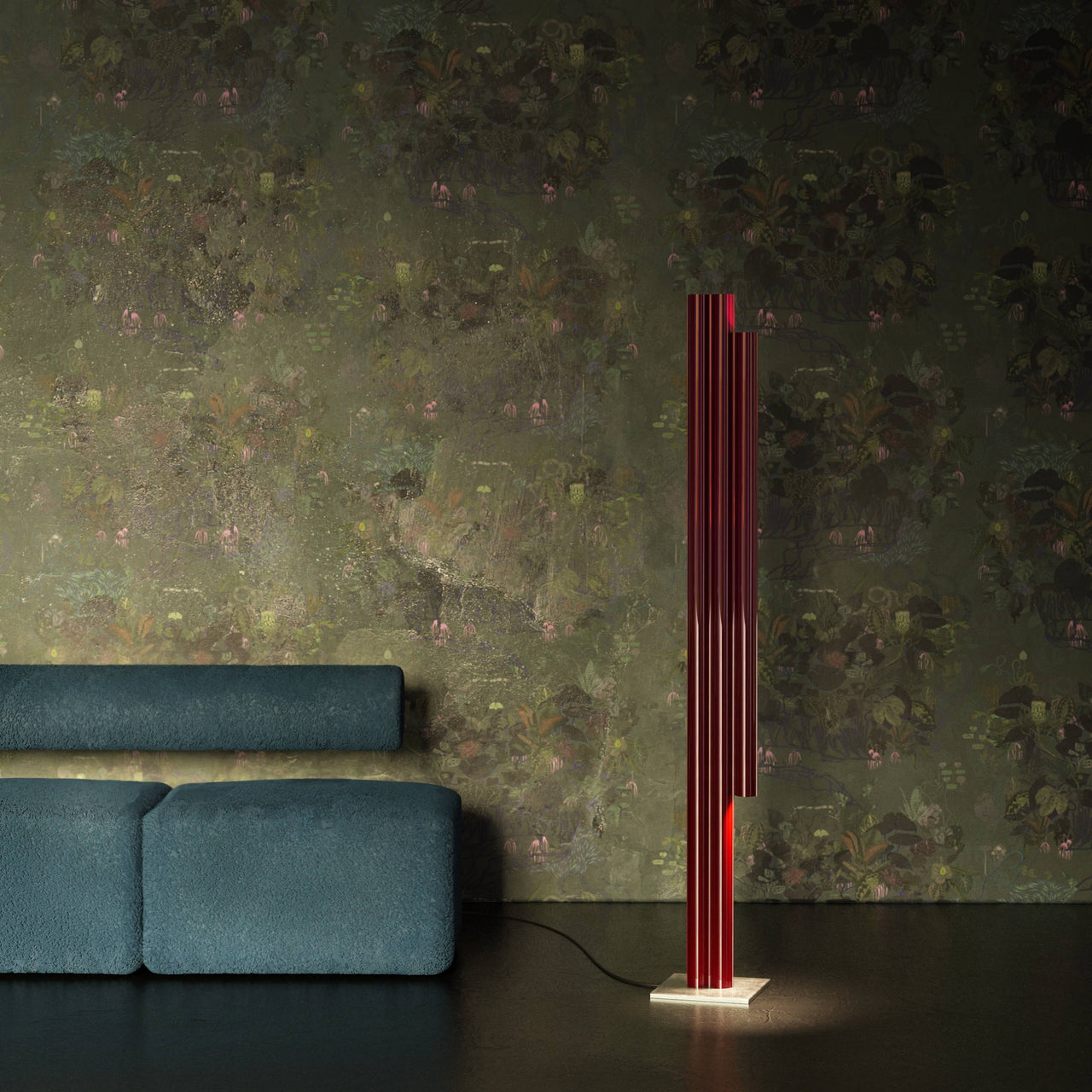 Silo 3FH floor is a sculptural take on the traditional standing lamp, with a linear presence that makes a statement whether off or illuminated. Providing light upward from its 3 channels and downward as well from the shorter cylinder, the floor light is fashioned using custom aluminum extrusions in either metallic or color finishes, set on a plinth-style base.