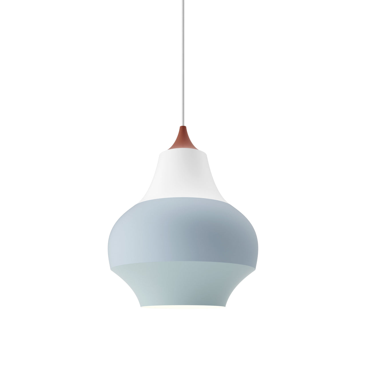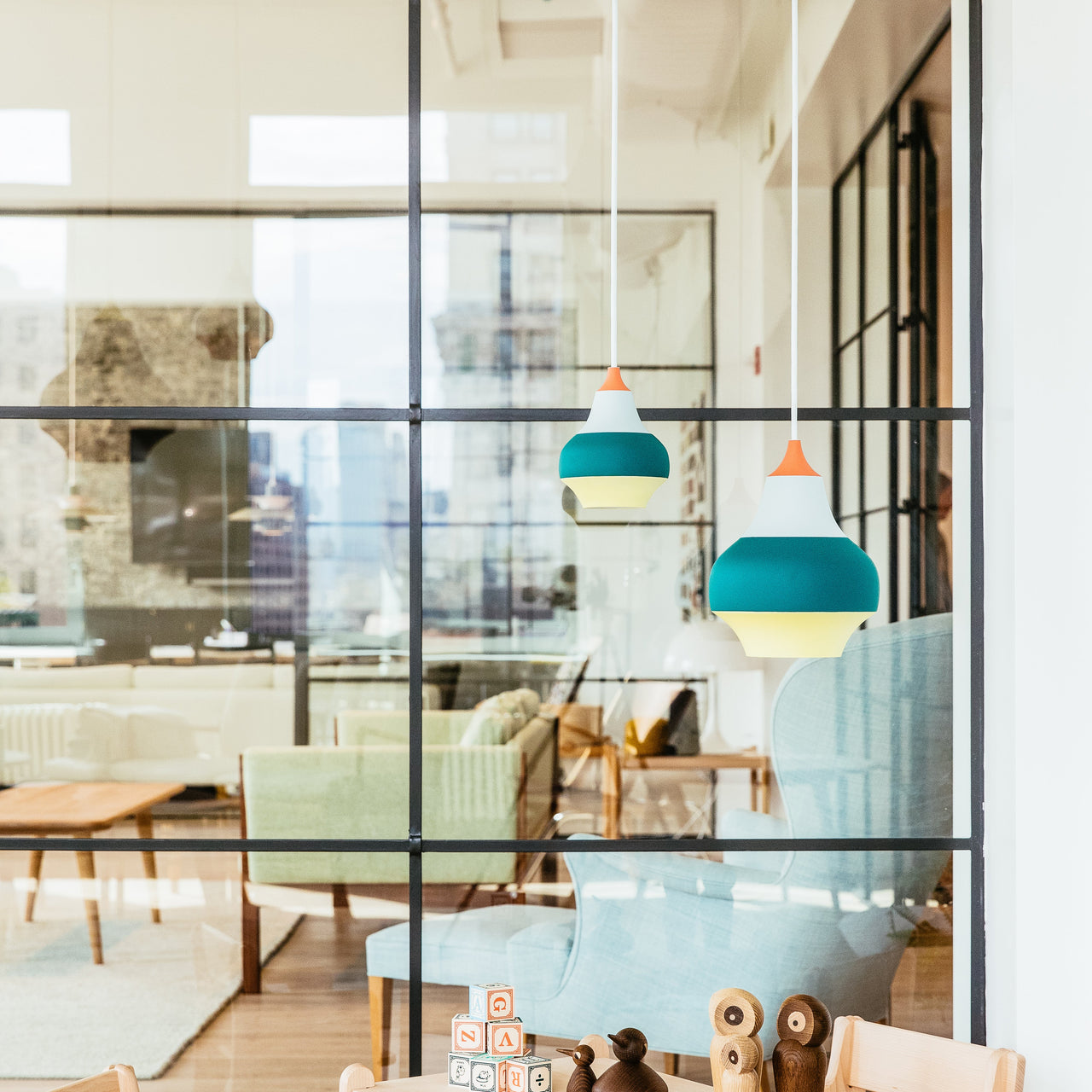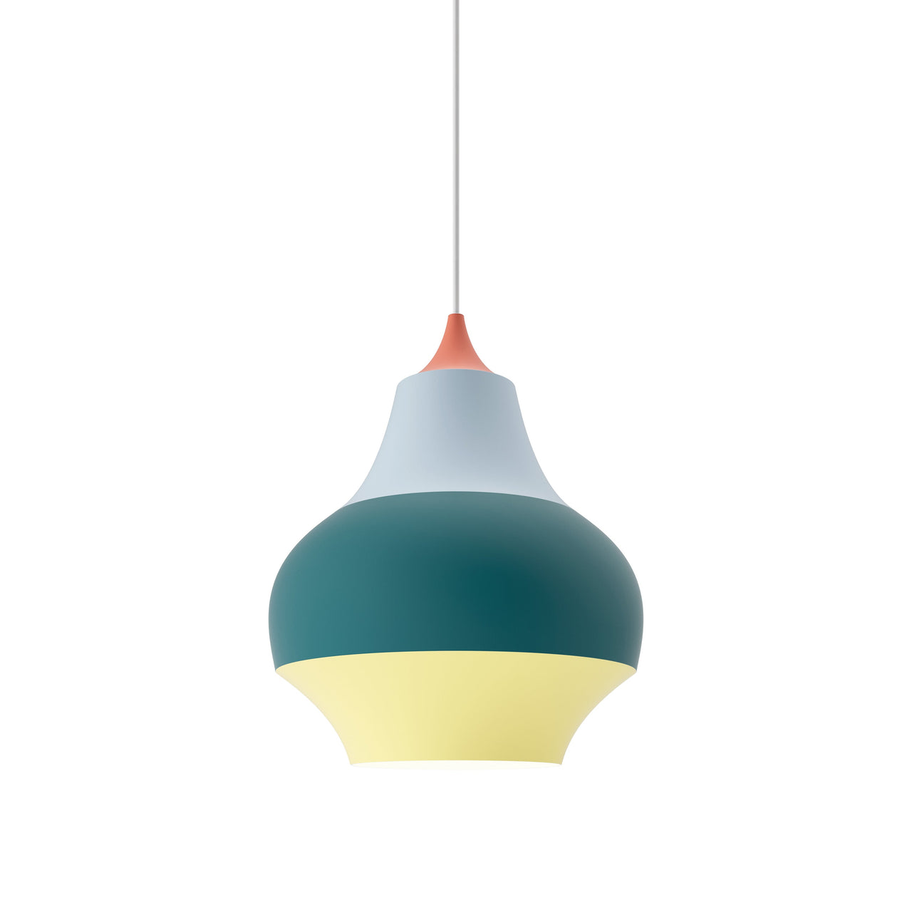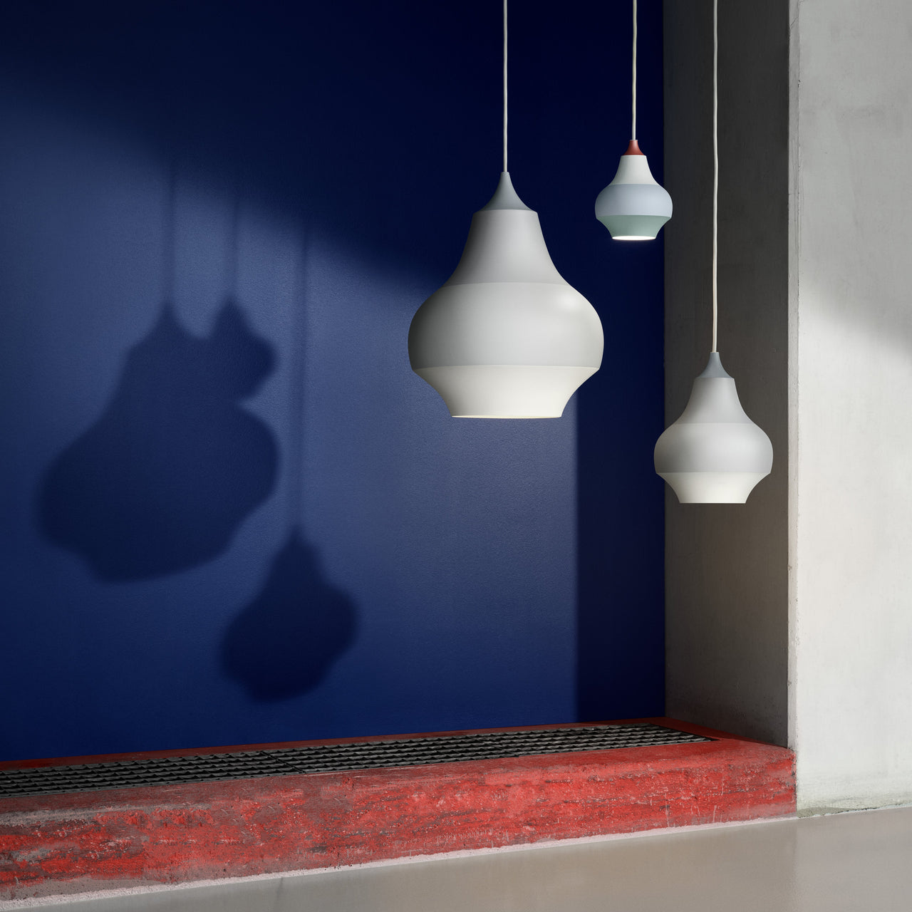 The Cirque Pendant draws inspiration from the lively atmosphere of Copenhagen's Tivoli Gardens. Its playful design reflects the colors and motion of balloons, carousels, and spinning objects. The distinct bands of color create a continuous effect, much like colors in circular motion. The shape of the pendant is reminiscent of the onion-shaped domes found on some of Tivoli's buildings, further enhancing its whimsical character. Available in various color combinations and sizes.
