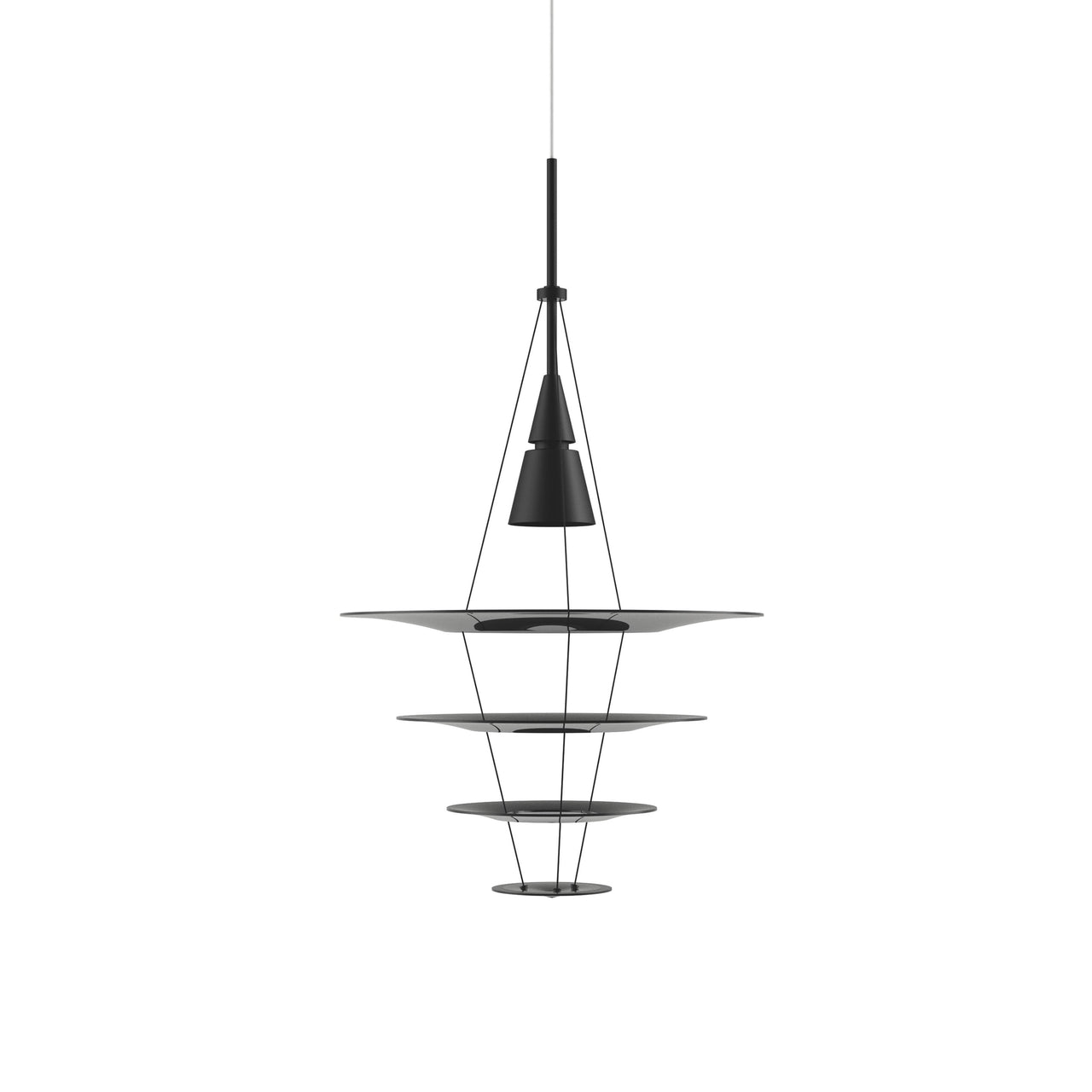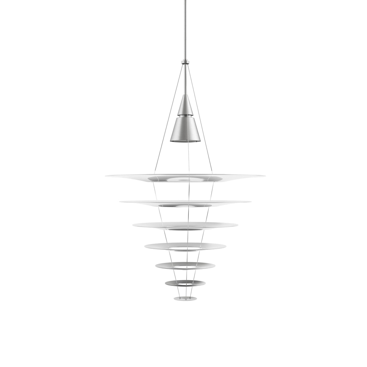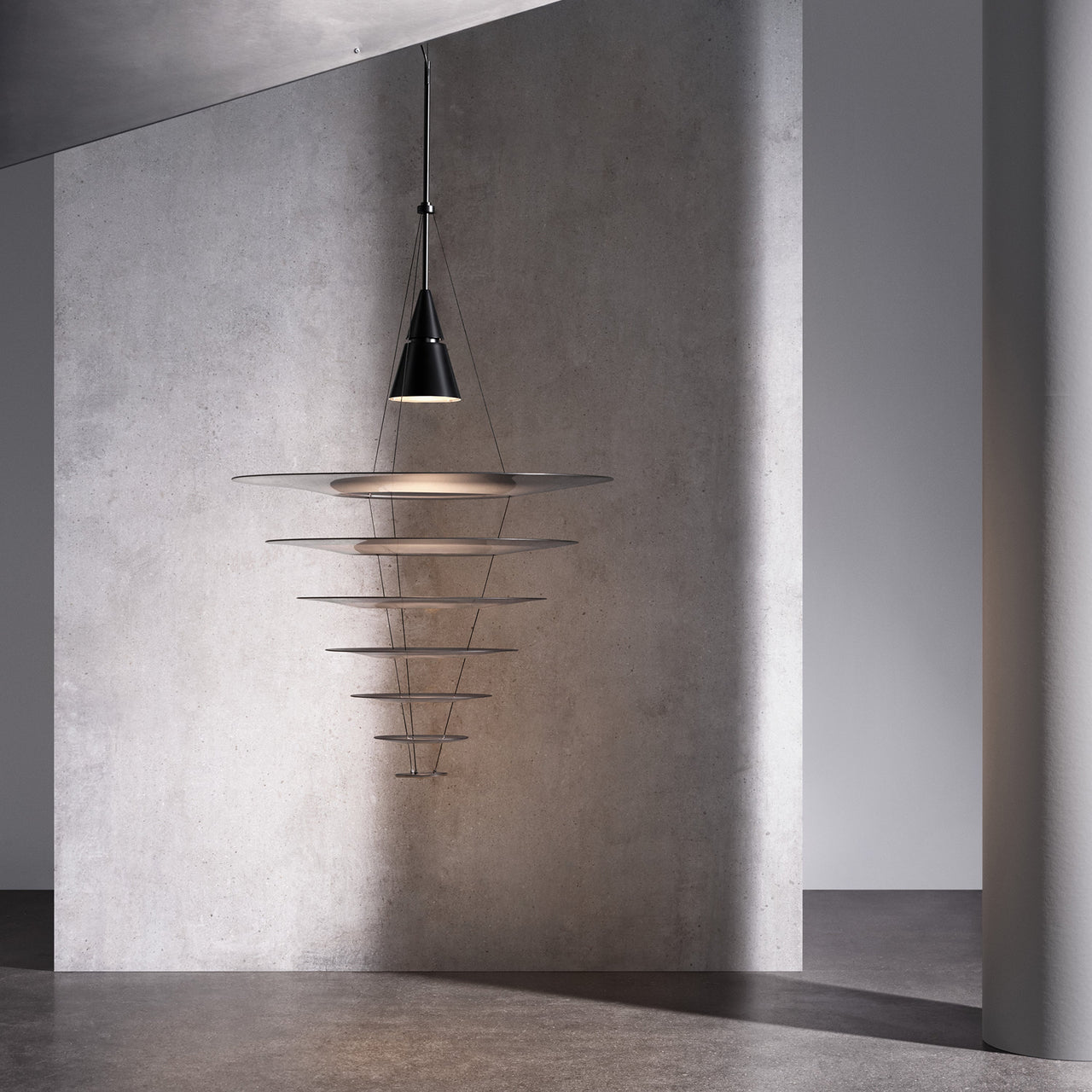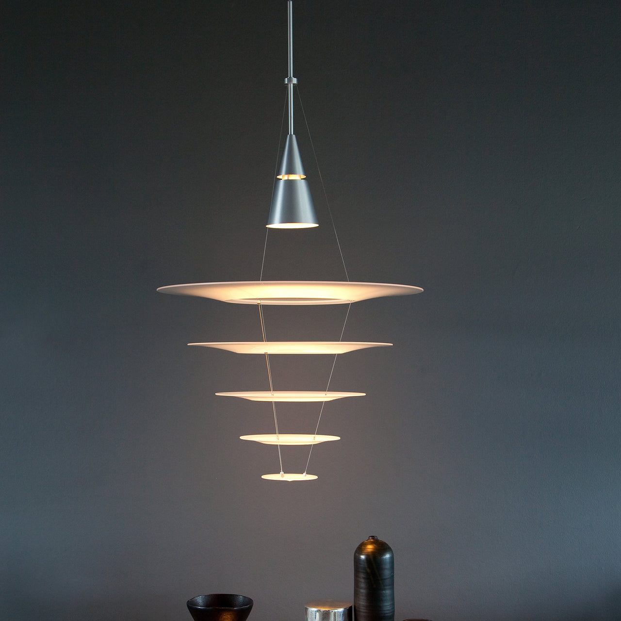 Living up to its name as the pendant’s multiple shades appear to float when viewed illuminated from a distance, Enigma by Japanese designer Shoichi Uchiyama is actually held by ultra-thin wires. In 3 sizes, the fixture comes in a silvery aluminum version or black, creating a serene visual and atmospheric effect as it shapes and channels light.
