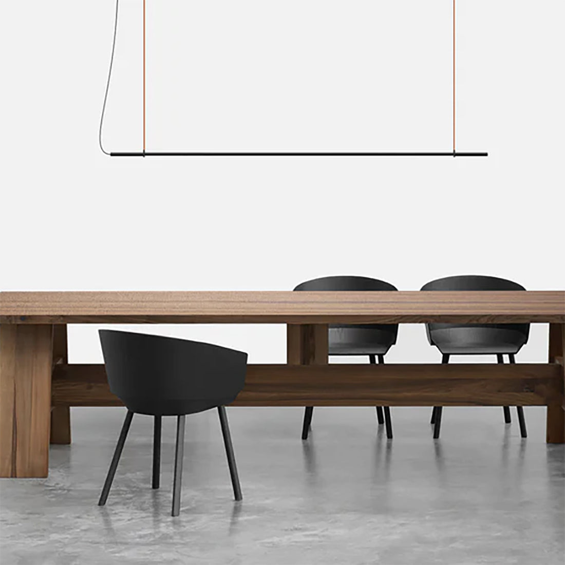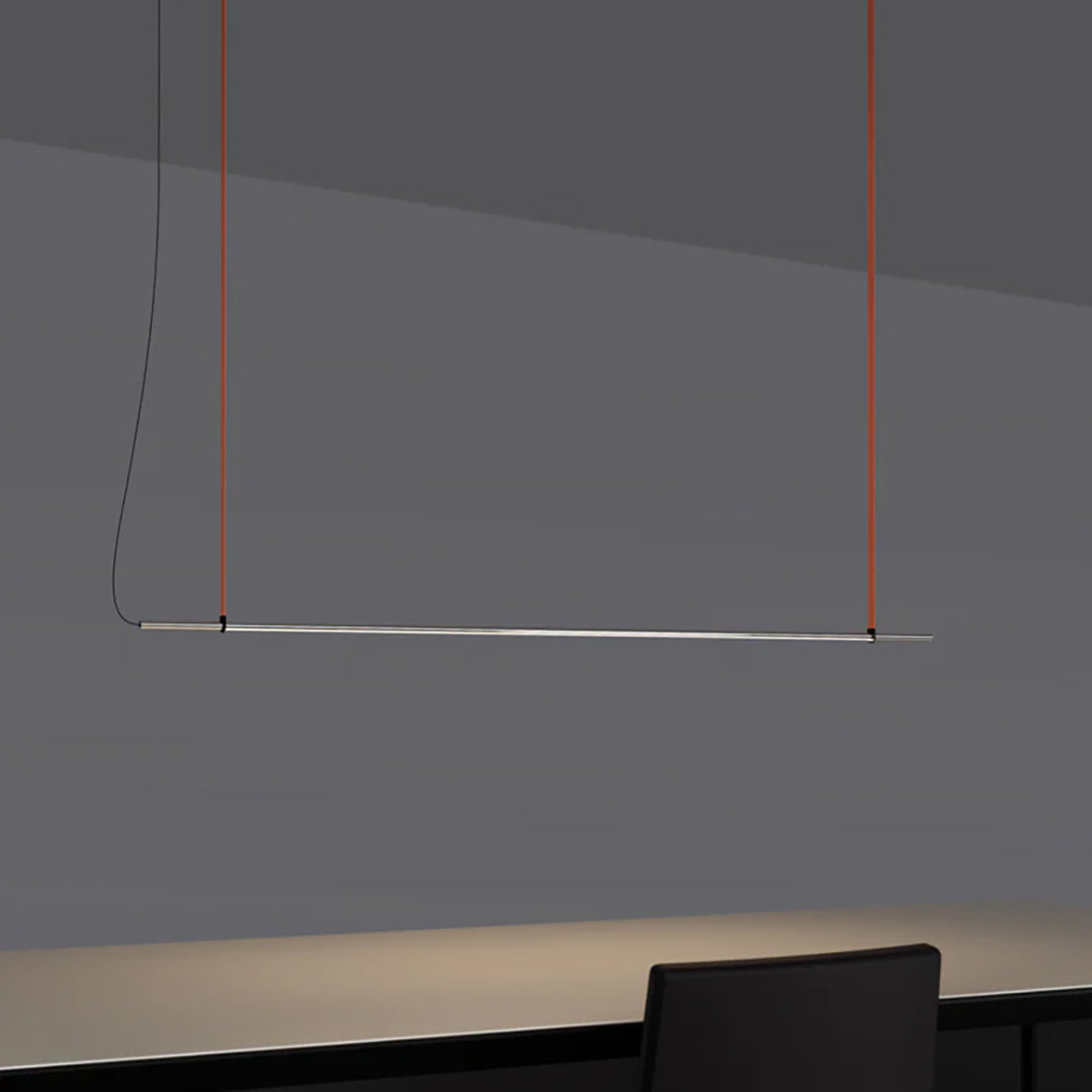 T.O features an elegant wand of light suspended by woven nylon strips that allow for full 360 degree directional rotation. Milan designer Carmine Deganello’s system features push-button dim control at the end of the arm and additional stack configurations that provide both direct and indirect lighting simultaneously. Choose from polished chrome, matte black and matte grey to pair with the hanging belts in varied hues including a snappy burnt orange.