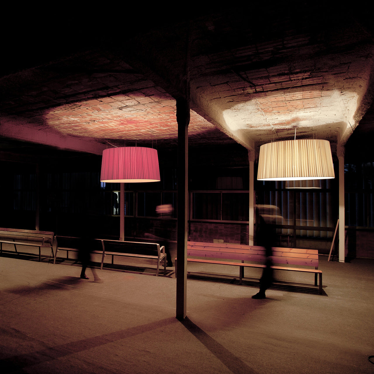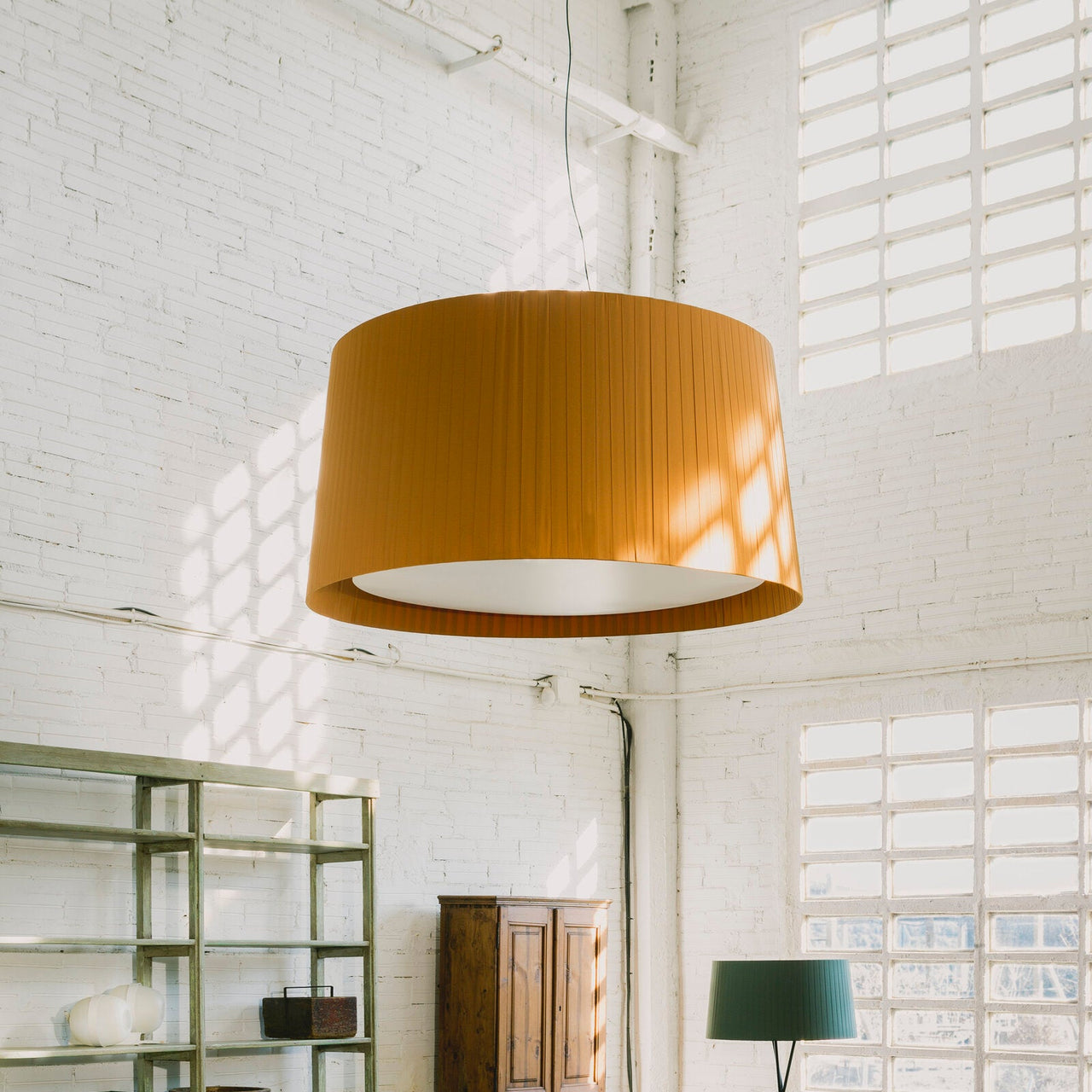 For larger-scale environs, Santa & Cole offers a colossal take on its signature pendant with a ribboned shade. A translucent disc within conceals a powerful integrated LED light source that evenly diffuses the fully dimmable illumination. Each lampshade is handmade, in standard hues of natural white, red and black or a range devised with Dutch studio Raw Color in terracotta, mustard yellow and forest green. With the light on, the lamp provides a warm light, rich in nuances; when off, it's a sculptural statement piece.