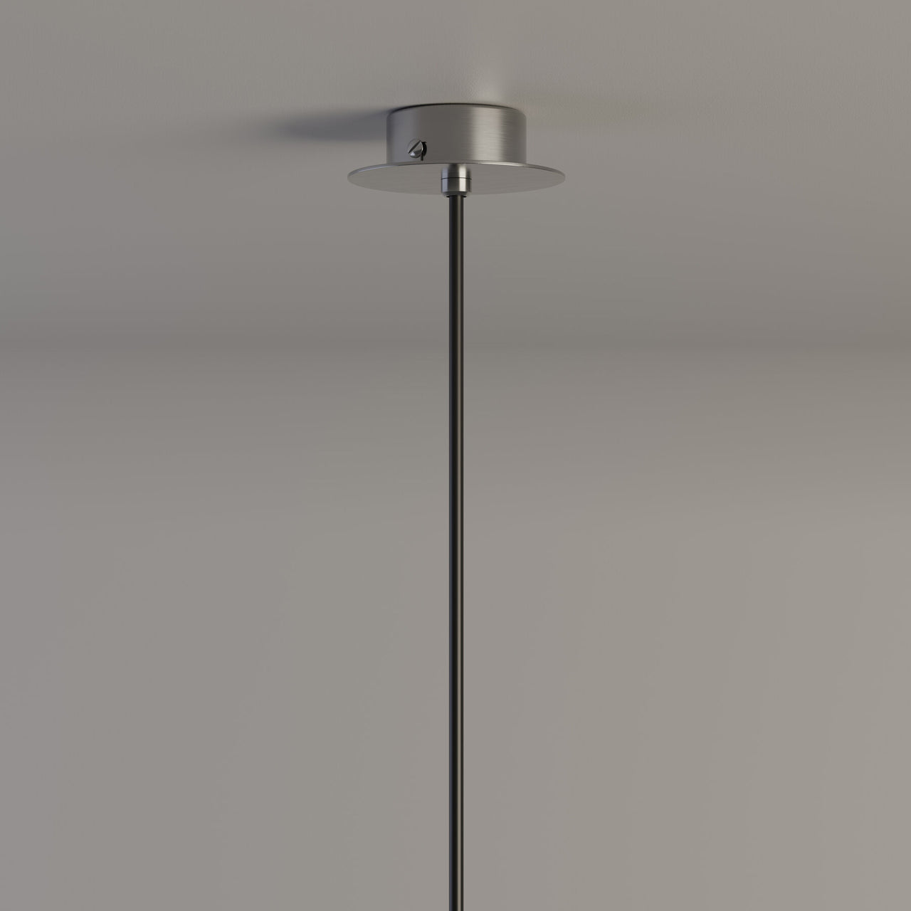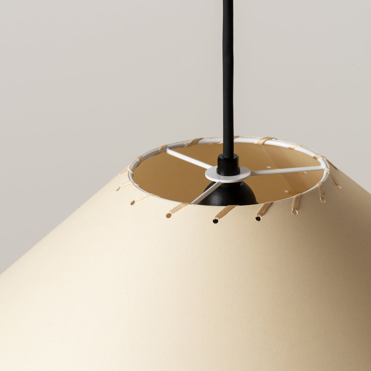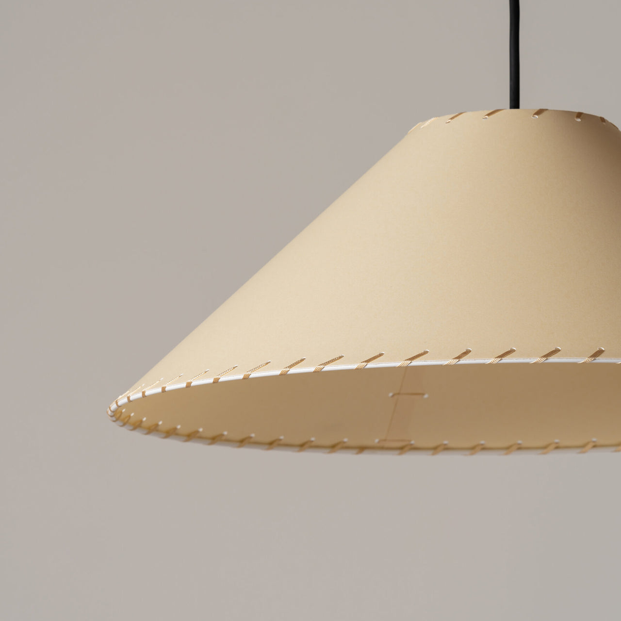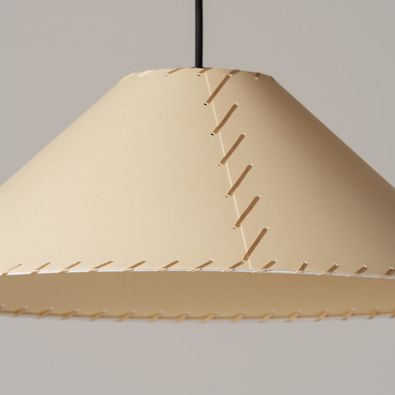 Designed by Gabriel Ordeig Cole, this pendant brings an inviting warmth to interiors through its classic flat conical silhouette. Available in beige or white stitched parchment, the lampshade softly diffuses light, creating a cozy ambiance ideal for dining and social spaces. This pendant features a satin nickel or textured black canopy, with an adjustable cable for flexible installation.