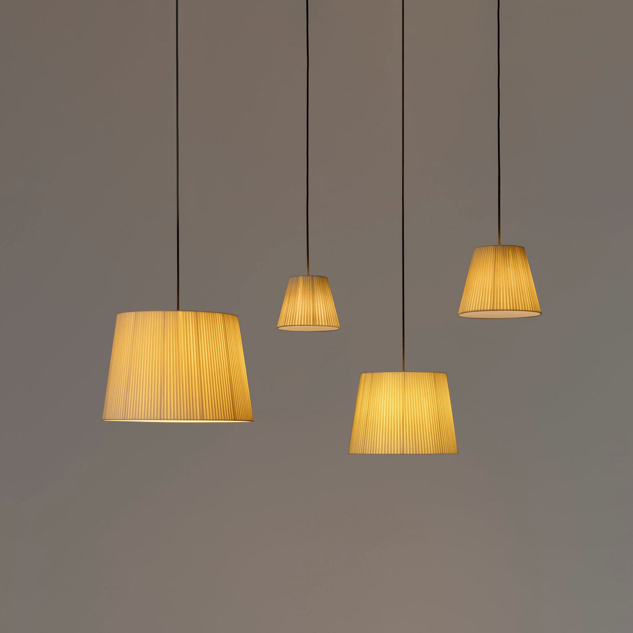 Santa & Cole's distinctive series of Sísísí pendant lights includes this diminutive version for lighting smaller areas. It features a cone-shaped shade in a choice of stitched beige parchment or the Barcelona maker's signature hand-finished ribbon in natural or a range of accent hues for a pop of color. The fixture offers a choice of ceiling canopies and a hanging cable in black or white to make its warm LED utility compatible with any space.