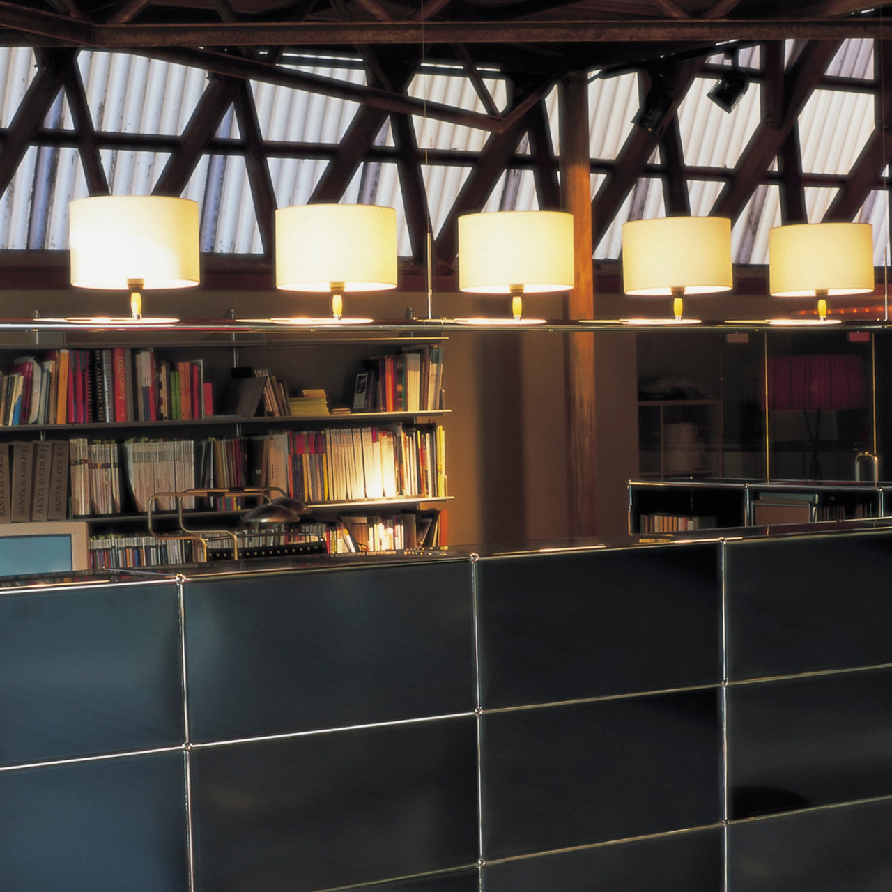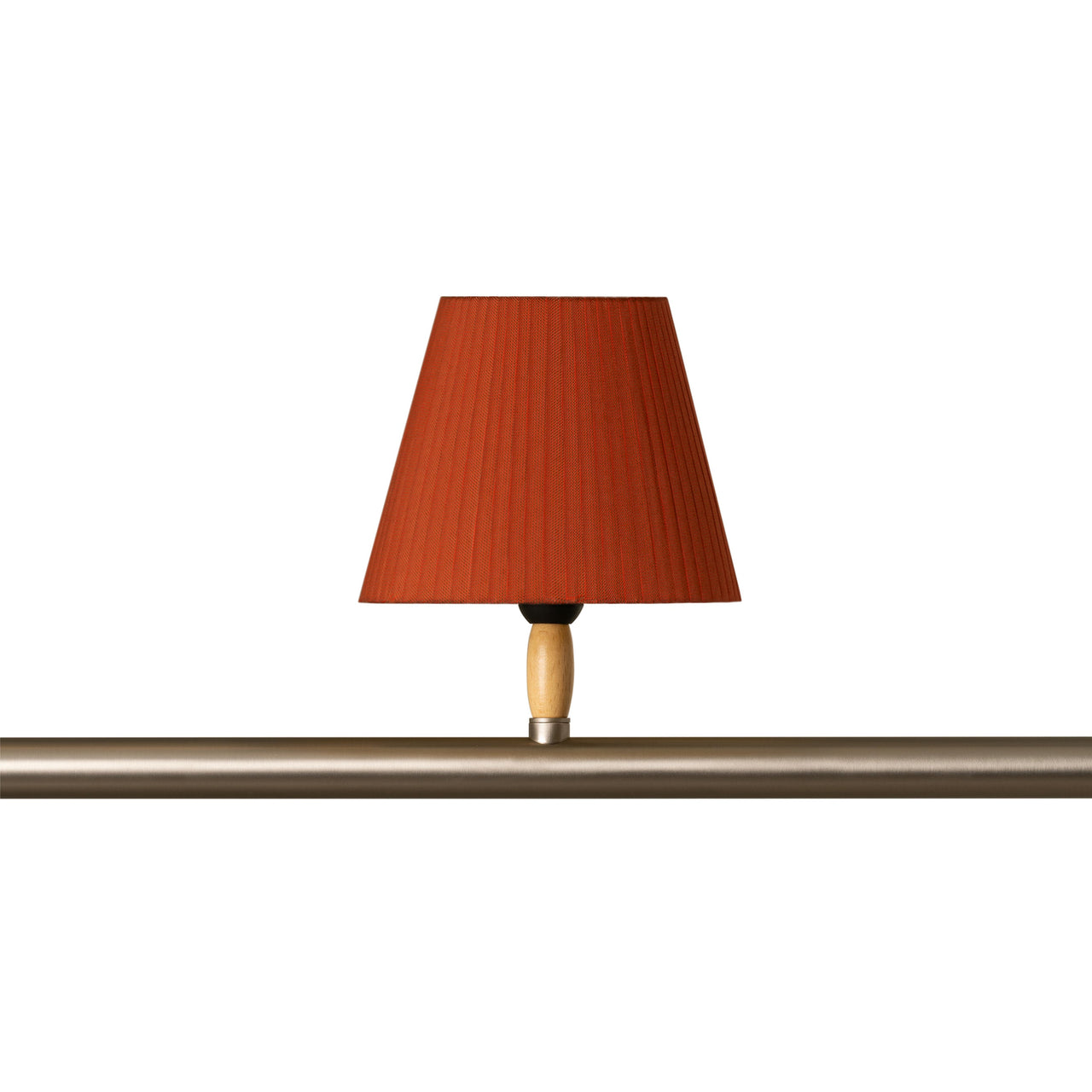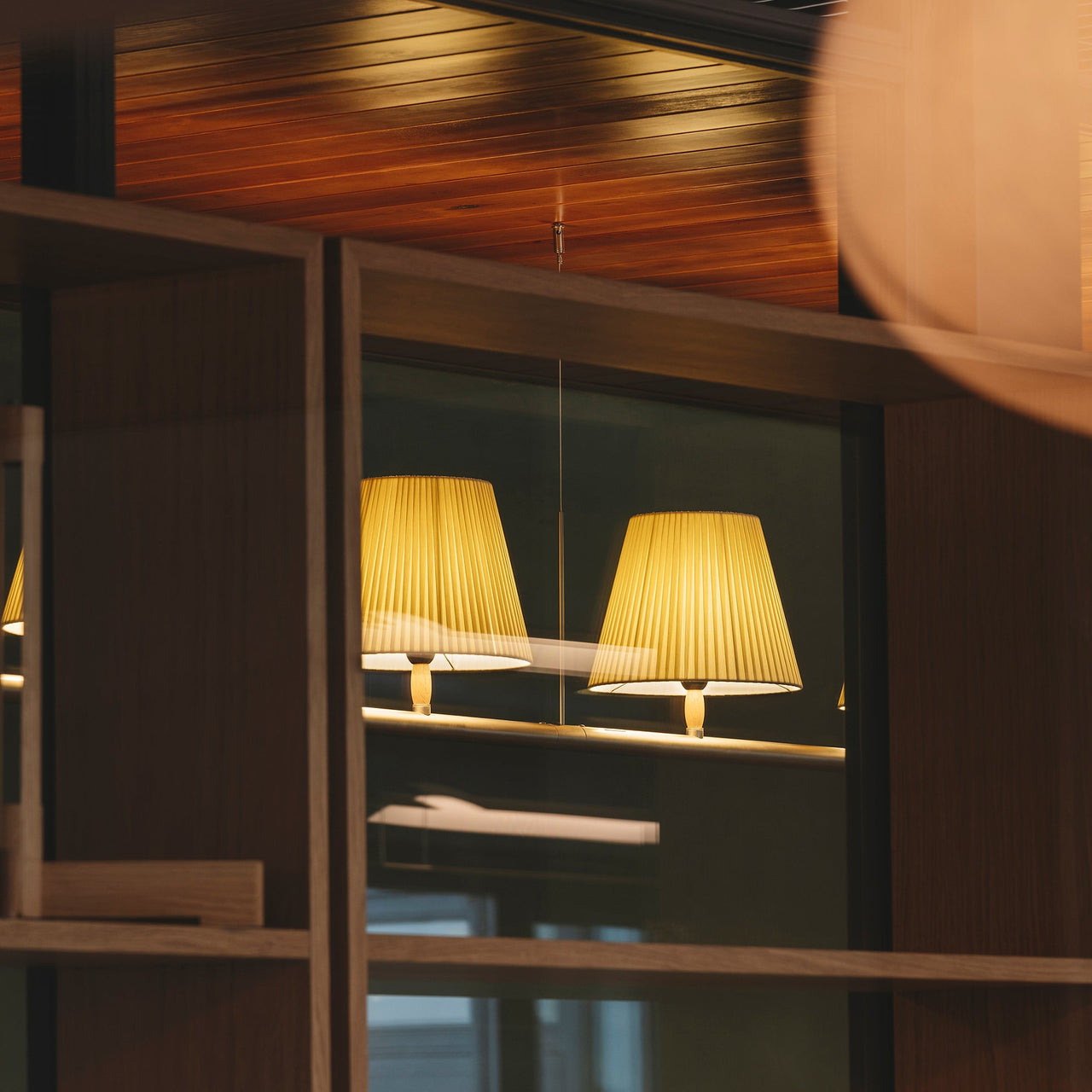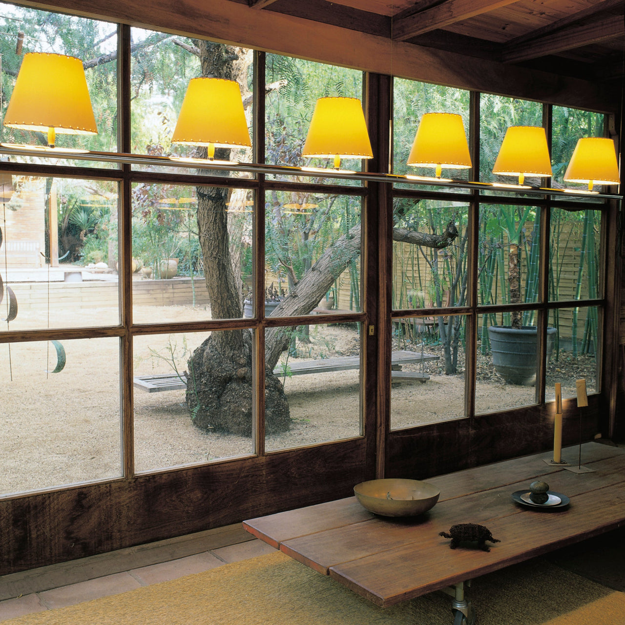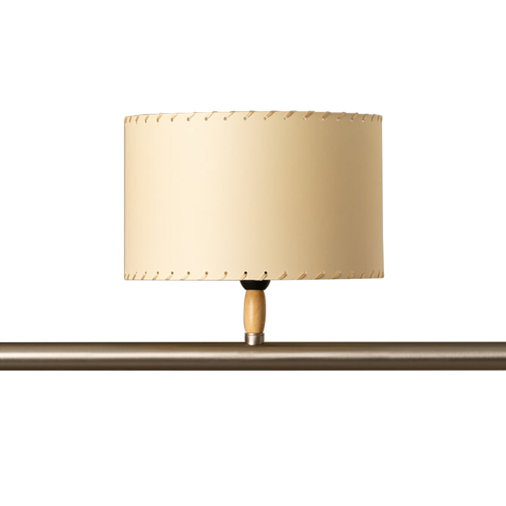 The Sistema Fonda Pendant Lamp, designed by Gabriel Ordeig, was created to bring ambient, elegant lighting to dining environments. This modular system consists of linear tubular structures that support small or medium lampshades, available in parchment, ribbon, or white linen, all framed with natural beech wood accents. Each pendant can be customized with configurations of one or three shades, arranged to fit a space’s aesthetic needs.The Sistema Fonda provides warm, consistent light, ideal for creating a welcoming atmosphere in residential or hospitality settings.