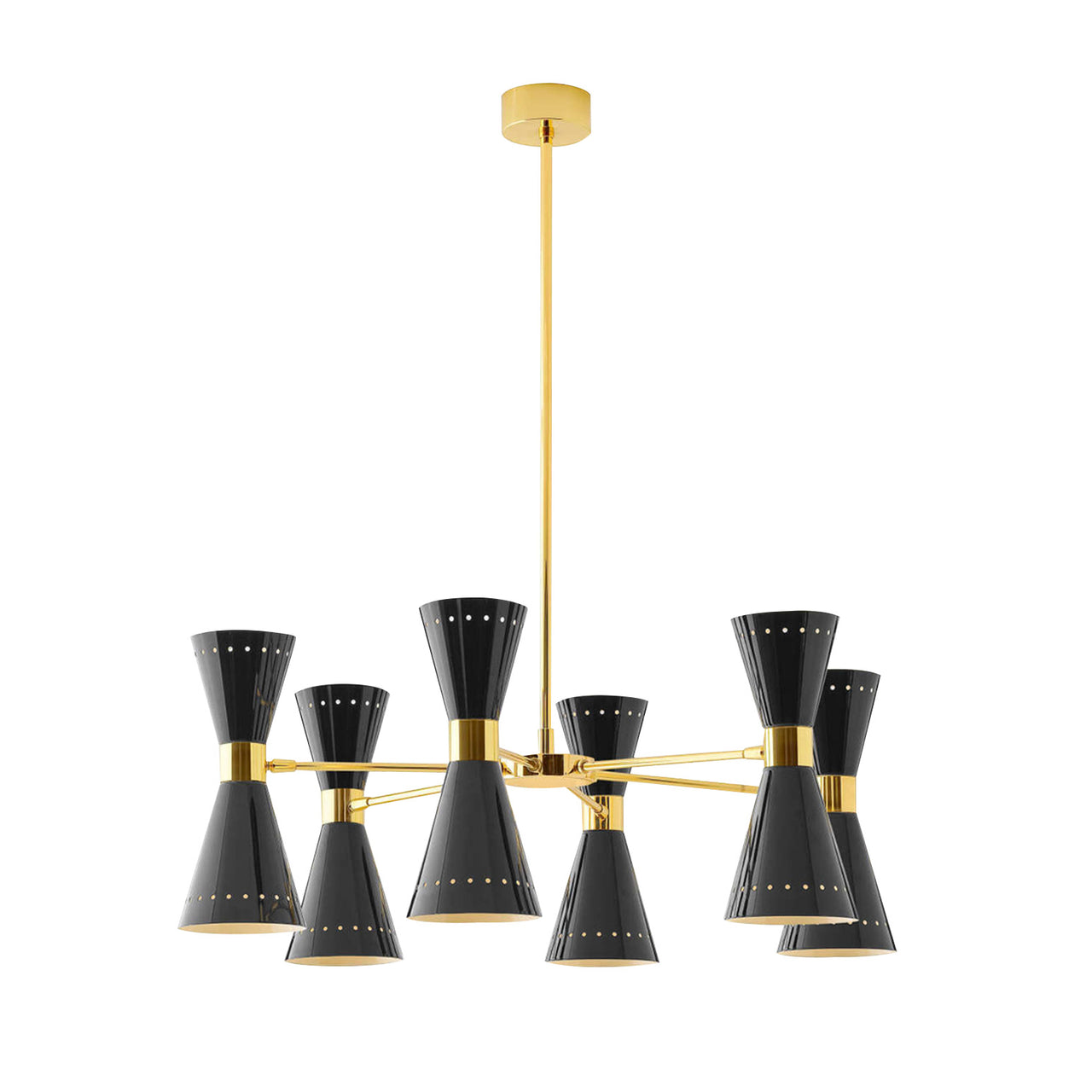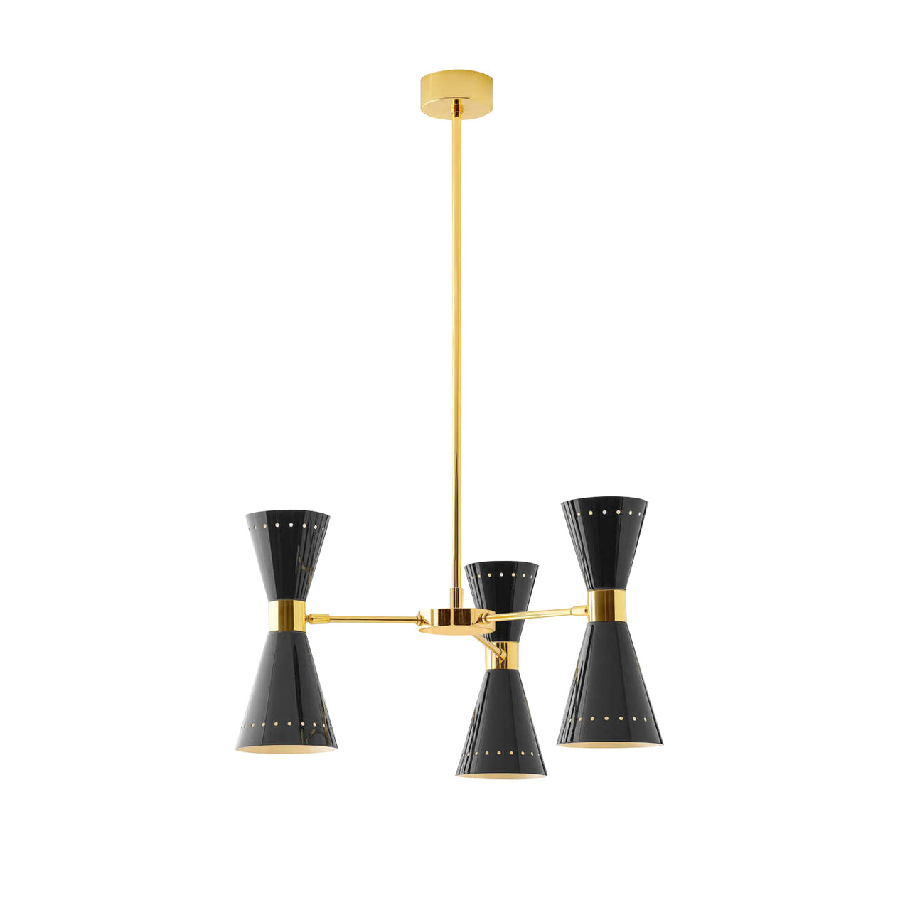 The Megafono Suspension Lamp by Stilnovo is a 1950s design offering both direct and indirect light. Available with three, six, or eight arms, it features a brass structure with galvanic gilding and directable double-cone lampshades in ivory or glossy black.