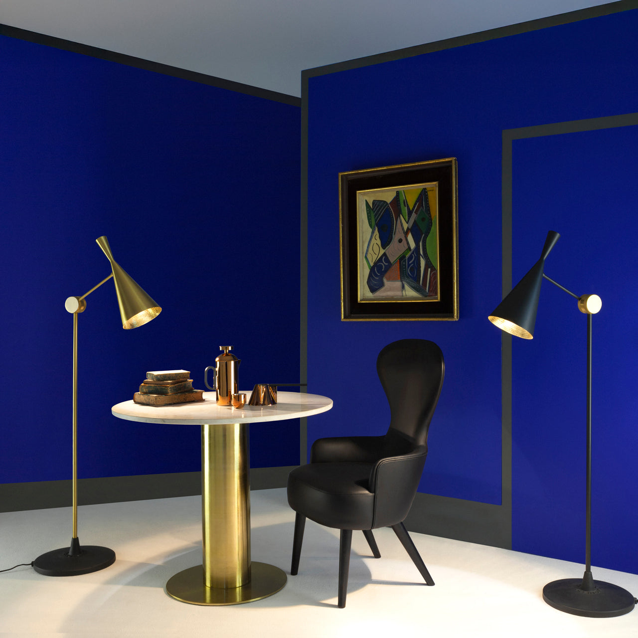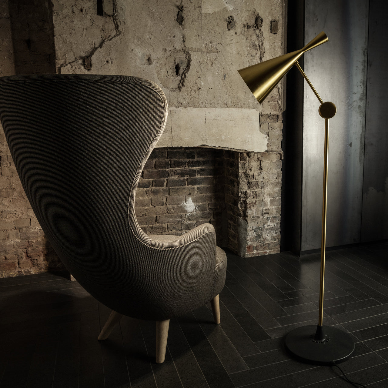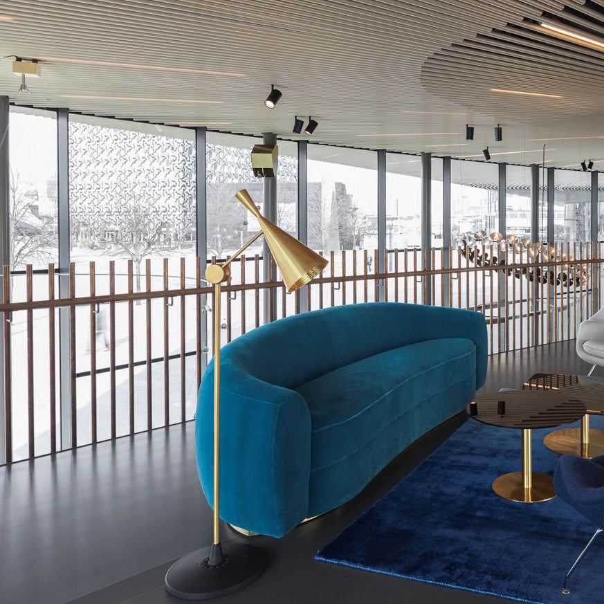 This splendid floor lamp is adapted from Tom Dixon's modern-classic Beat lighting collection. Inspired by the sculptural simplicity of traditional water vessels, the series is distinguished by its beaten and brushed brass shade, perpetuating the skills of artisan craftsmen in Northern India. Yet the designer bespeaks today with his stylishly functional silhouette for the refraction of golden light.