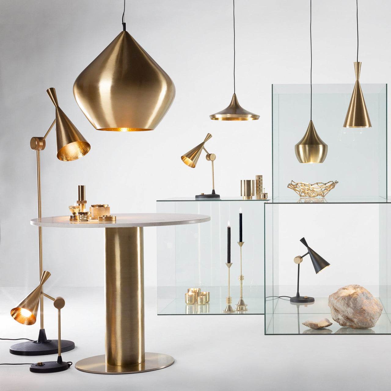 Beat Stout throws a attractive curve into British designer Tom Dixon's lineup of pendant lights. Originally conceived during a field trip to India with his Royal College of Art students, the shapes are based on traditional brass cooking pots and water vessels. Using the same time-honored techniques, the lamps are spun and hand-beaten by skilled craftsmen from Moradabad in Northern India. But the technology is pure 21st Century, utilizing an LED light source. The firm Tom Dixon, established in 2002 by the renowned designer and his partner David Begg, encompasses everything from chairs to fragrance as well as a deep dive into lighting. Tom has been recognized with OBE honors and his work sits in museums across the globe including London's Victoria and Albert, New York's Museum of Modern Art and Paris' Centre Georges Pompidou.