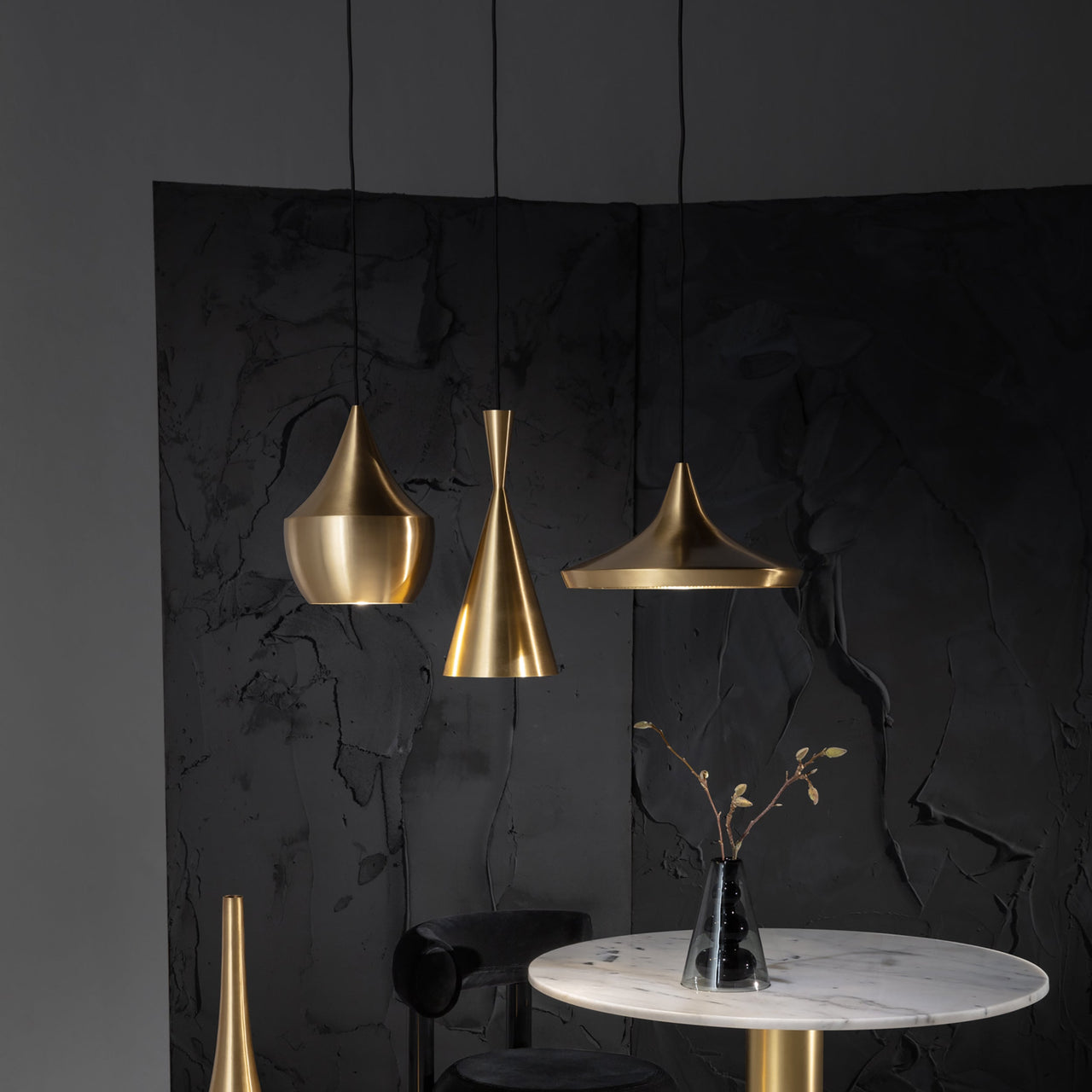 Beat is an extraordinary round chandelier featuring Tall, Fat and Wide pendants in a brass finish which complements the warm, golden interior. Hand-spun by artisan craftsmen in Northern India, each light takes four days to complete and bears the mark of its maker. Tom Dixon’s integrated LED modules offer longer life expectancy, energy efficiency and improved performance (including dimmability) and they are fully serviceable, with replacement components and individual drivers available if needed.