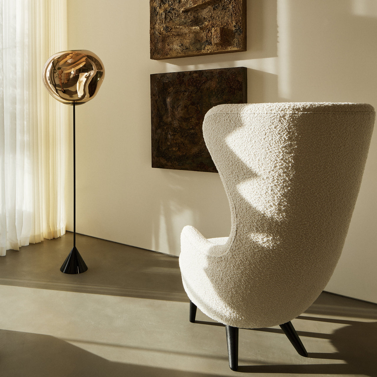 Brit Tom Dixon literally broke the mold with Melt, his vacuum-formed lighting design. His metallic "blob" shines as a floor lamp, a monumental mirrored orb perched on a reedy stand with a gloss-black finish. cone base. The distorted sphere shade comes in a choice of gold, copper, silver, or smoke finish to cast its softened glow with the designer's requisite offbeat style.