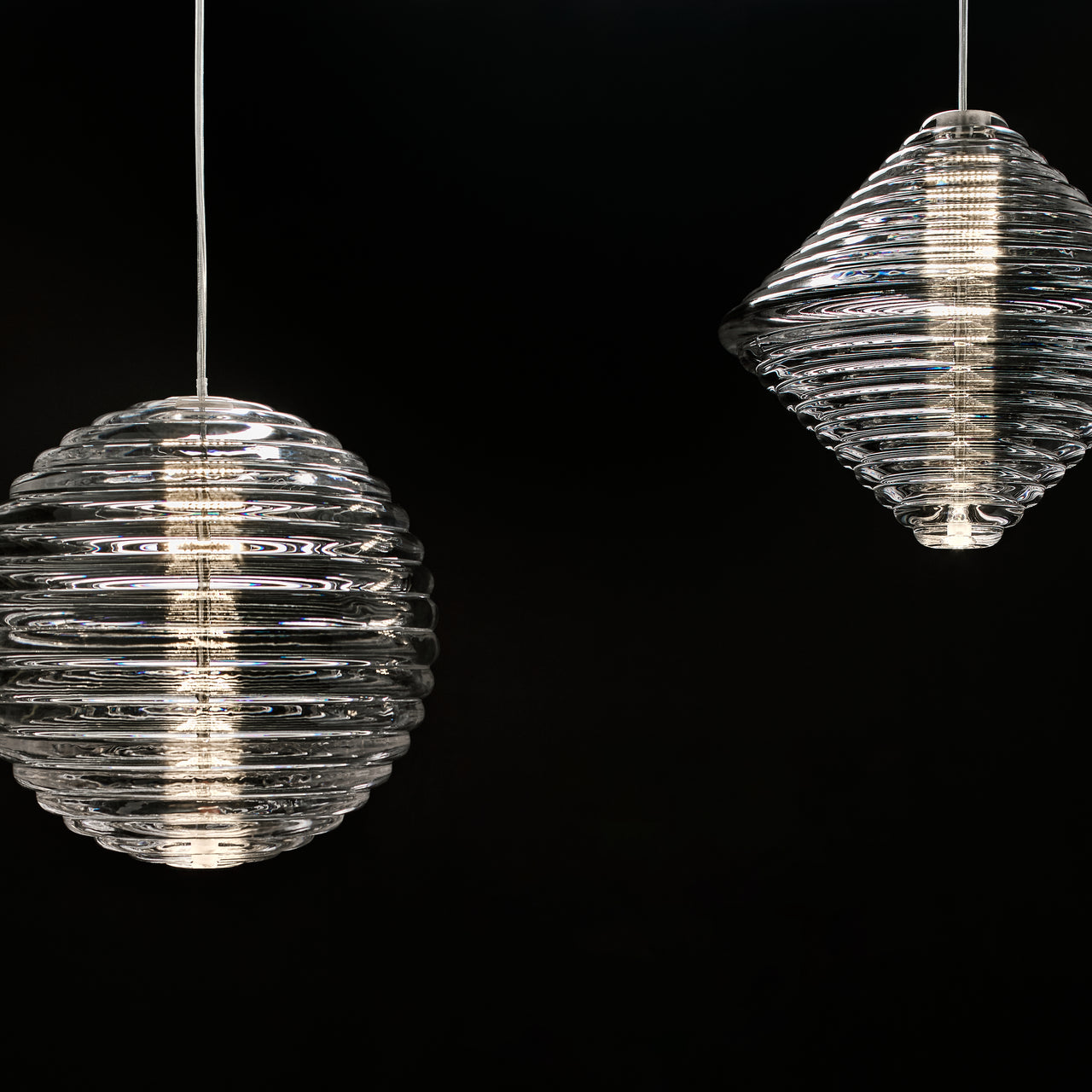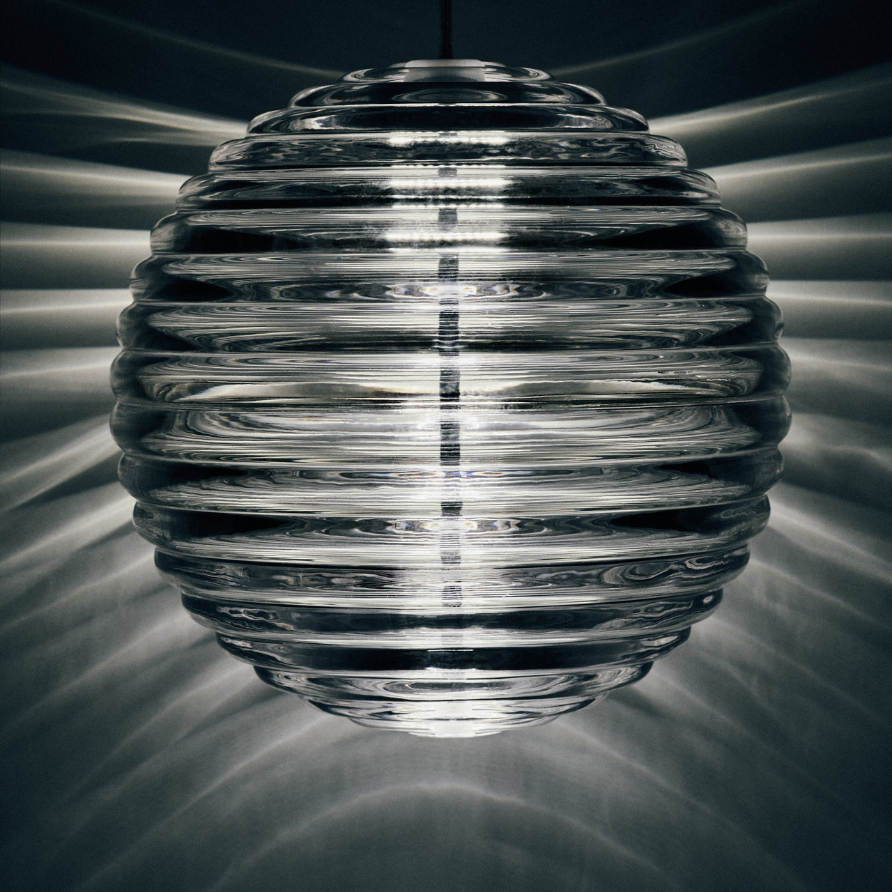In a classic globe shape, this version of Press is made from the thickest and most transparent glass with a satisfyingly coiled surface. The ribbed design then catches and refracts the illumination in stripy linear patterns. Tom Dixon’s pendant joins a family of lights made by dropping massive globs of molten glass into iron molds under tons of pressure to create the hypnotic and immensely durable result.