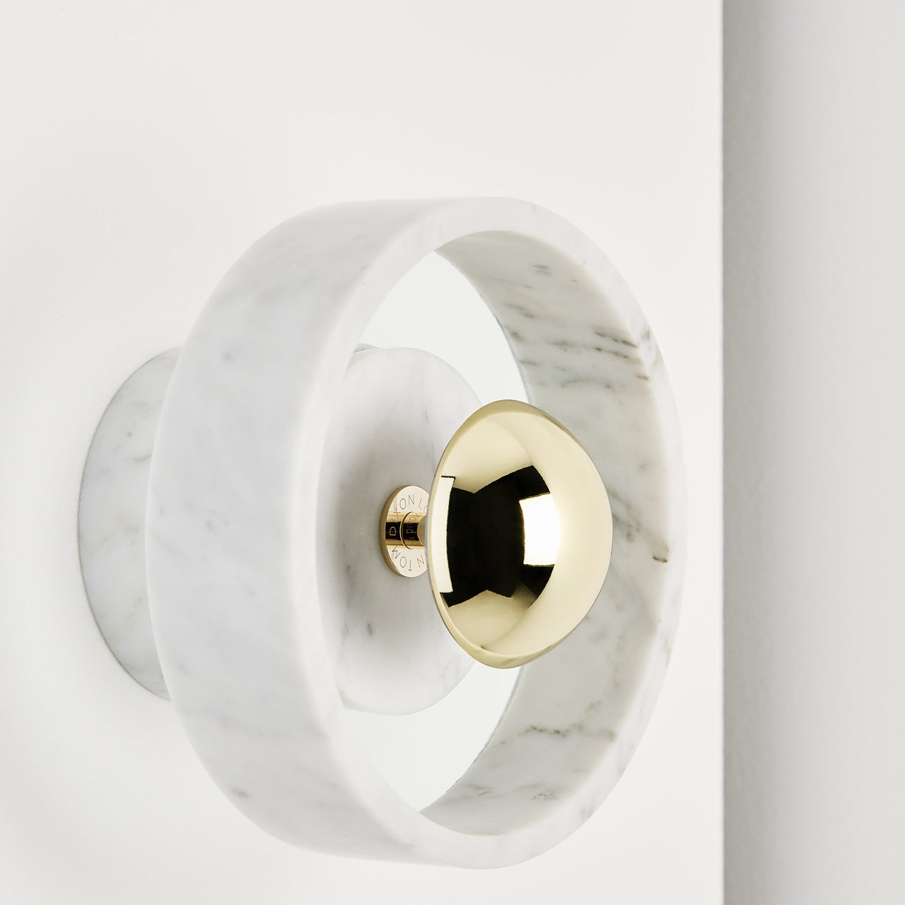 OBE-honored British design star Tom Dixon adapted Stone Wall Light from his earlier standout housewares. With its Morwad marble "halo" mounted on a glass plate, the steel-tipped bulb appears to float in the center. Cut to the thinnest possible depth, the semi-translucent stone reveals its patterned surface while also casting circular reflections on the wall behind. Steel-capped bulb sold separately.
