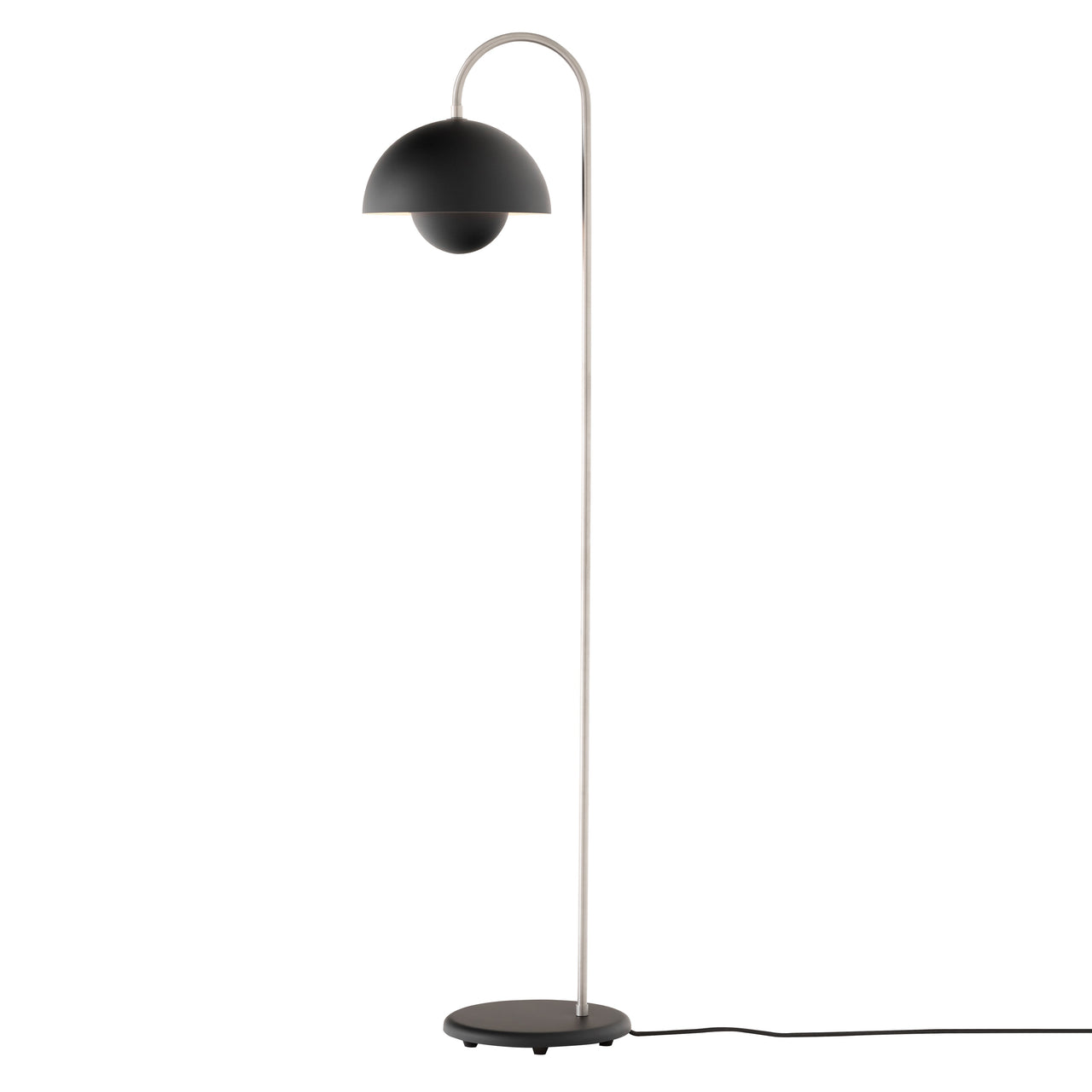 The Flowerpot VP12 Floor Lamp by &Tradition continues Verner Panton’s iconic Flowerpot series, first introduced in the late 1960s. It showcases a unique design featuring two hemispheres facing each other, casting a soft, downward light. The base reflects the spherical shape of the shade, creating a unified and sculptural look. With its sleek and compact form, the lamp is ideal for placement beside armchairs, sofas, or desks. It is made from lacquered steel and includes a fabric-covered cord and is available in matte black, chrome, cobalt blue, and beige. The E27 bulb base supports LED lighting and features a dimmable function for adjustable ambiance.