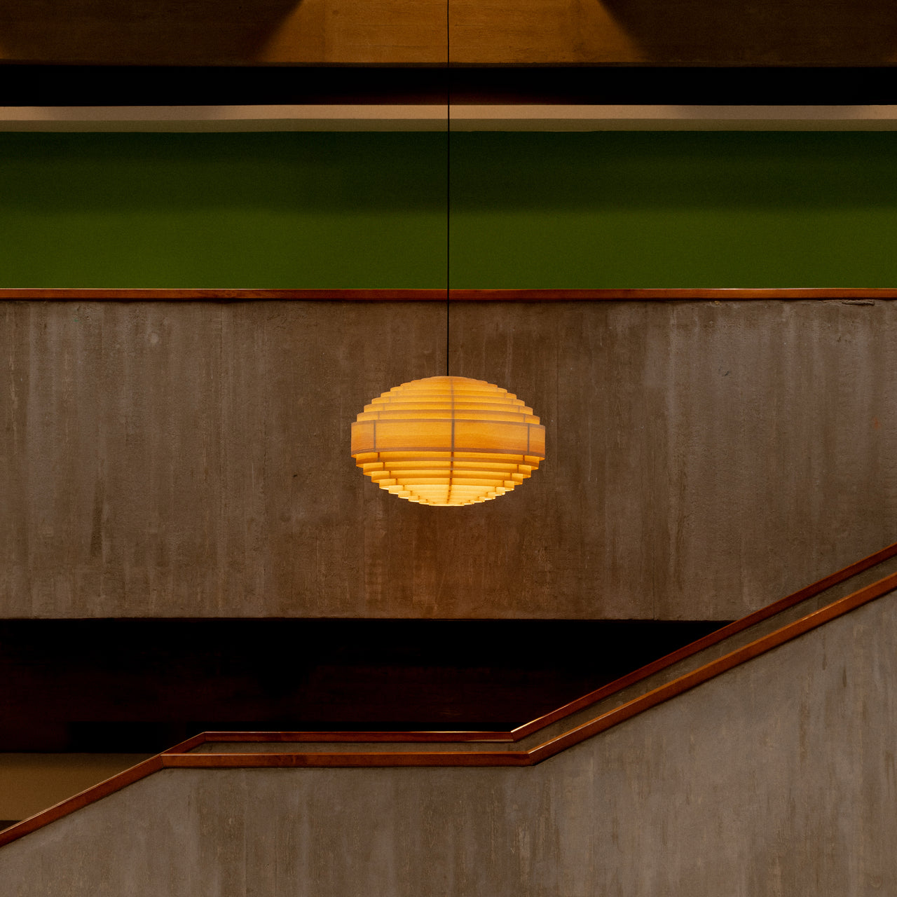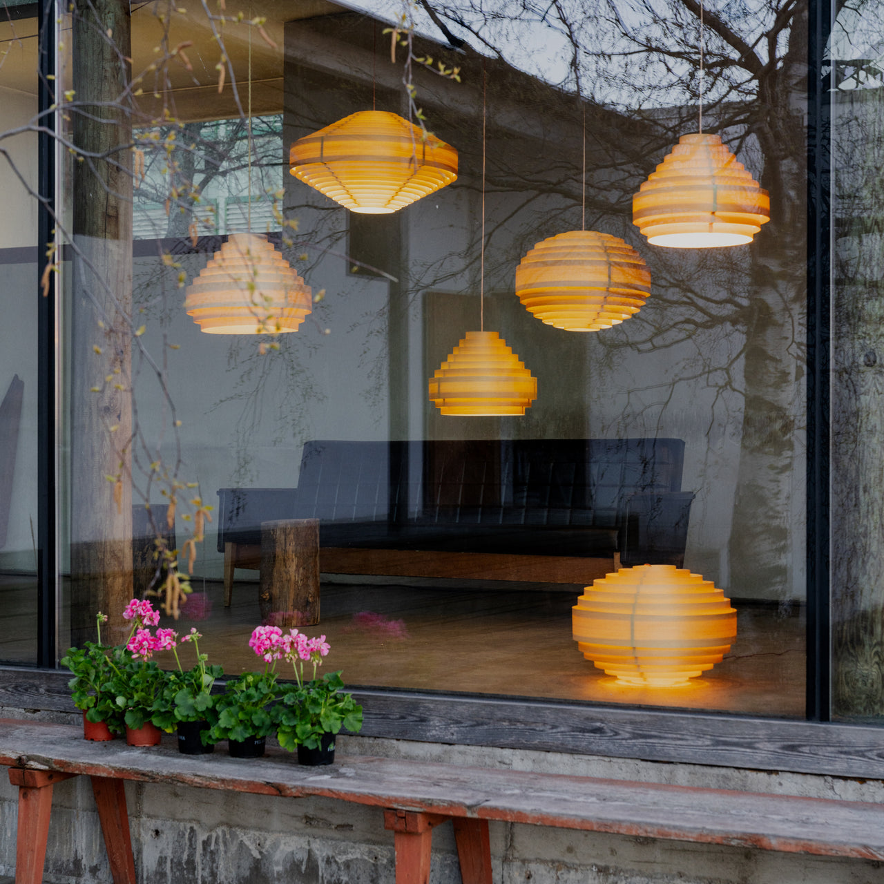 The sculptural lighting piece features concentric strips of high-quality pine veneer supported by a solid Finnish pine internal structure. The veneer gently filters light, creating a warm, ambient glow. Each pendant is handcrafted from natural materials, resulting in subtle variations in the wood grain that make every piece one-of-a-kind. Over time, the pine’s color matures, shifting from lighter shades to a rich honey hue due to the natural oils and resins in the wood. This transformation enhances the lamp's dynamic presence in any space, emphasizing its connection to natural materials.