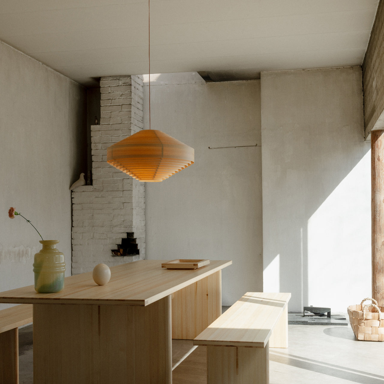 The Pendant is a bold lighting fixture characterized by its graphic cone shape. Vaarnii has reimagined this iconic design using Finnish pine, which produces a distinctive natural glow when illuminated. Each pendant is handcrafted from natural materials, resulting in subtle variations in the wood grain that make every piece one-of-a-kind. Over time, the pine’s color matures, shifting from lighter shades to a rich honey hue due to the natural oils and resins in the wood. This transformation enhances the lamp's dynamic presence in any space, emphasizing its connection to natural materials.