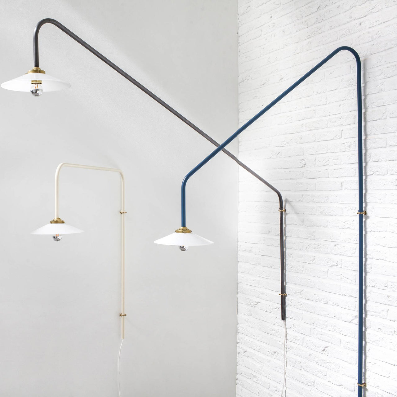 As the saying goes, necessity gave birth to Muller Van Severen's hanging lamp, here in version N°4 with an angled design. Lacking a place to plug in a light overhead in their new home, the design couple conceived a wall-mounted pendant style with the lyrical simplicity of a line drawing. Fashioned in bent tubing, the steel frame supports a reflective light bulb and a glass shade and comes in a variety of finishes from brass or black to a pop of color.