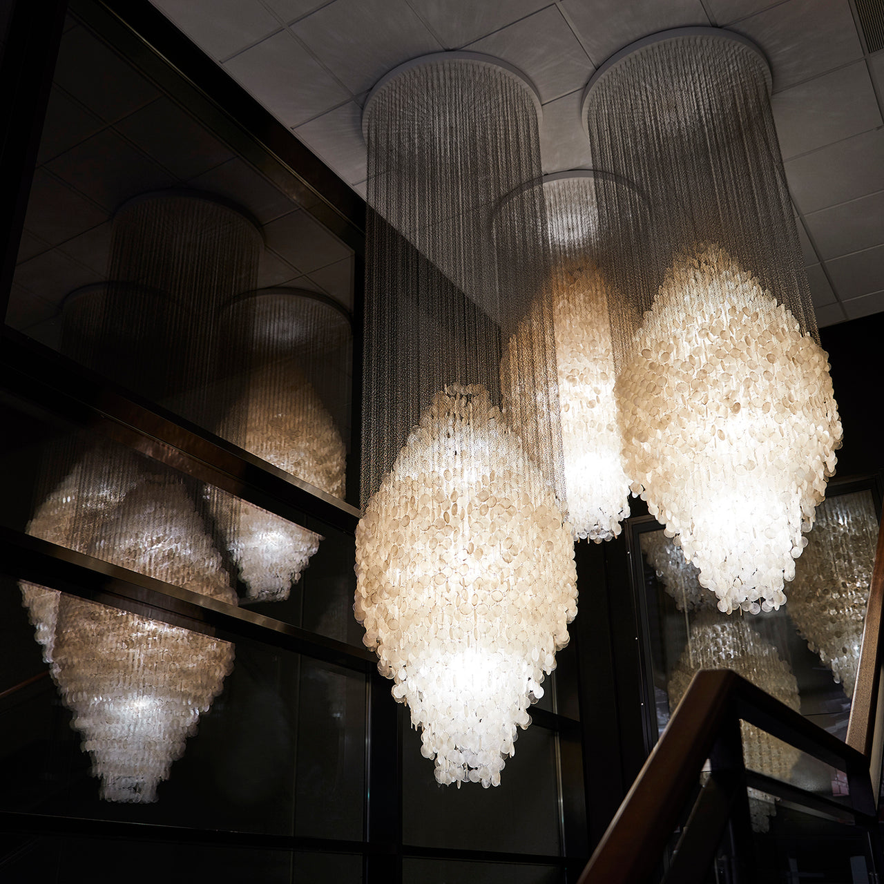 Oversized and elegantly elongated, this hanging lamp is a glimmering lodestone in any interior. Verner Panton’s original 1964 Fun design adapts as a substantial cluster of translucent seashell discs. Suspended by fine stainless-steel chain from a lacquered ceiling plate, the strands shimmer in the light and shift slightly with the breeze.