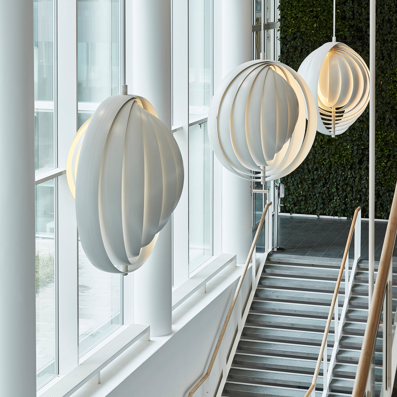Moon endures as the first light created by the Danish master Verner Panton, whose modern lamps were unlike any by his Scandinavian contemporaries. The circa 1960 pendant exhibits the changeable nature of many of his designs, with individual metal slats that can fan out to fully enclose the bulb or leave small gaps through which the light can shine. Available in a choice of sizes and in either white or bold orange lacquered metal, the light leaves an ethereal impression much like its celestial namesake.