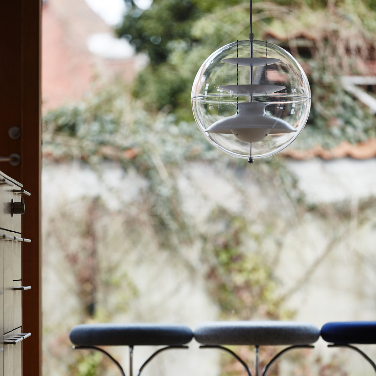 Verner Panton's awesome pendant light pairs a transparent acrylic globe with white reflector discs suspended inside by 3 steel chains. Panto, as it is called after the Danish design icon, comes in a choice of 2 sizes and radiates captivating reflections. Dating from 1977, the pendant nonetheless retains a timeless appeal that makes for an intriguing focal point in a room.