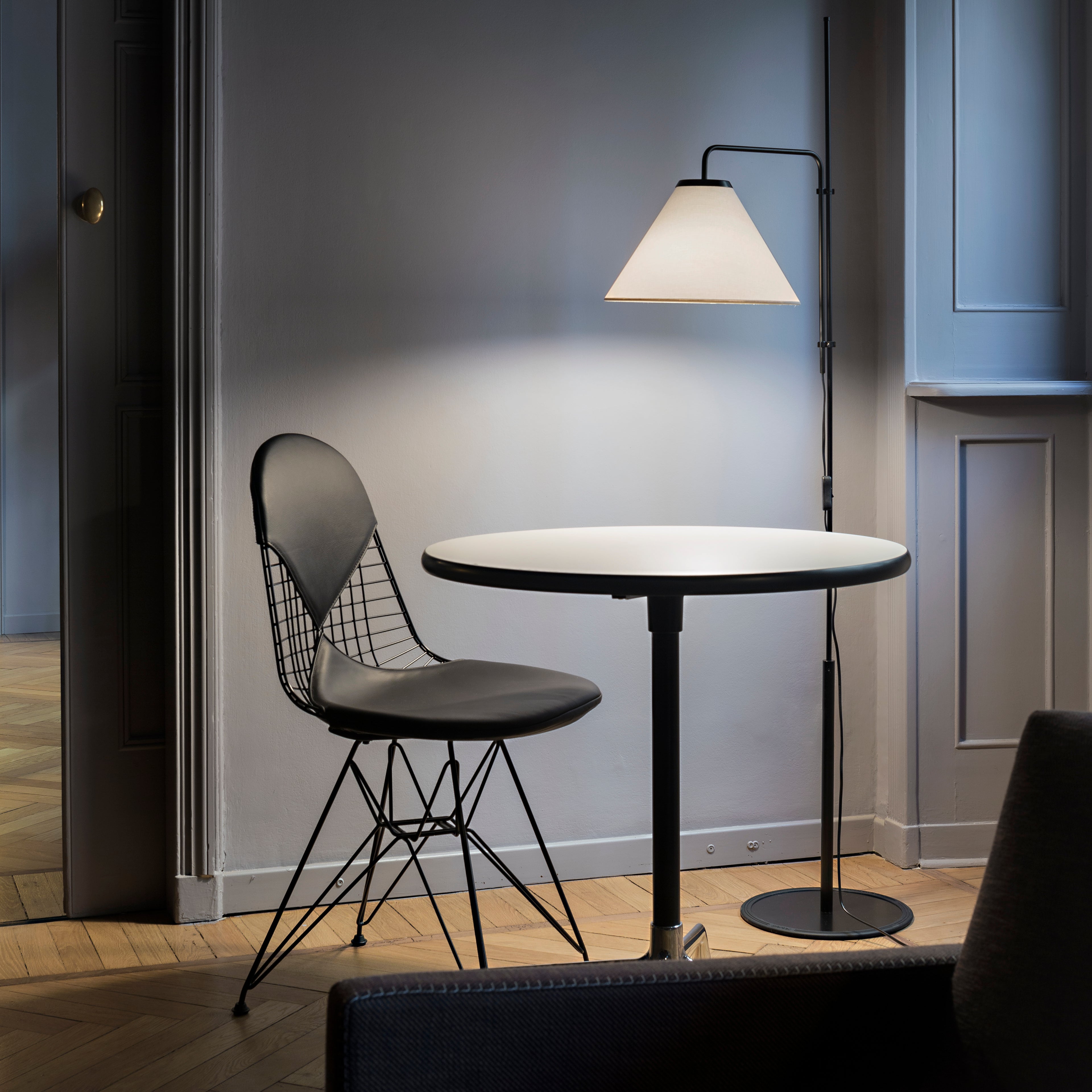 Marset nods to the longevity of its signature adjustable Funiculí in an added floor lamp, this time with a fabric shade. With its novel double-clip mechanism, the handsome black lacquered iron light can be set to the desired height —an elegantly simple tack from its original designer Lluís Porqueras. Available in sand or white, the shade can be positioned for either direct or indirect illumination and emits a brightly filtered glow.