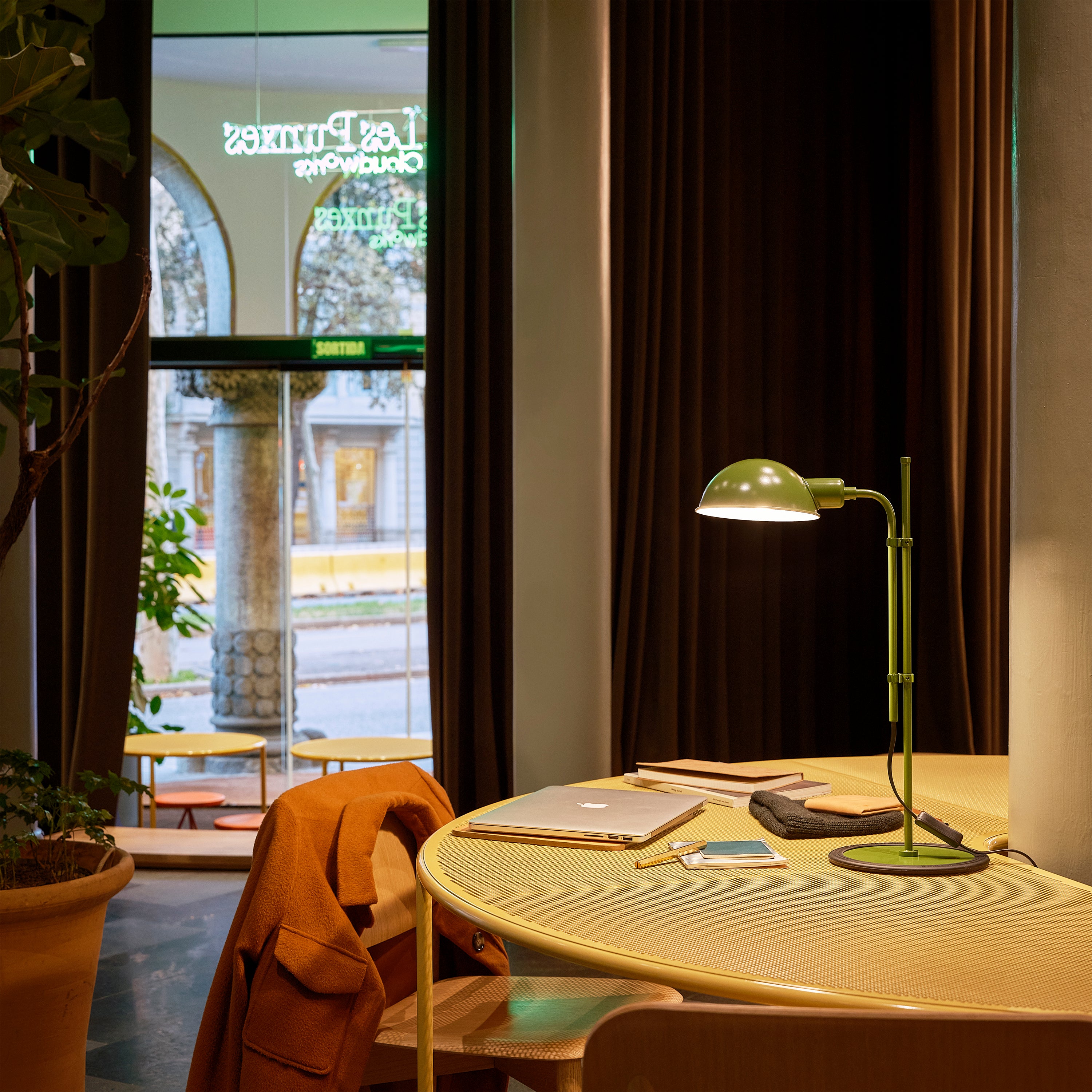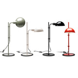 The table version of Funiculí, Spanish designer Lluís Porqueras' lamp concept that originated in 1979, expands on his notion of essential simplicity. Named for funicular up-and-down motion, the light moves similarly via a simple pair of clips. Meanwhile, the shade rotates 360 degrees to direct radiant light wherever needed, aimed downward for reading or upward for general reflected illumination. Base and stem of the lamp in lacquered iron with shade made of lacquered aluminum; a rubberized bottom adds stability to the lamp while protecting tabletops.