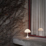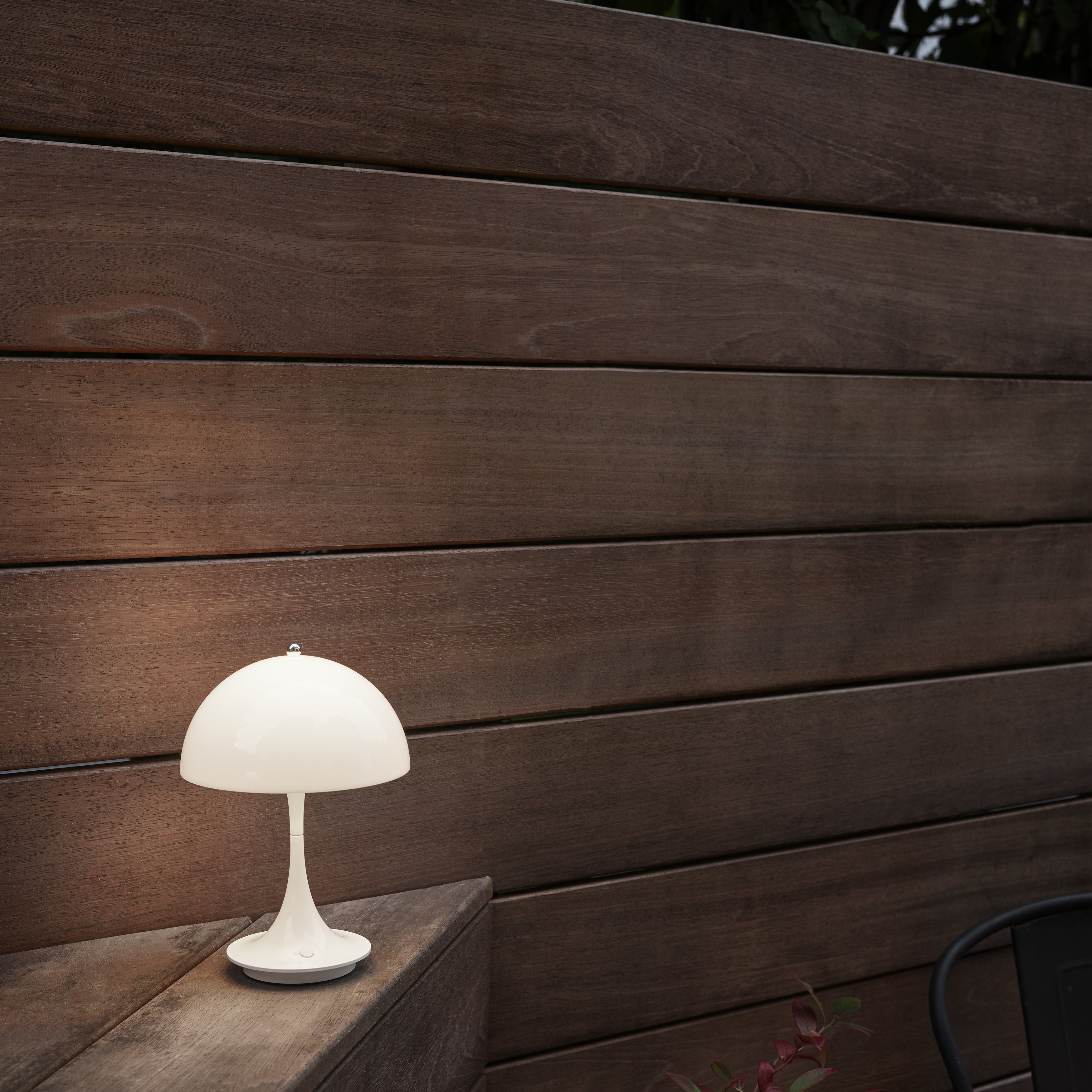 A petite version of the classic Verner Panton design, Panthella 160 Portable features a miniaturized shade that is just 6 1/2 inches in diameter for easy transport all around the house. The lamp is fitted with an integrated energy-saving LED light source and constructed with either a deep drawn steel base and die-cast aluminum shade or in opal acrylic; recharge via standard USB cable (included) for up to 5 hours of battery life.