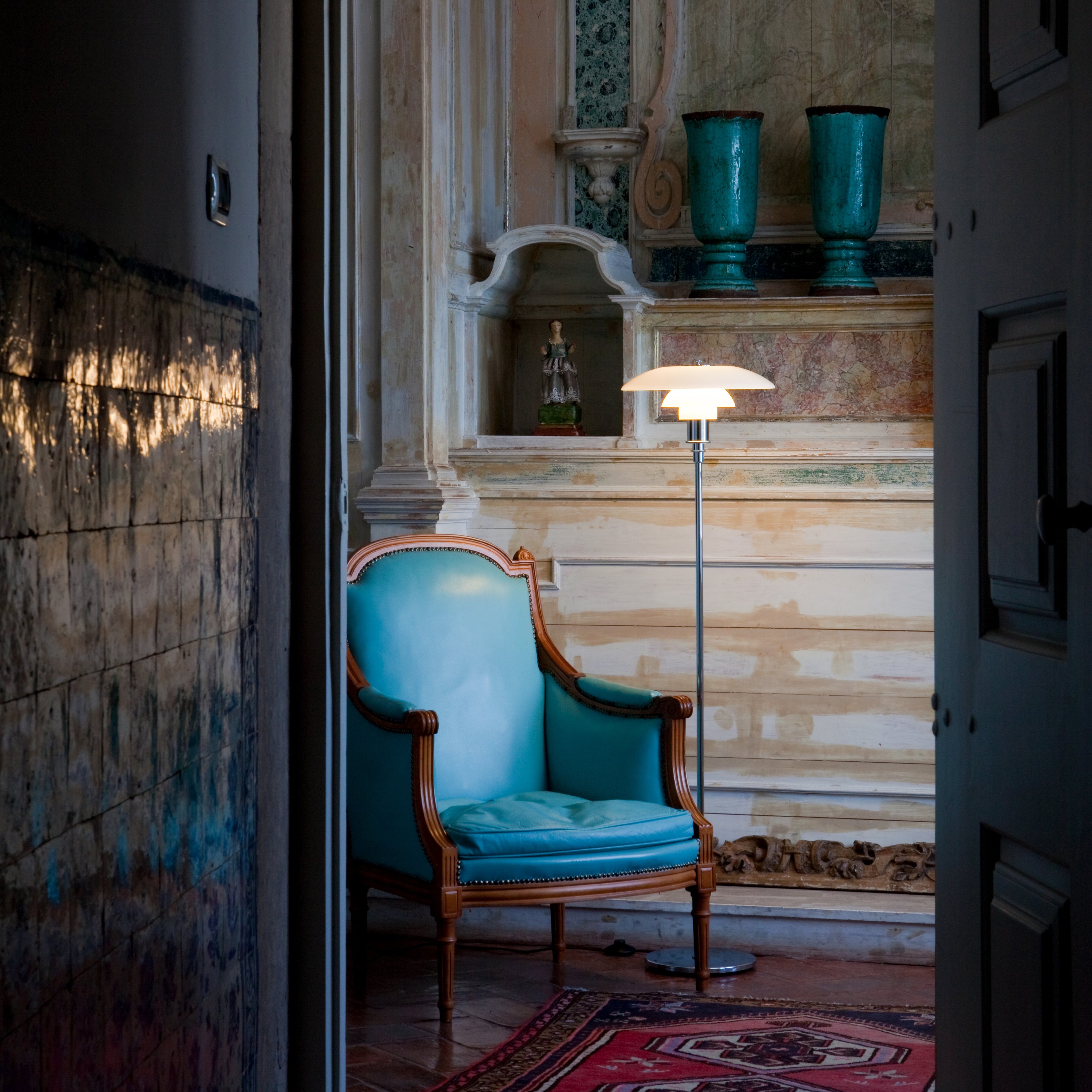 The PH 3½-2½ series adds a glass-shaded floor lamp that follows Poul Henningsen’s breakthrough triple-shade system unveiled nearly a century ago and based on a logarithmic spiral to assure glare-free illumination. The mouth-blown opal glass shades are glossy on top and sandblasted matte underneath to provide soft and uniform light distribution and the sleek metal base comes in black, brass or high-lustre chrome finishes.